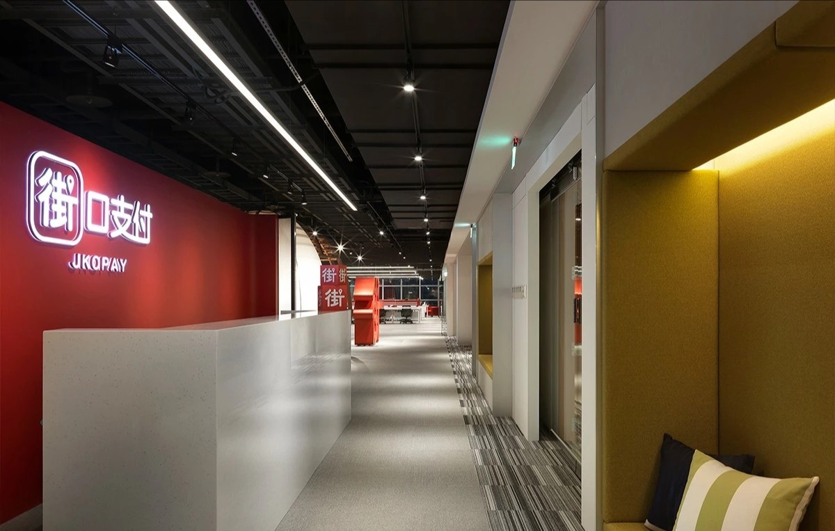 室内空间整体为非常明确的长方形,在设计上除了要克服长型空间使用上的局限,同时更试图融入企业品牌名「街口支付」的意涵。
