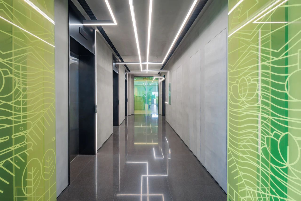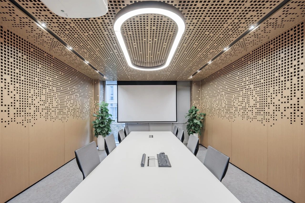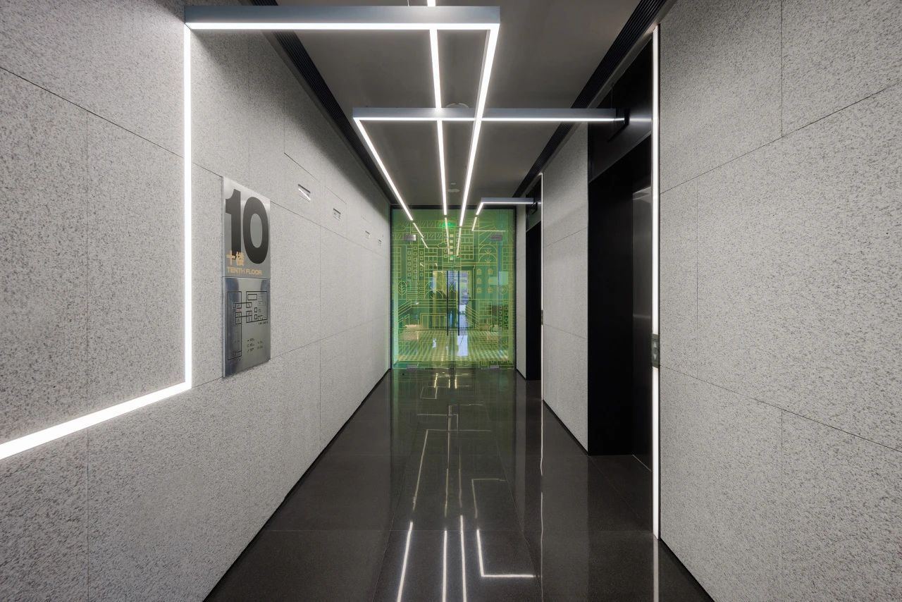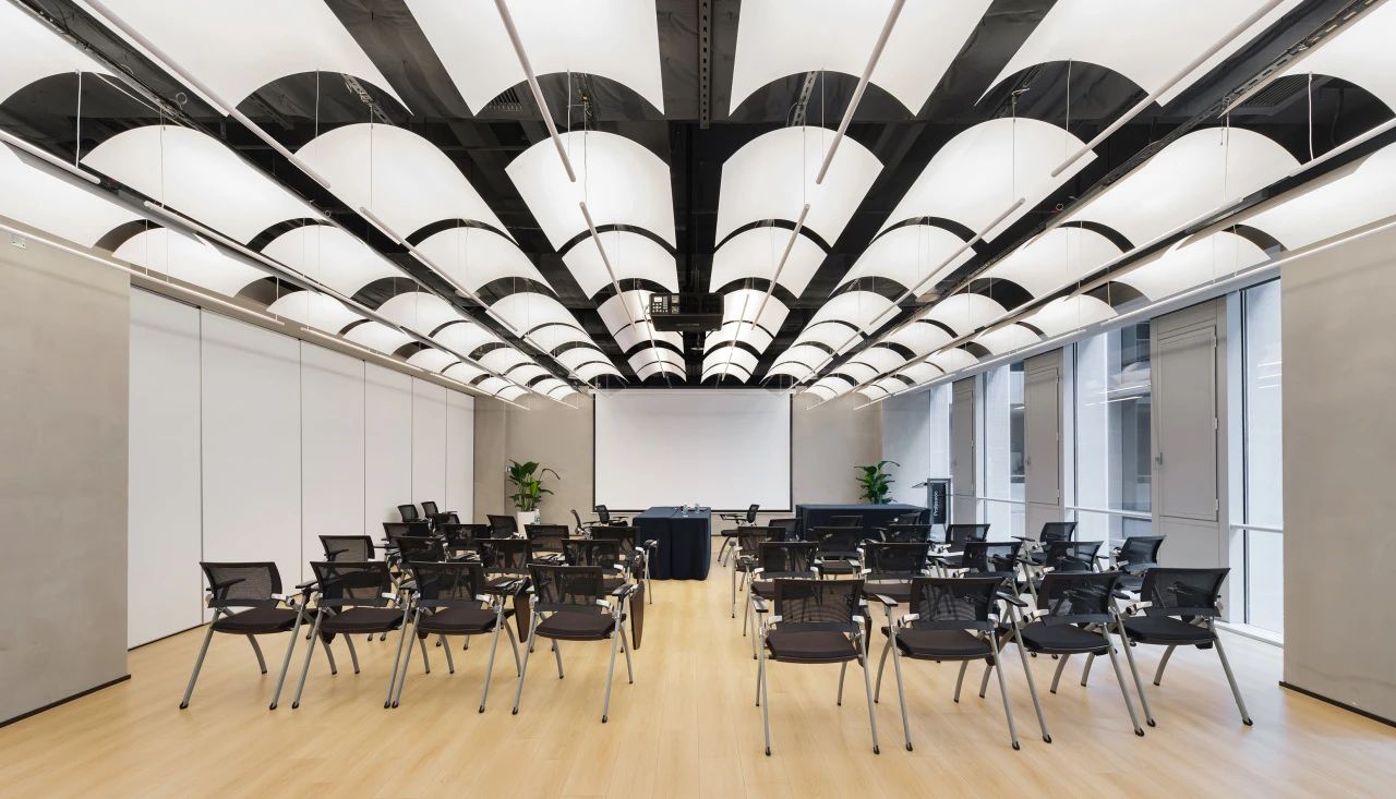 在城市规划的总平面布局设计中,经纬路网是必要的元素之一,我们尝试在大堂的高挑空间中呈现这一标志性的元素,照明、机电、风口等一系列功能设备整合其中,以模块式单元组合完成了经纬路网空间装置。