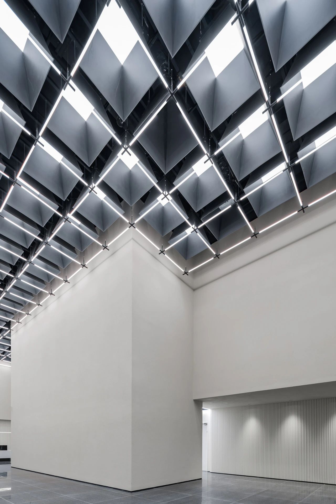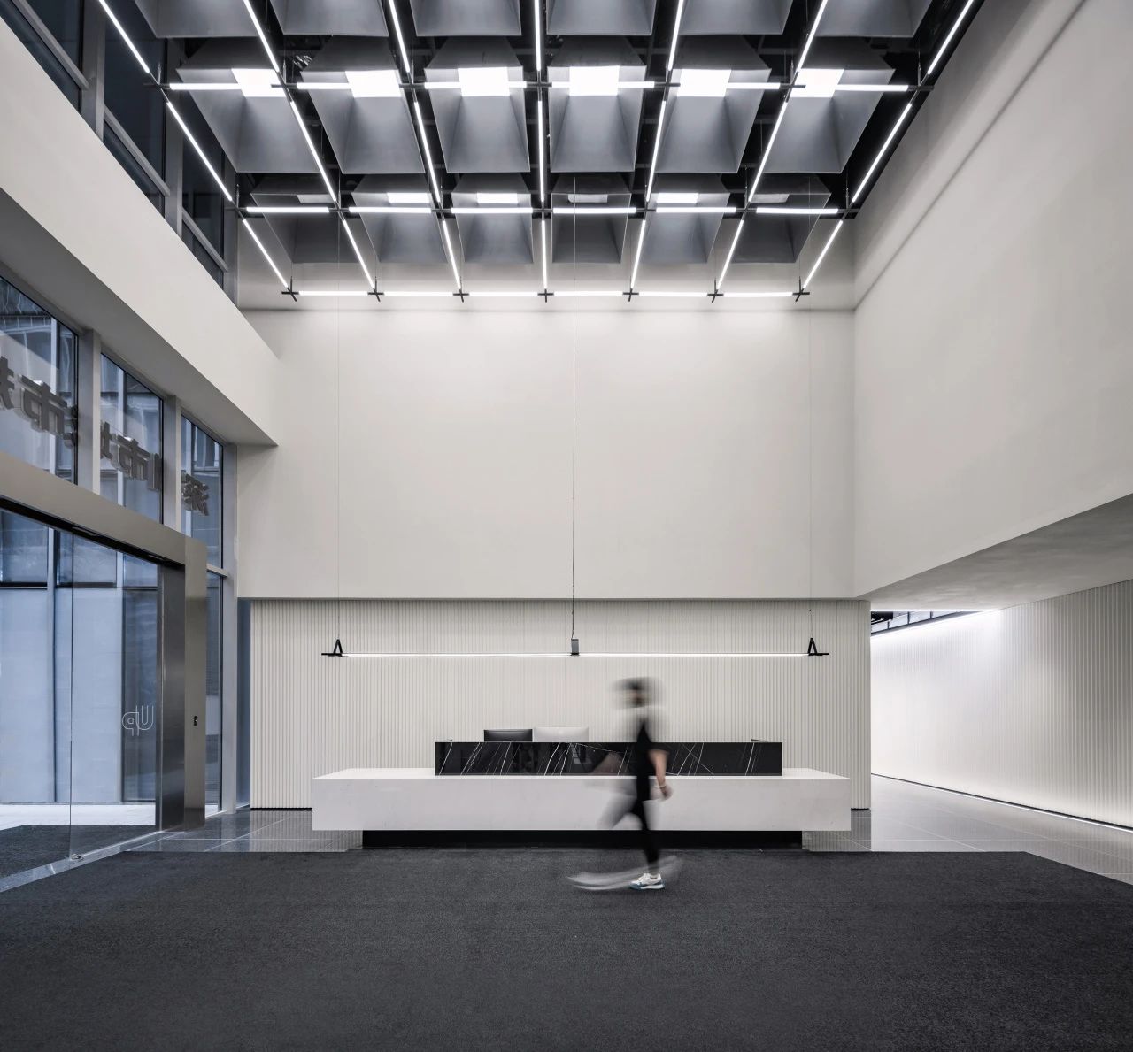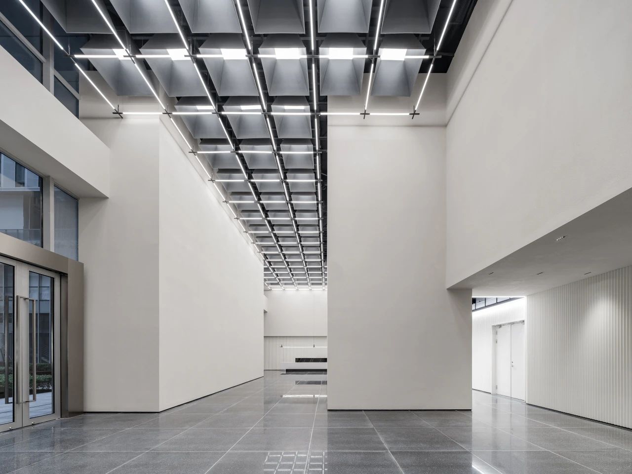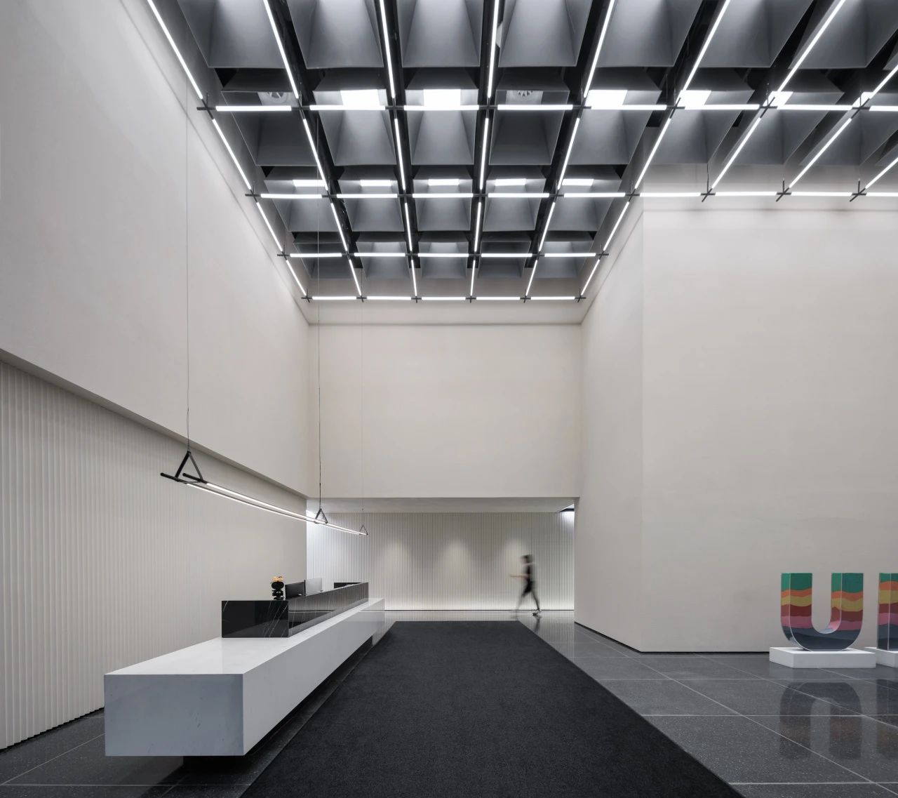 在城市规划的总平面布局设计中,经纬路网是必要的元素之一,我们尝试在大堂的高挑空间中呈现这一标志性的元素,照明、机电、风口等一系列功能设备整合其中,以模块式单元组合完成了经纬路网空间装置。