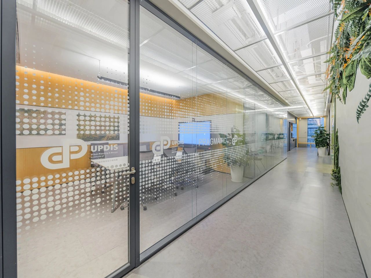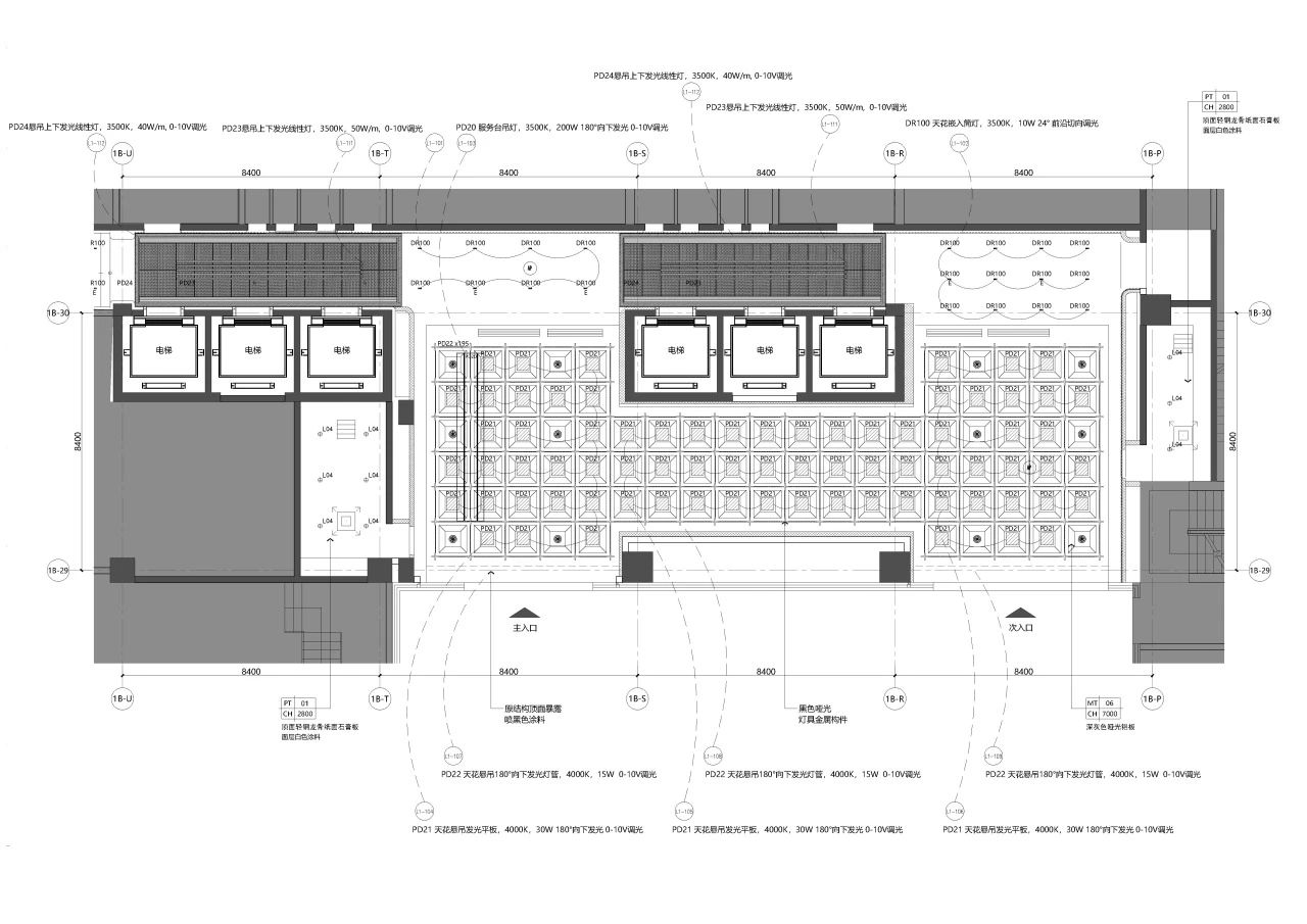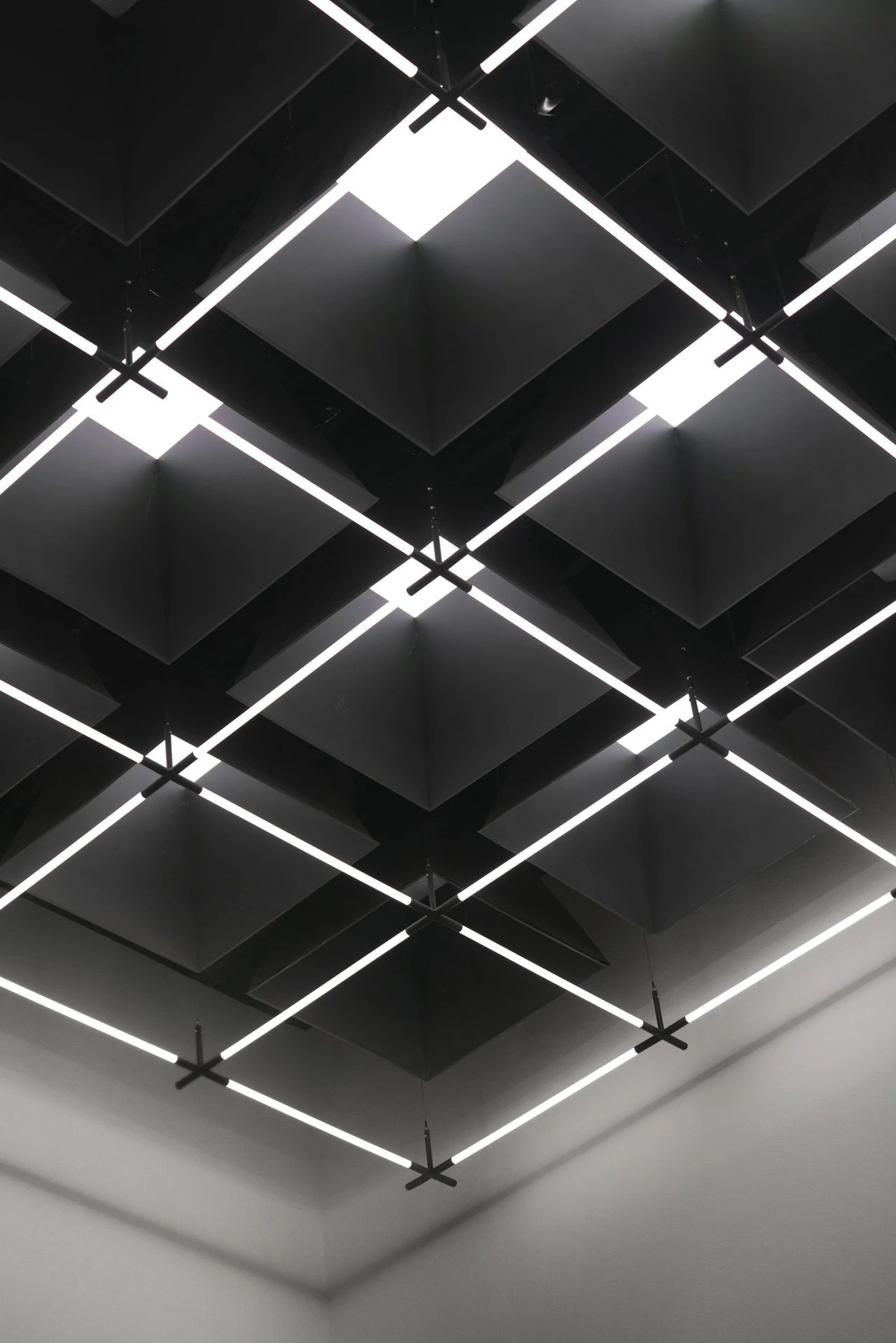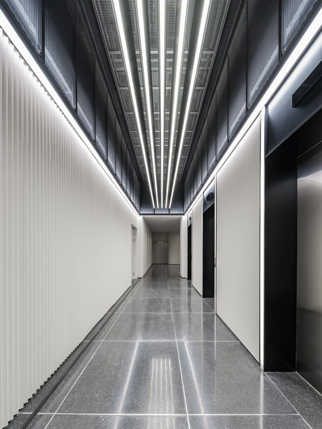 在城市规划的总平面布局设计中,经纬路网是必要的元素之一,我们尝试在大堂的高挑空间中呈现这一标志性的元素,照明、机电、风口等一系列功能设备整合其中,以模块式单元组合完成了经纬路网空间装置。