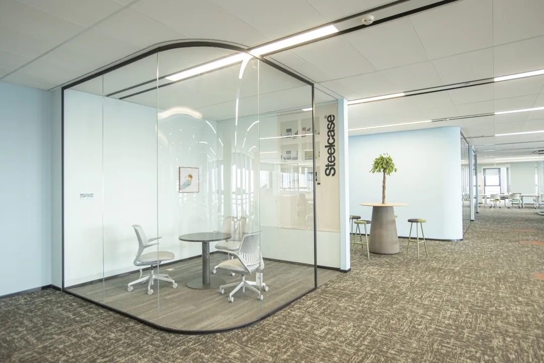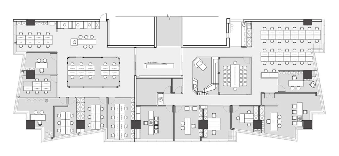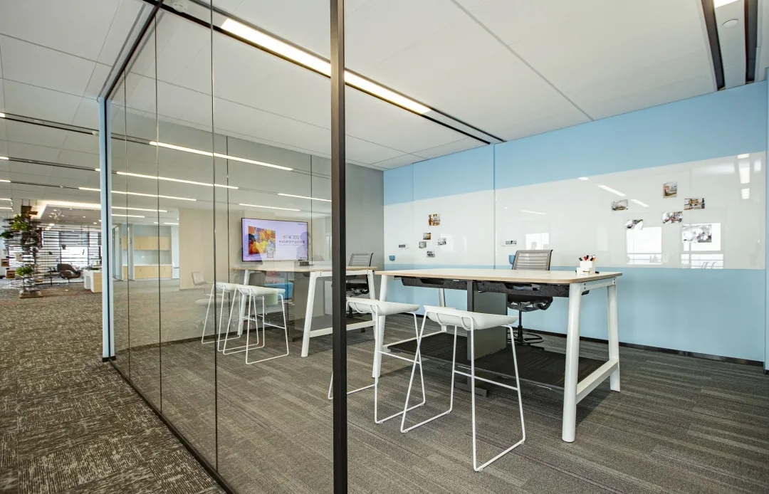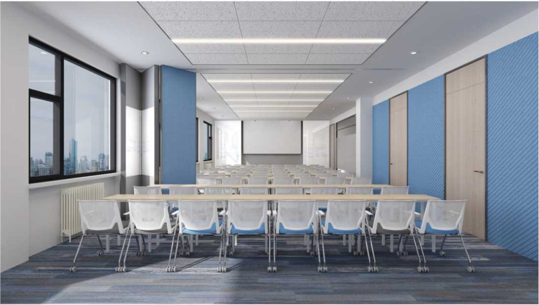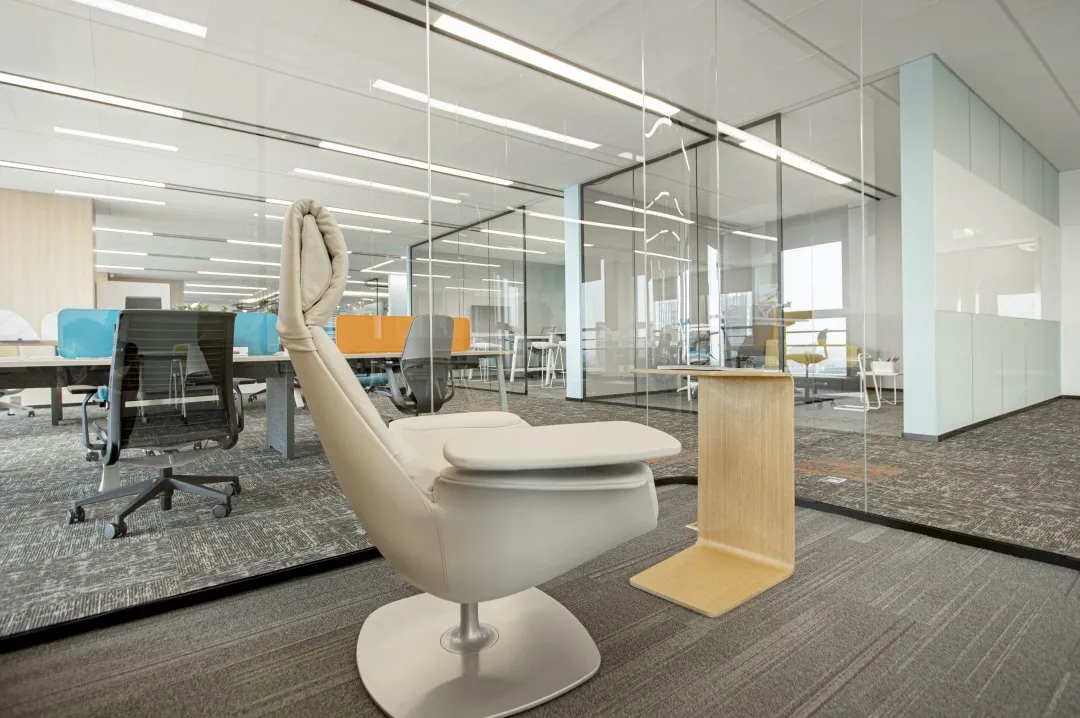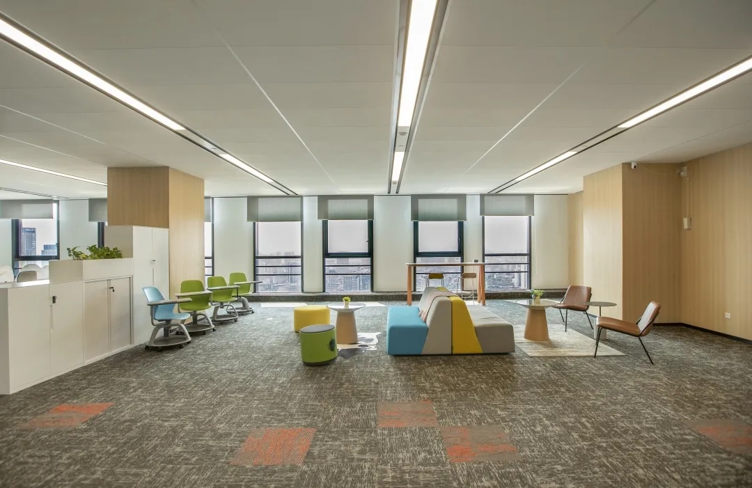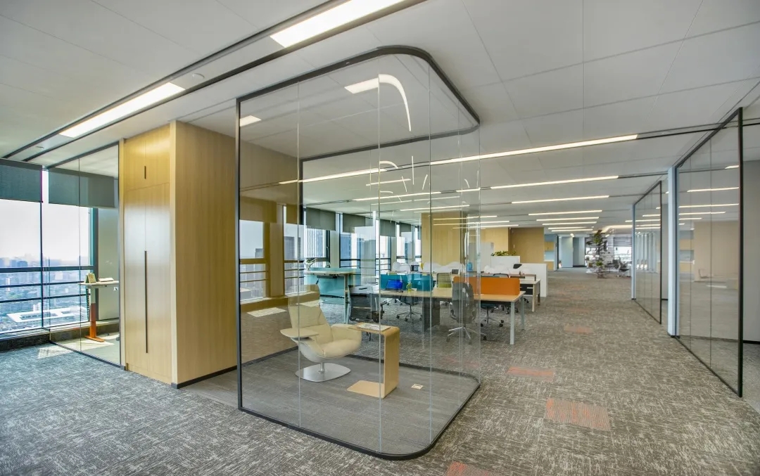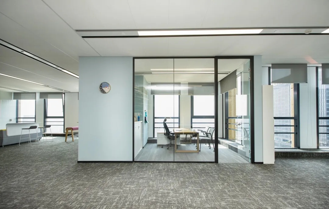 在打造舒适的办公环境的同时,更多的融入了灵活的洽谈场景。利用“隔而不堵,通而不透”的设计理念,简单的布置并不影响后期工位的拓展,反而为办公空间提供了更多交流的空间。