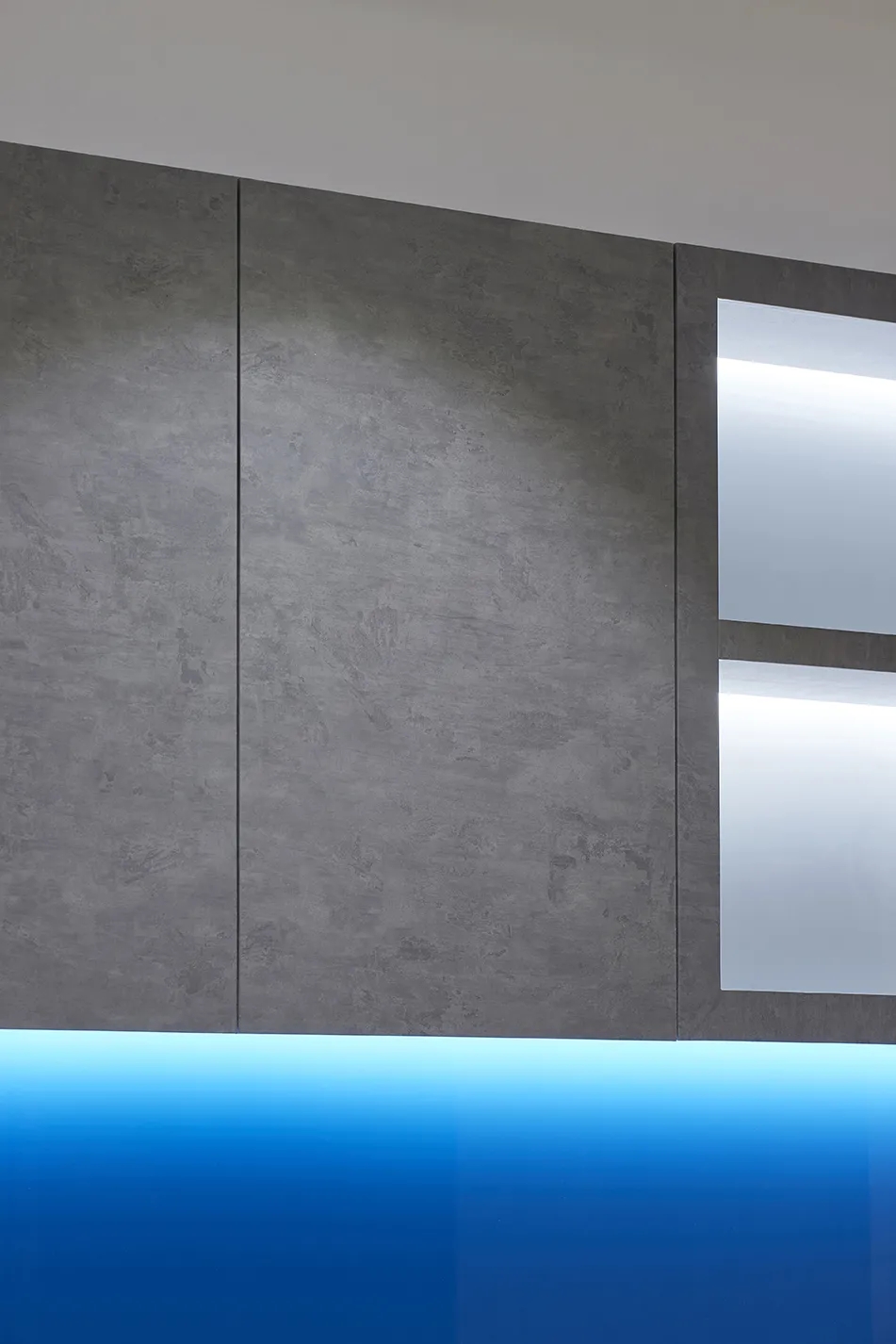 极简灰色LG膜吊柜,边缝齐整,勾勒出井然有序的线条魅力。在深化过程中TFD与甲方沟通协调后改用蓝色灯带,精确投射出柔和渐变色,施工细节处理尤其到位。