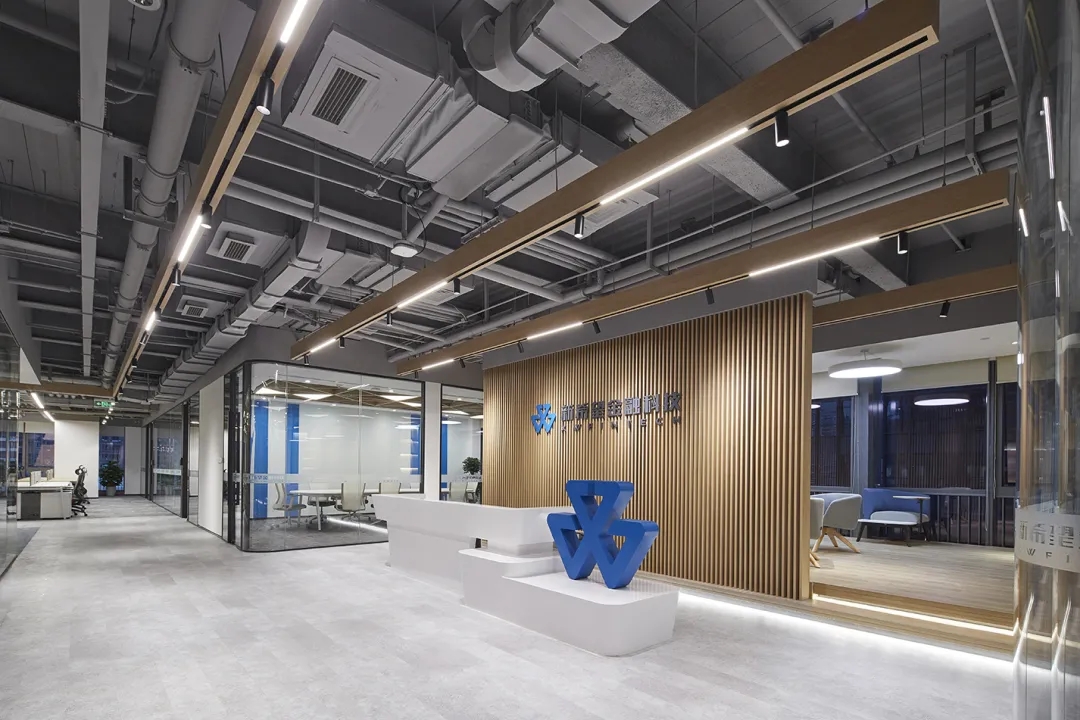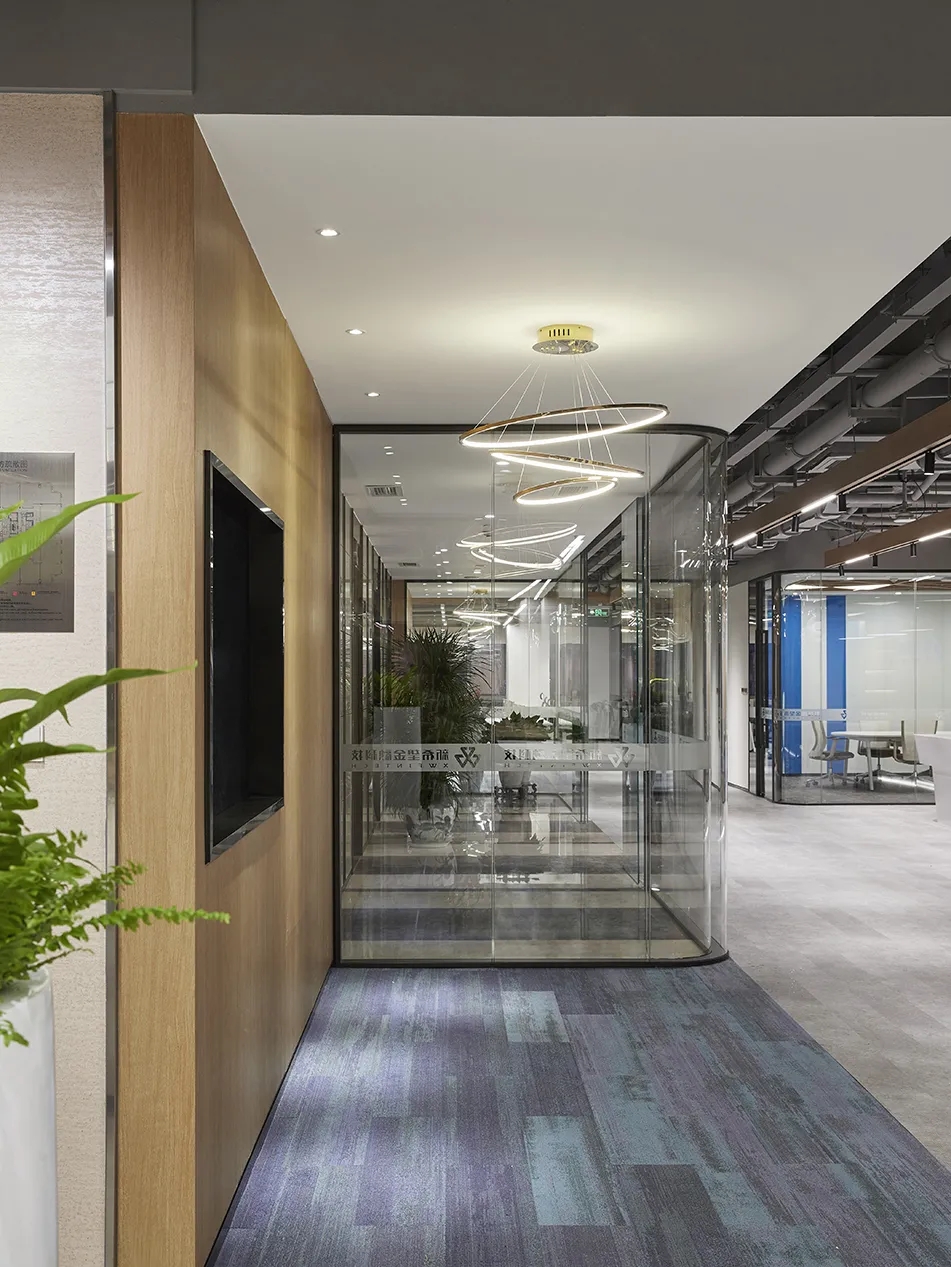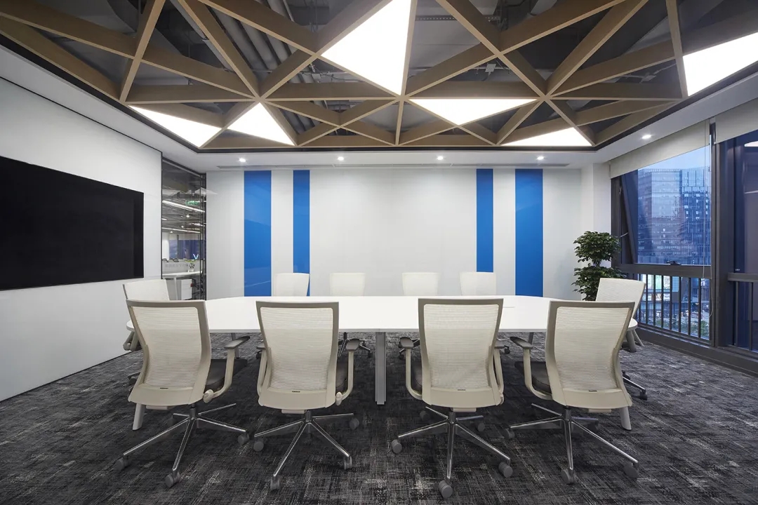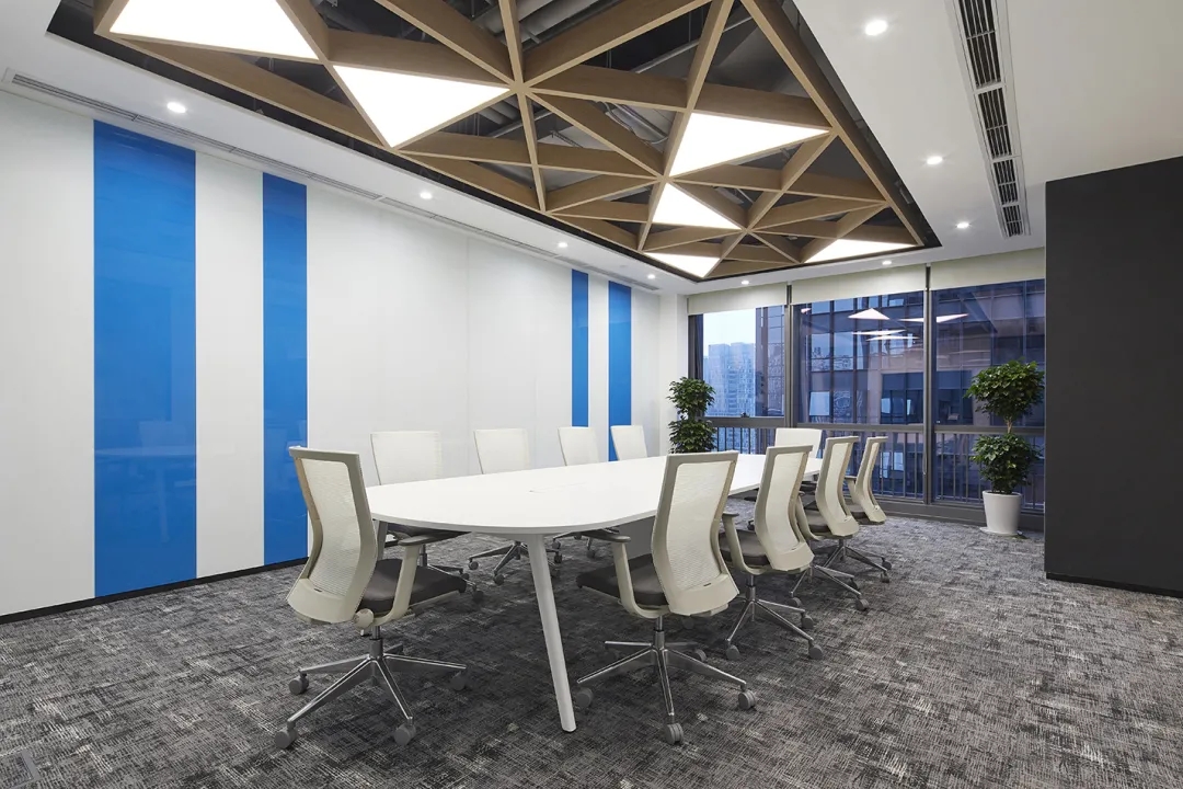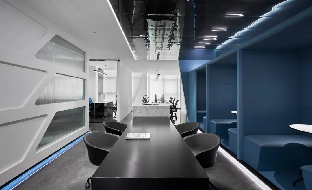 精致木工工艺,几何型照明灯饰,构成既富科技性又动感十足镂空吊顶。打破办公室刻板冰冷的印象,创意在此激发。