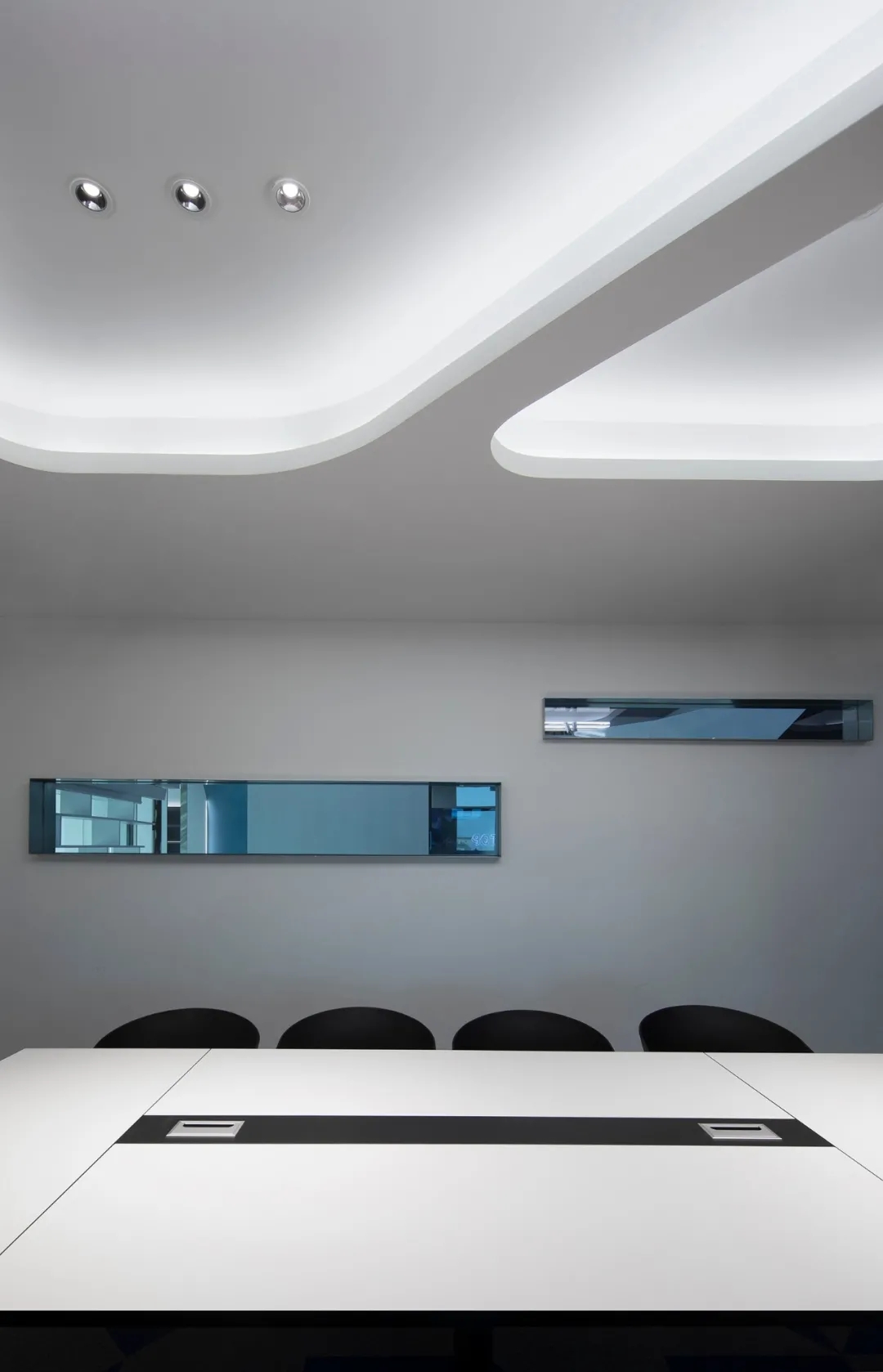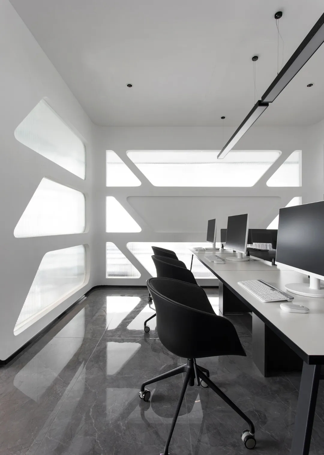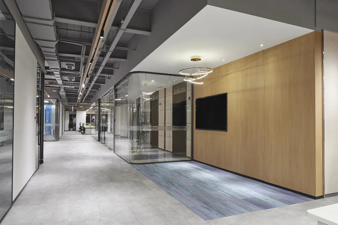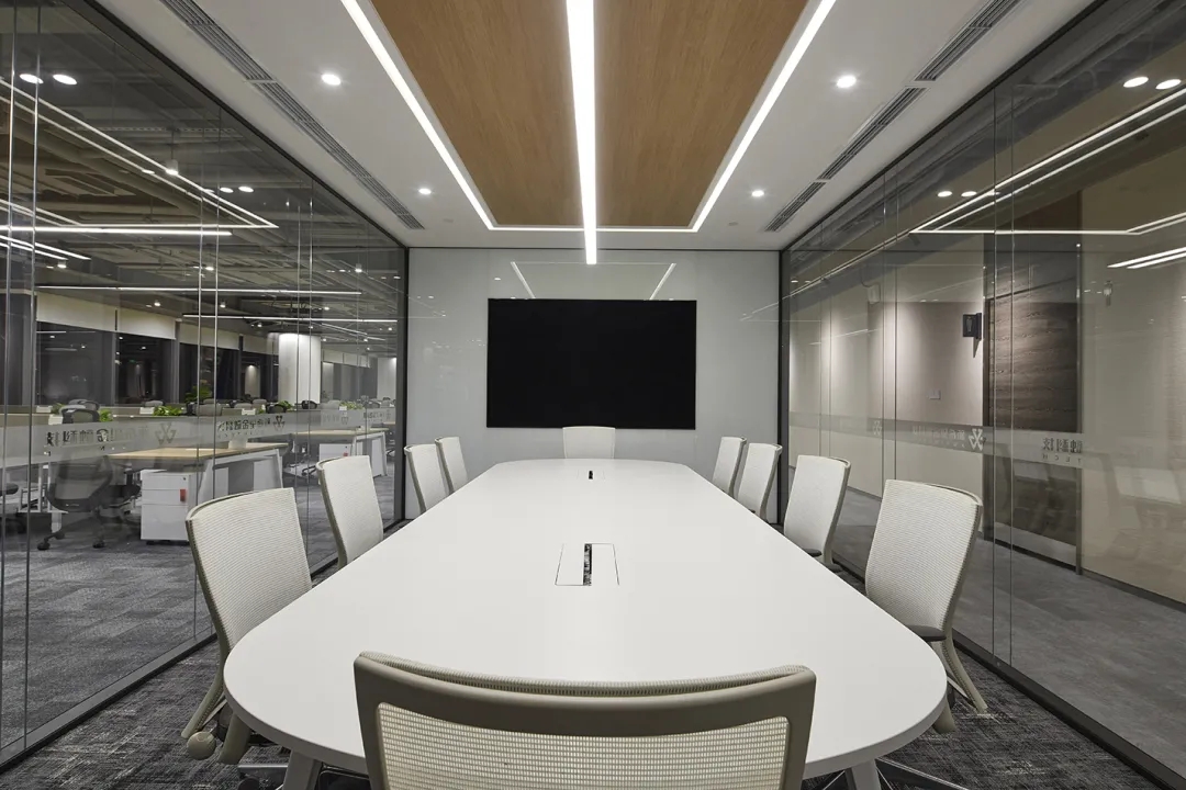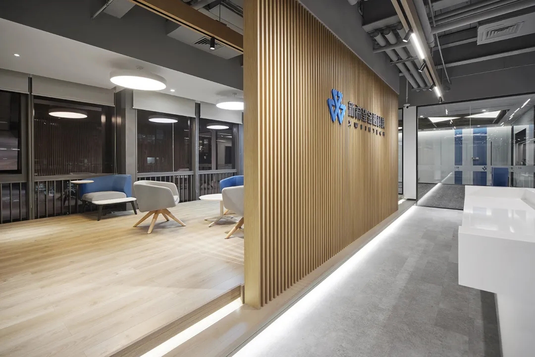精致木工工艺,几何型照明灯饰,构成既富科技性又动感十足镂空吊顶。打破办公室刻板冰冷的印象,创意在此激发。