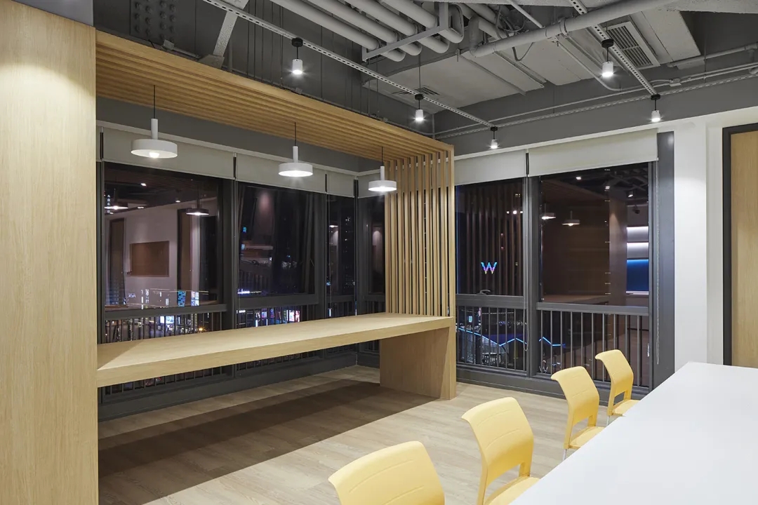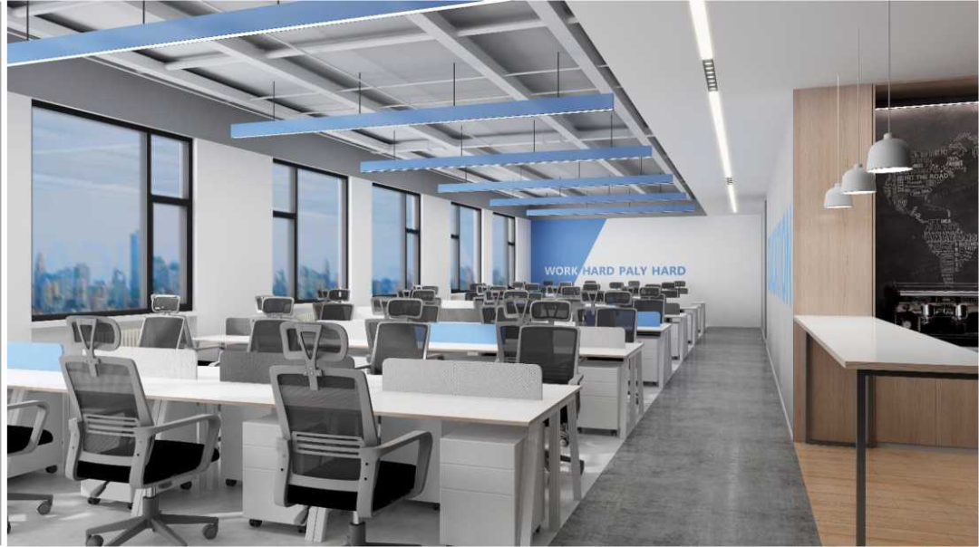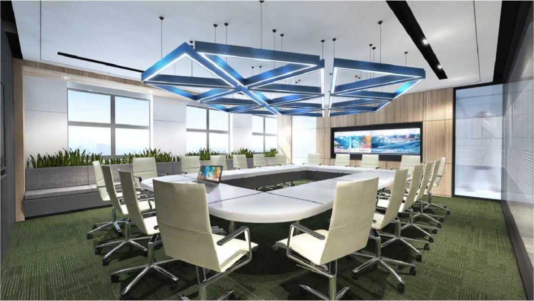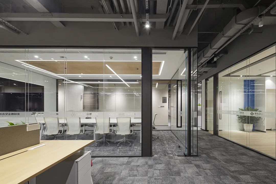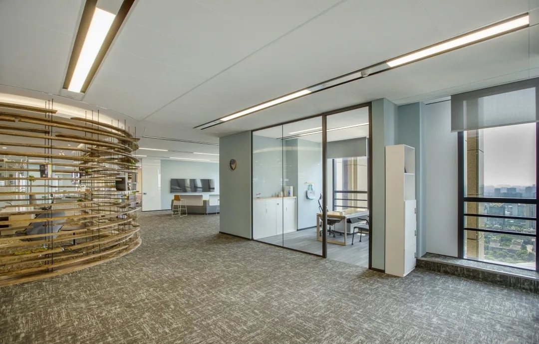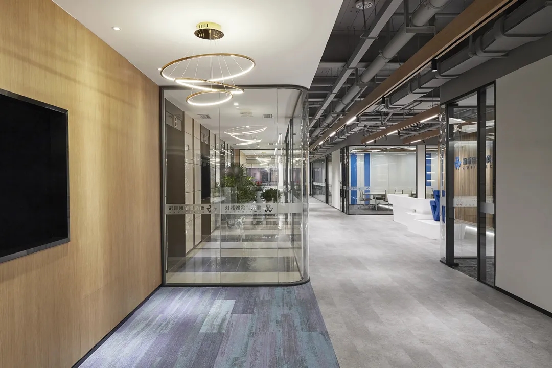 精致木工工艺,几何型照明灯饰,构成既富科技性又动感十足镂空吊顶。打破办公室刻板冰冷的印象,创意在此激发。