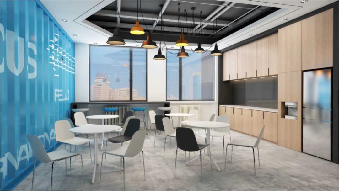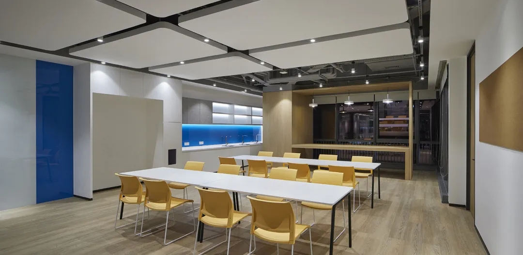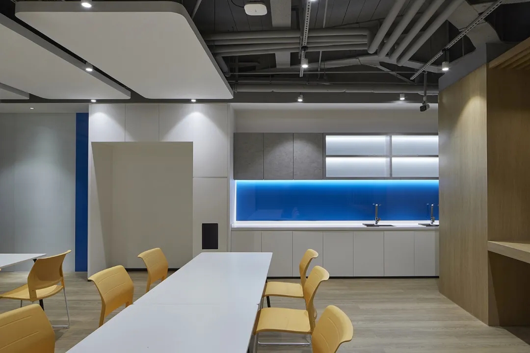 蓝色集装箱式背景墙,配上复古的吊灯,已经有了美式风格的雏形,加上黑白桌椅和木质嵌入式柜体,又增添几分简约之感。茶水休闲区整体布局上,我们布置了适合自由灵活交流的小桌,也布置了想要独处思考的吧台桌,希望能为每个员工提供一个极致舒适的休息环境。