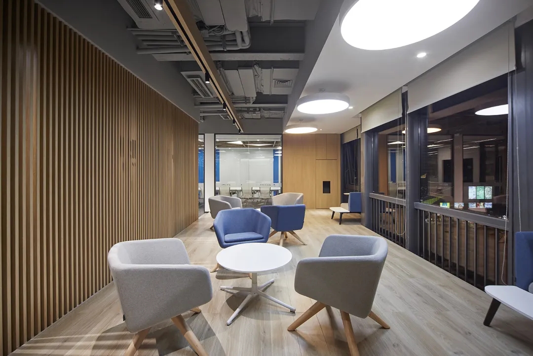 墙面采用天蓝与木色、白色搭配,整体空间给人轻快的感觉,休闲区的家具颜色选择鲜艳的色系,从而体现视觉的冲击感,也体现了空间多彩的生命力。