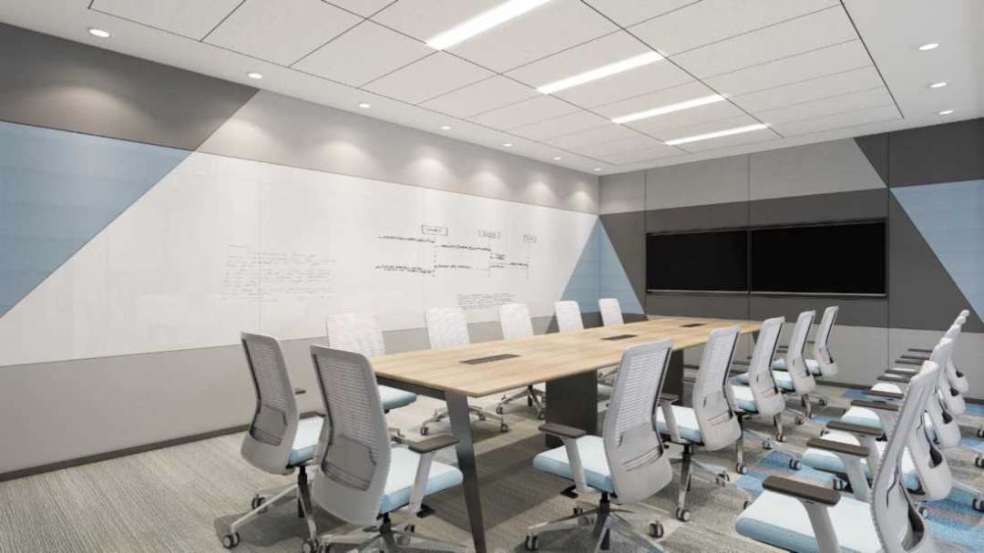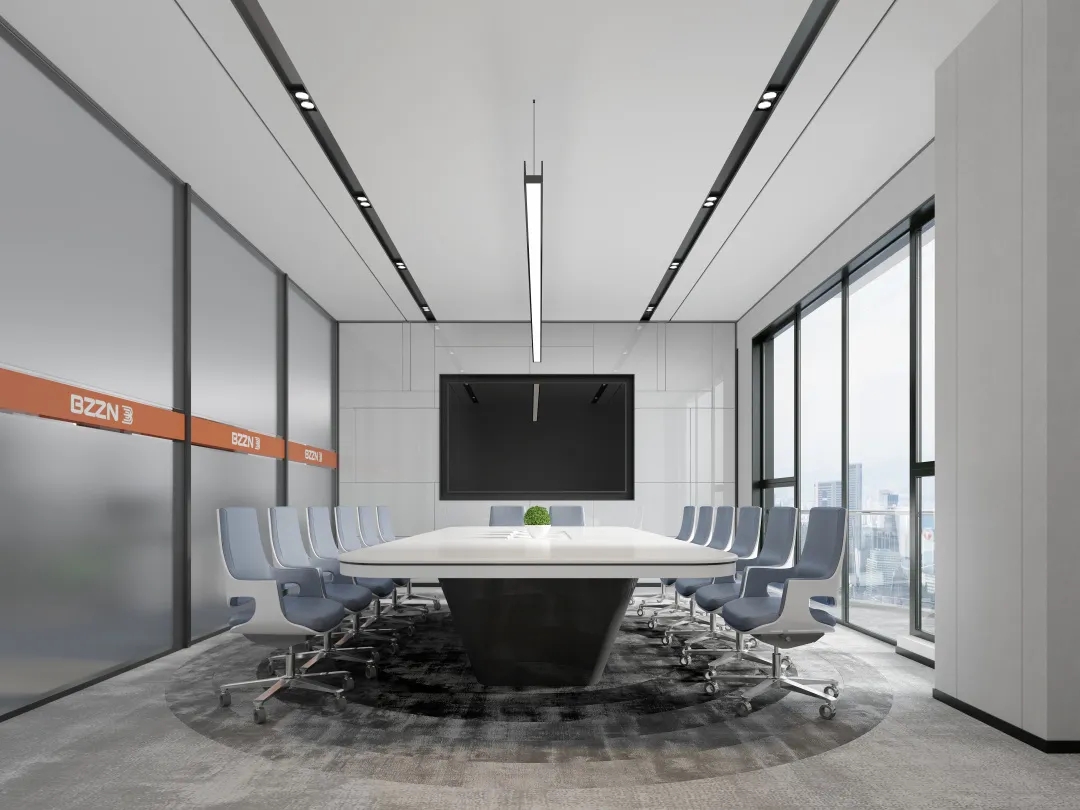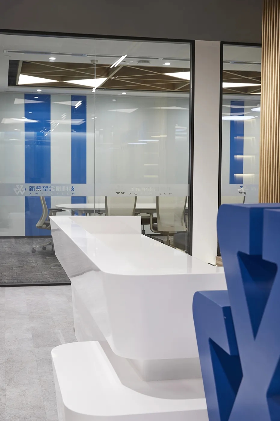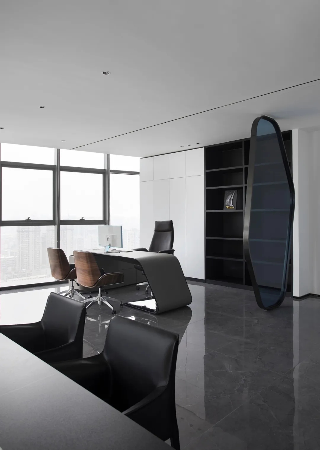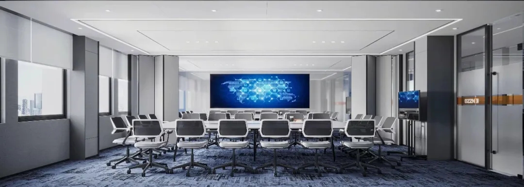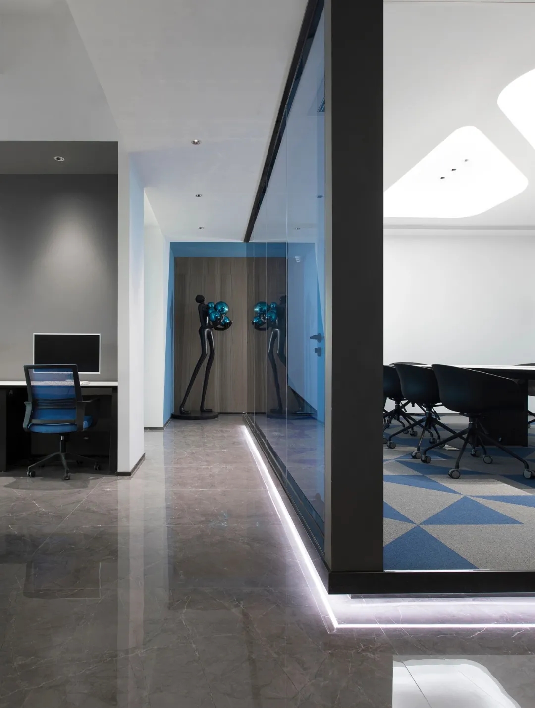 整个空间,以“扬帆起航”为设计轴心,体现“鹰拓”精神,为展望未来插上翅膀。色彩上选用黑、白、灰、蓝等科技色,打造冷静思考、理性分析的办公空间。同时,通过灯光、多维度科技元素等的共融,展现企业对科技与艺术融合的接纳与创新。科技持续领跑,想象释放无限未来。