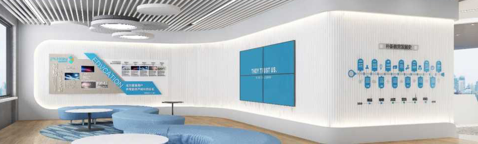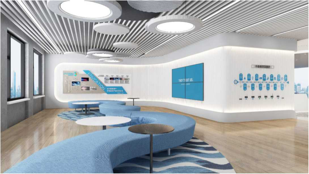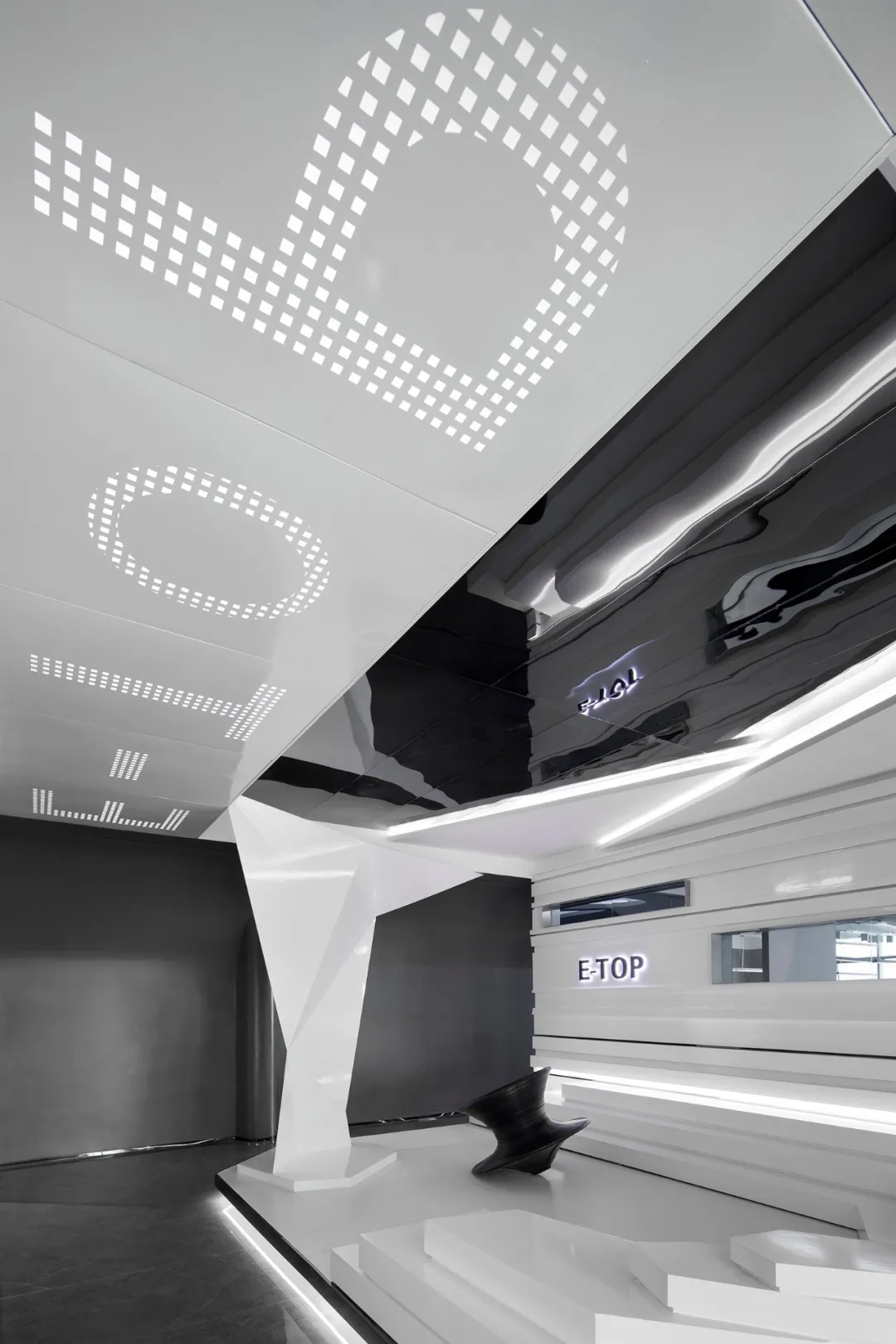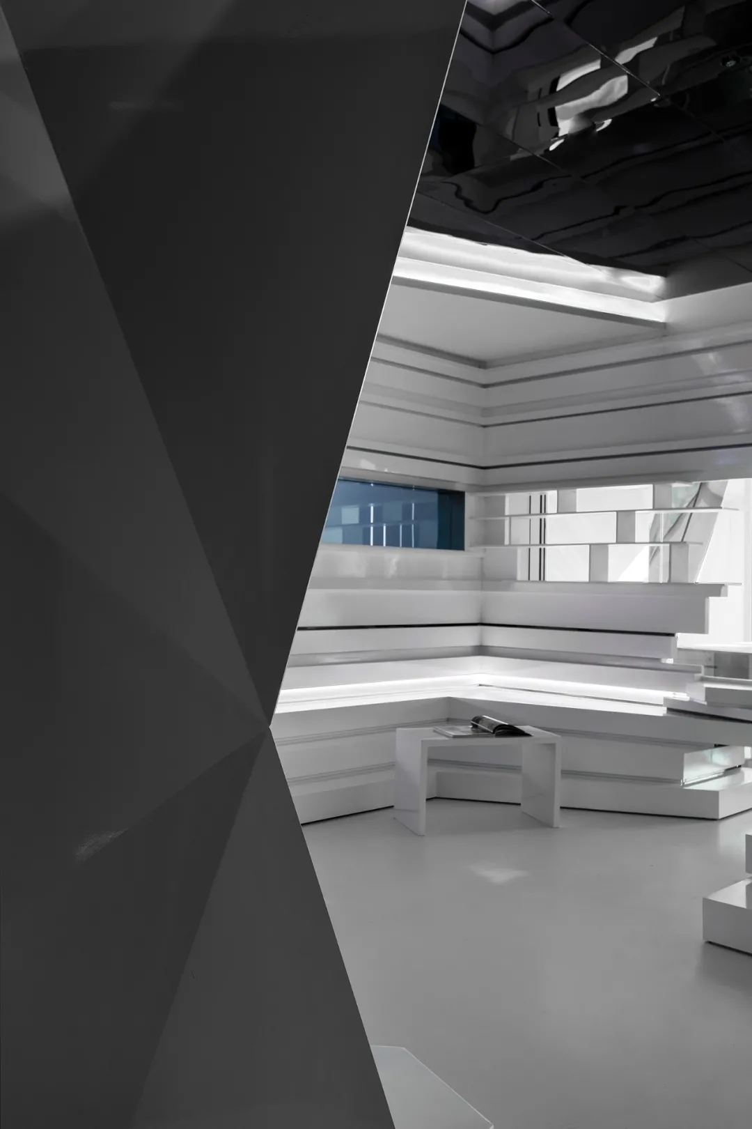 “扬帆起航”的设计造型,奠定了整体设计基调与企业文化精神内涵。不规则的造型叠搭,层层递进,是迈步未来,步履不停。以多层次的光源,不规则地折射出科技感,如梦似真,五感体验立体呈现,幻化出未来的可变性与无限性。