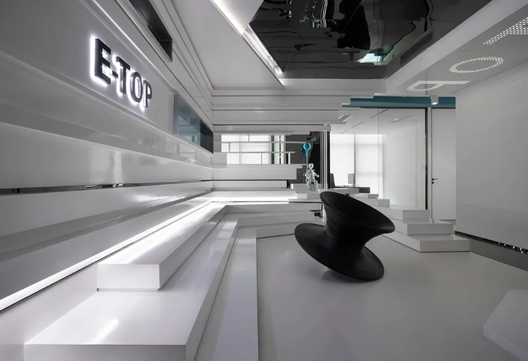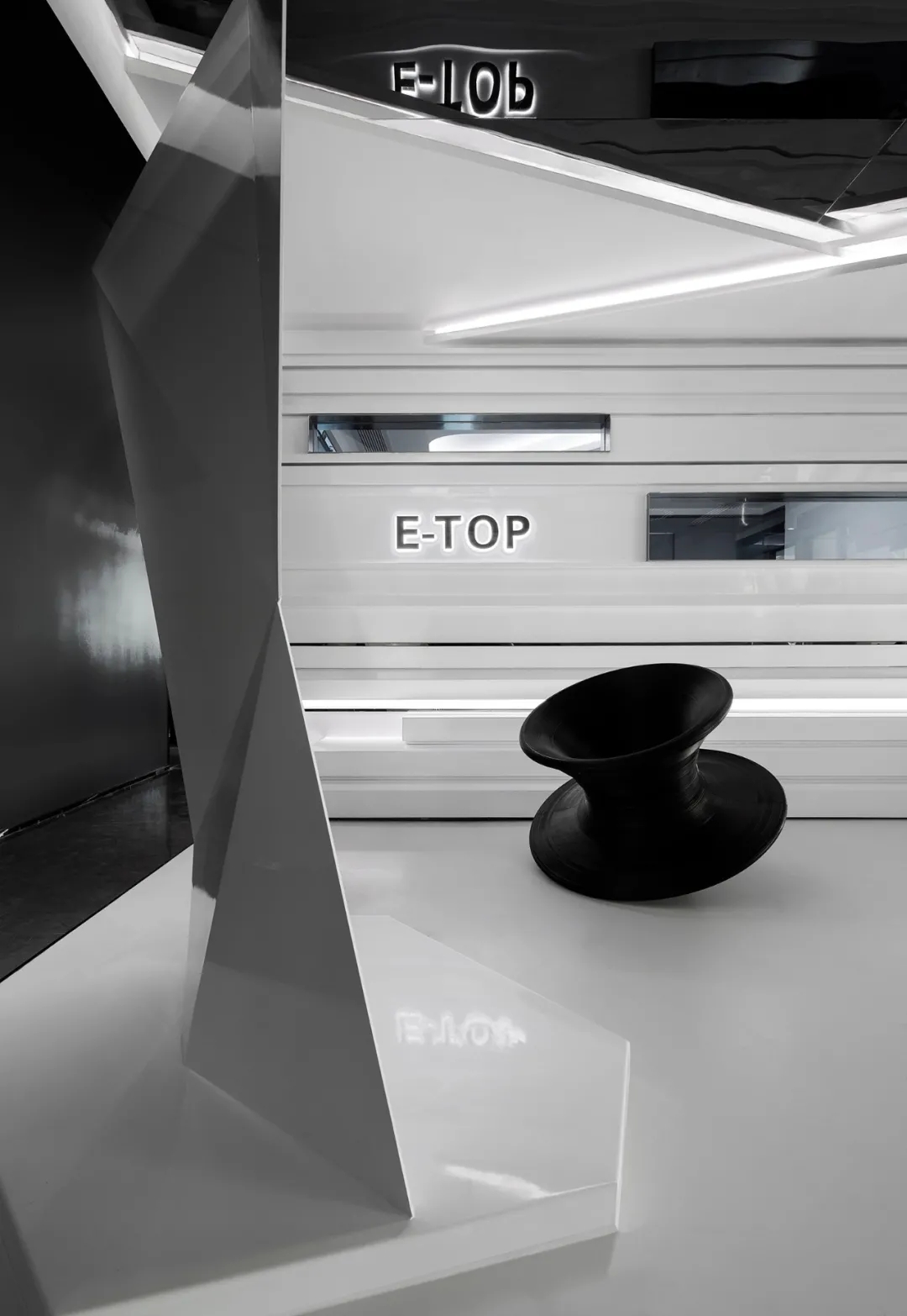 E-TOP——鹰拓科技,作为科技企业里的佼佼者,服务对象主要为亚马逊等全球电商巨头。本次与E-TOP的深度合作,旨在通过对企业文化的深层次挖掘,最大限度激发企业精神的内核驱动。设计师运用企业形象的具象要素和未来办公空间的个性化表达,在科技硬朗理性与空间韵律感性的平衡中,寻觅和谐统一。既要体现艺术性与现实性,也要具有前瞻性与可持续性,这既是身为设计方的责任,也是体现企业价值和使命感的完美表达。