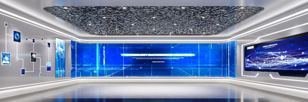 黑白灰的配色,顶部线性灯的装饰,深蓝色的地毯尽显现代风格,设计师从空间中一个点延伸出去,为线与面的生成注入灵魂,在空间不断变化的点、线、面形态中衍生出数字化的浪漫与格调。数据,科技与美学集合起来便是灵动 当时间与空间成为场所直面的两个向度关系时 对场所的探索以人的维度展开 那么展示空间最终实现线索的第四维。