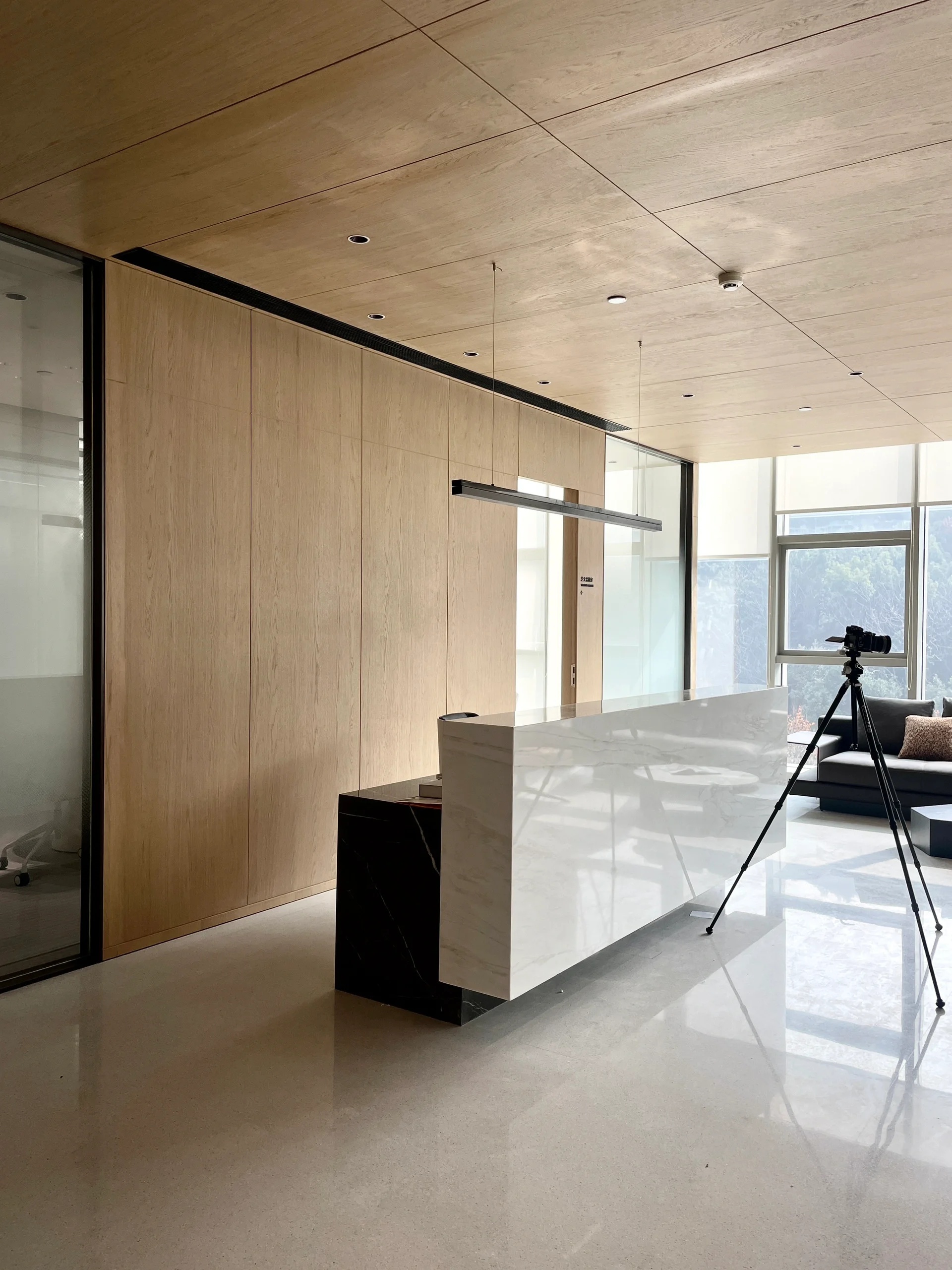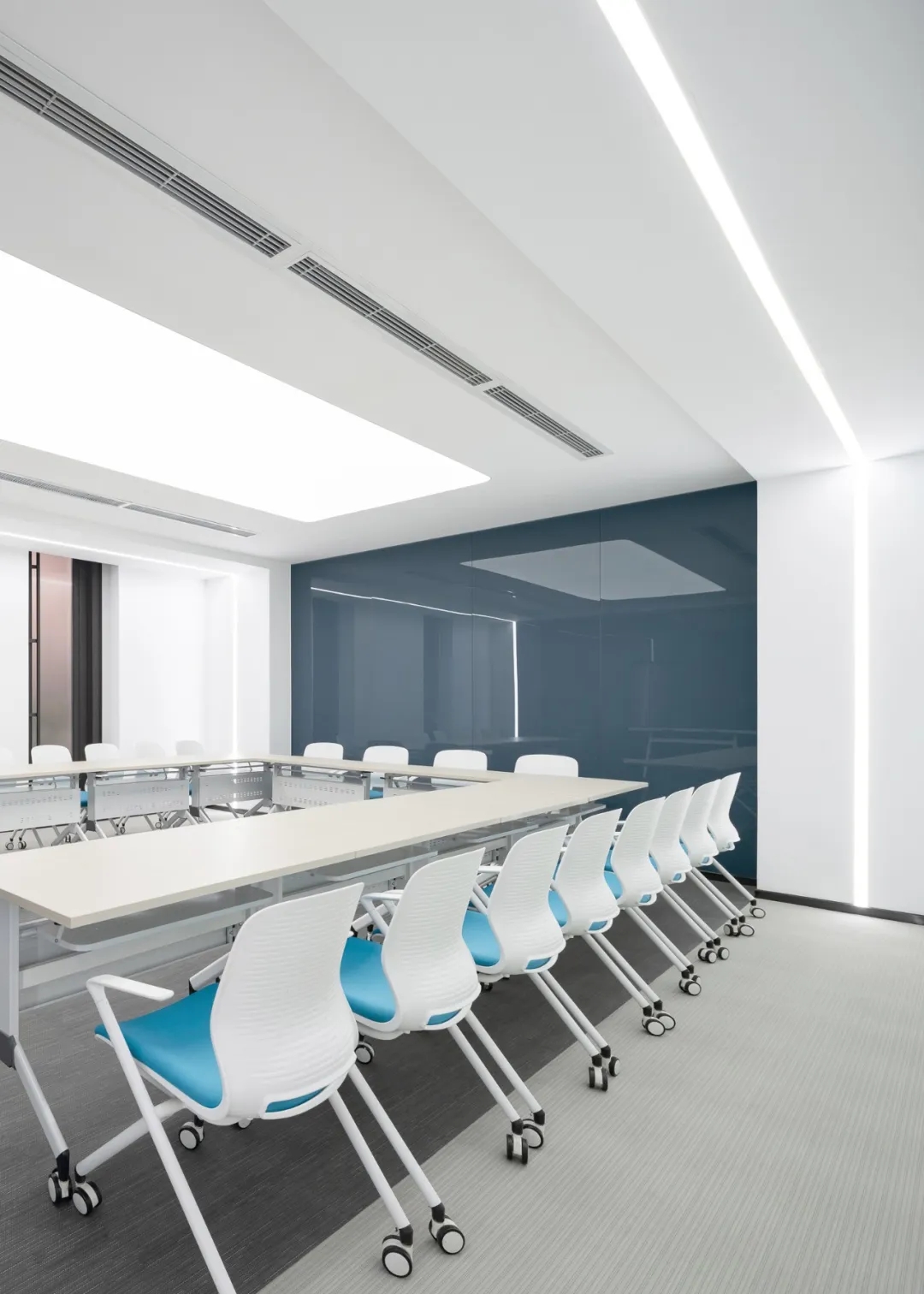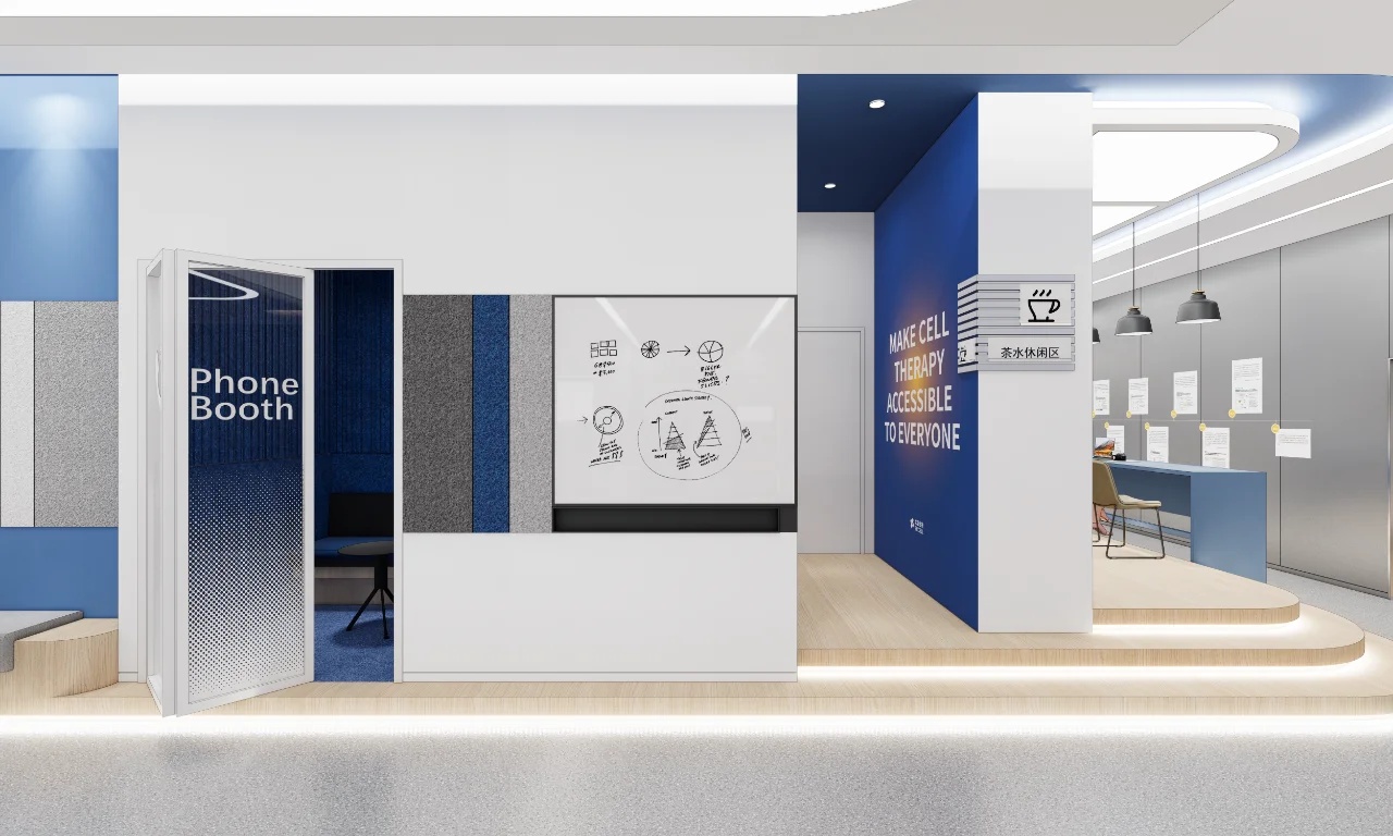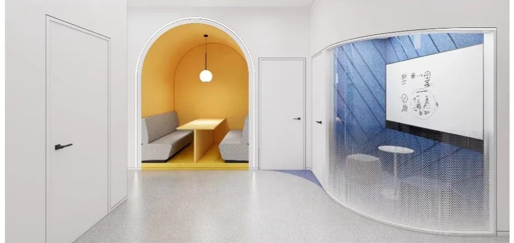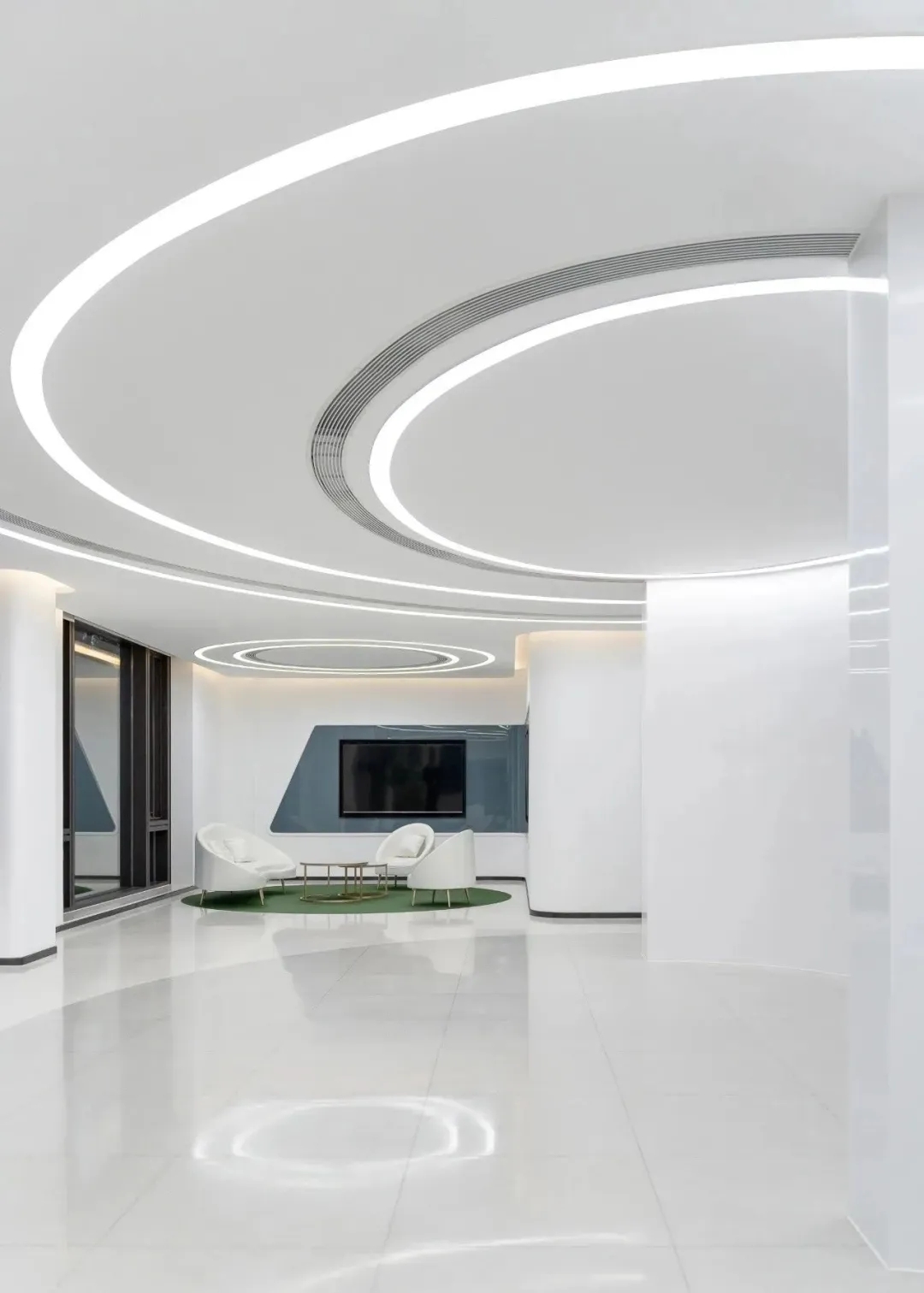 1F整体设计概念从水木明拓氢能科技有限公司的性质出发,打造科技未来感的空间,以灵动的曲线元素为基础型态,呈现出一个流动感的核心空间,凸显企业科技形象。2F为员工办公层,设计师以开放、平等、自由等关键词展开,摒弃繁复的装饰,保留利落的线条和简约的结构,寻求将空间缩减到最基本的形式去满足“人”对空间需求,简洁、简约、回归“少即是多”的设计理念。