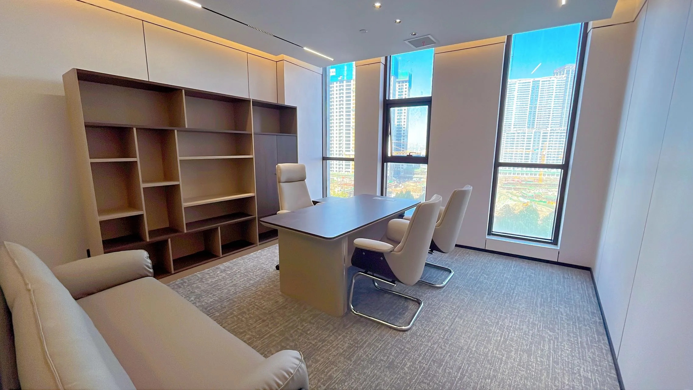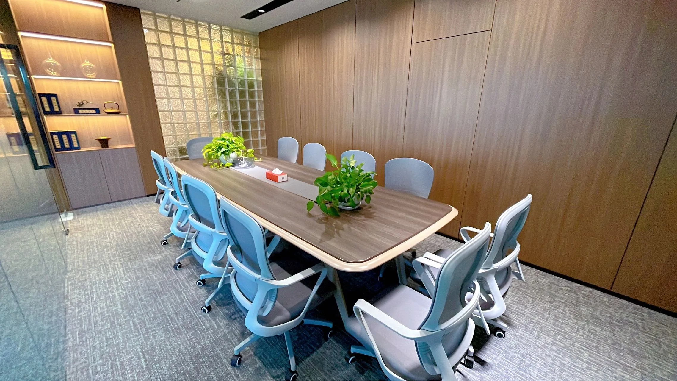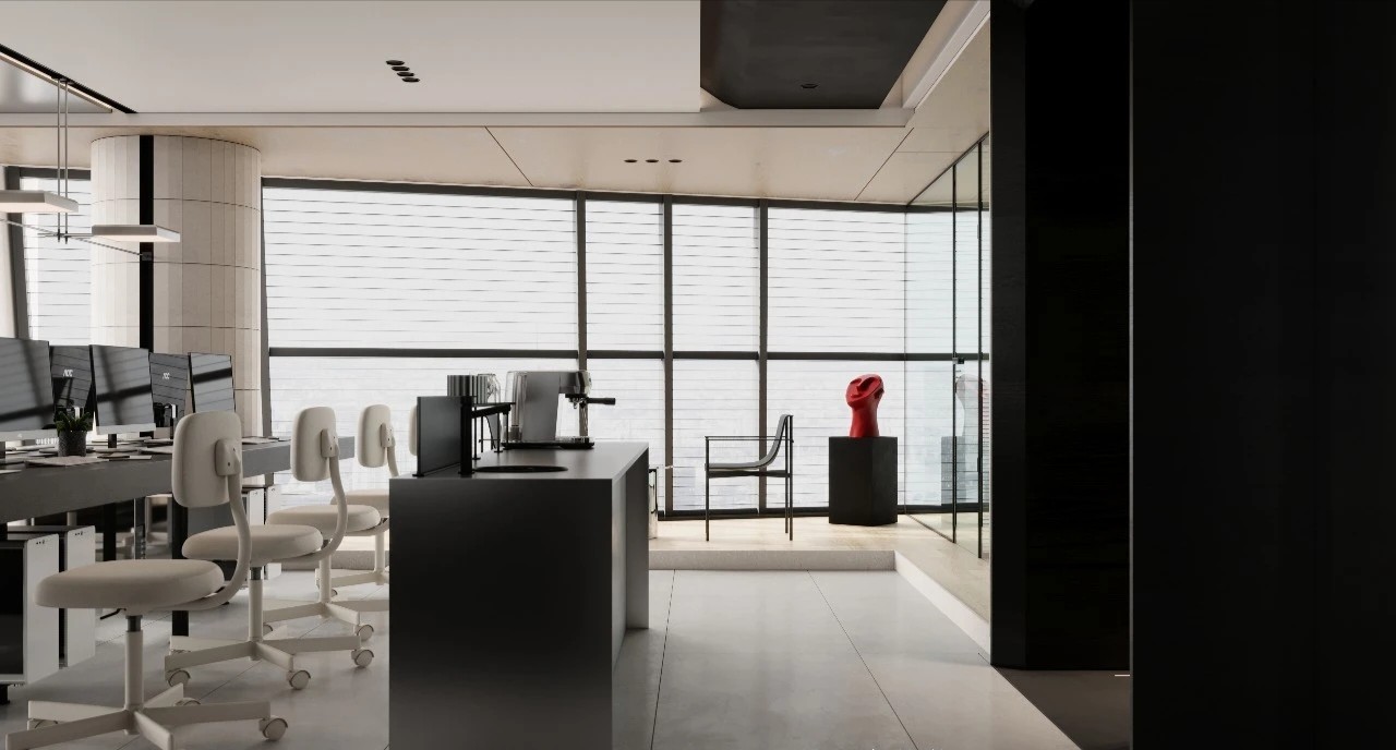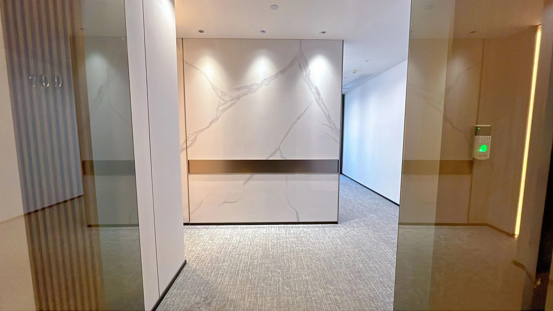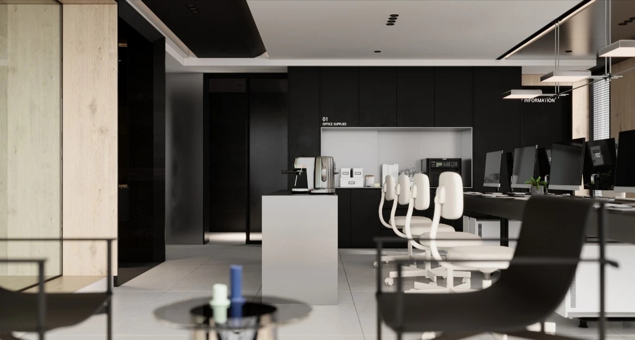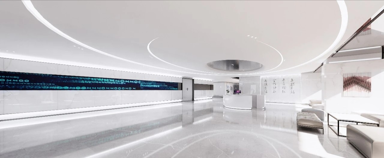 从电梯厅进入到前台区域,迎面而来的是一个拥有充足的自然采光、视野开阔、极具创意的时尚空间。宽敞的前厅设有舒适开放的访客等候区,这里也用作内部团队的交流协作,营造出一个轻松舒适的休闲氛围。前厅等候区设有一面超大的多媒体数字显示屏幕,主要用向来访者展示盈科品牌故事、同时也兼作公司会议与培训时的演示屏幕。简洁干练的设计让这里焕发着时尚科技的气息。这些洽谈室、小型讨论间、开放式休闲讨论区等空间,为律师提供了稍事休息、交流互动的灵活空间选择,鼓励律师在空间中走动互通,舒缓身心。