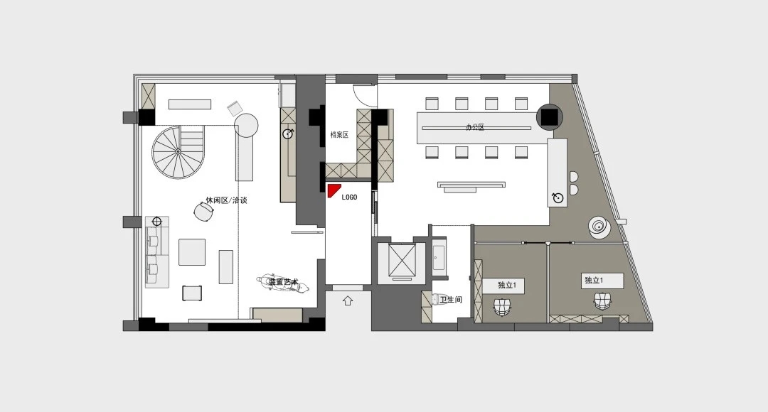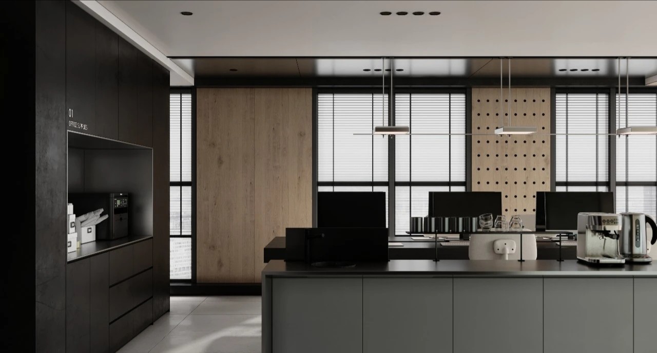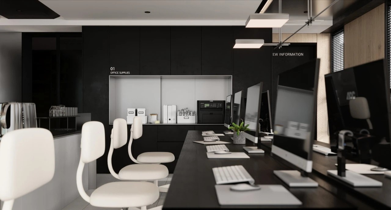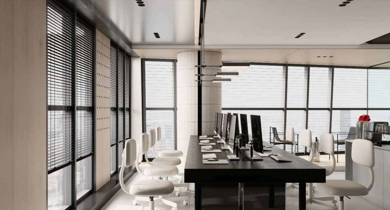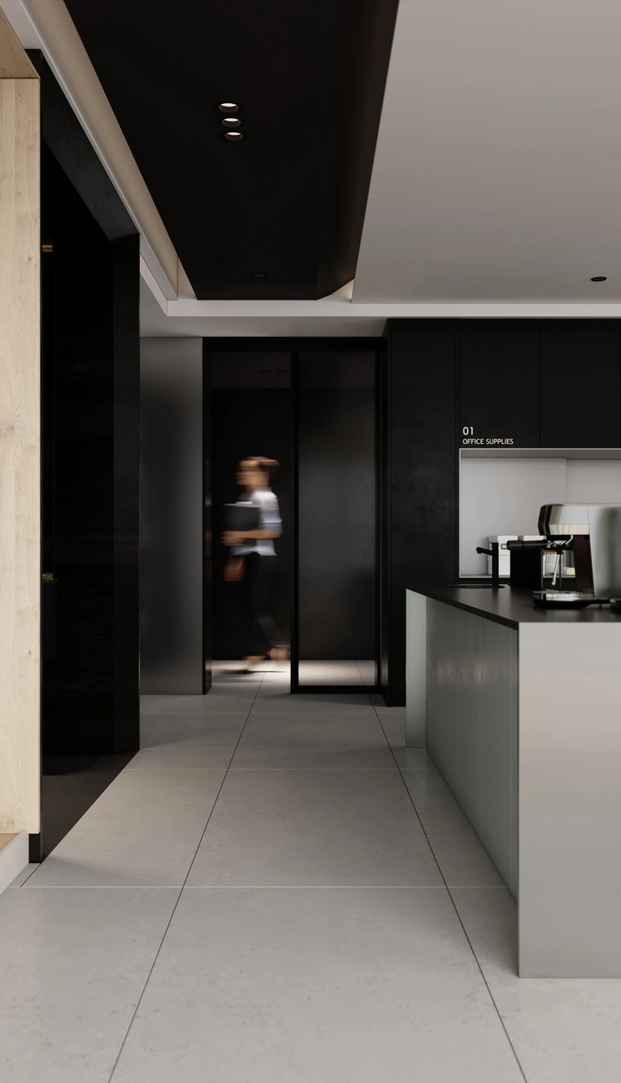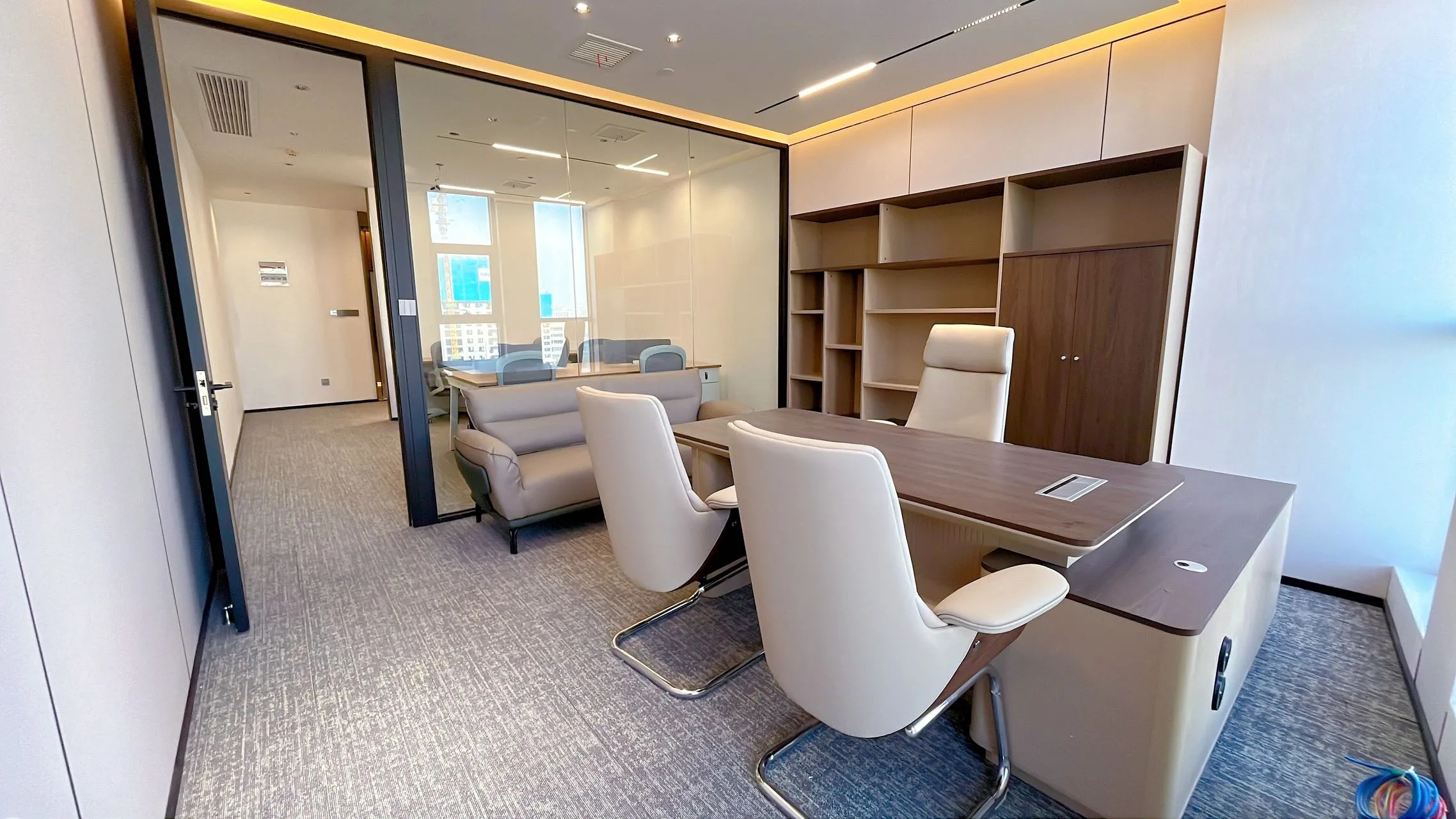 从电梯厅进入到前台区域,迎面而来的是一个拥有充足的自然采光、视野开阔、极具创意的时尚空间。宽敞的前厅设有舒适开放的访客等候区,这里也用作内部团队的交流协作,营造出一个轻松舒适的休闲氛围。前厅等候区设有一面超大的多媒体数字显示屏幕,主要用向来访者展示盈科品牌故事、同时也兼作公司会议与培训时的演示屏幕。简洁干练的设计让这里焕发着时尚科技的气息。这些洽谈室、小型讨论间、开放式休闲讨论区等空间,为律师提供了稍事休息、交流互动的灵活空间选择,鼓励律师在空间中走动互通,舒缓身心。