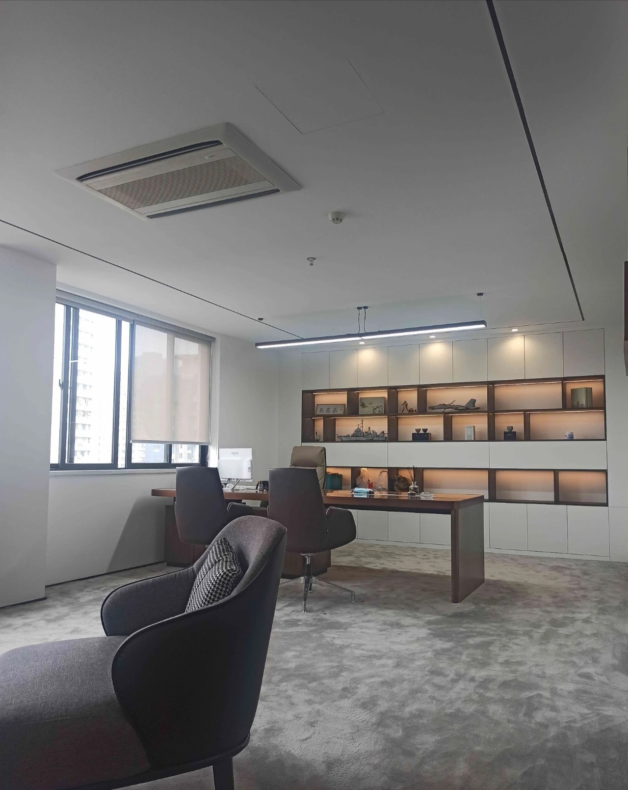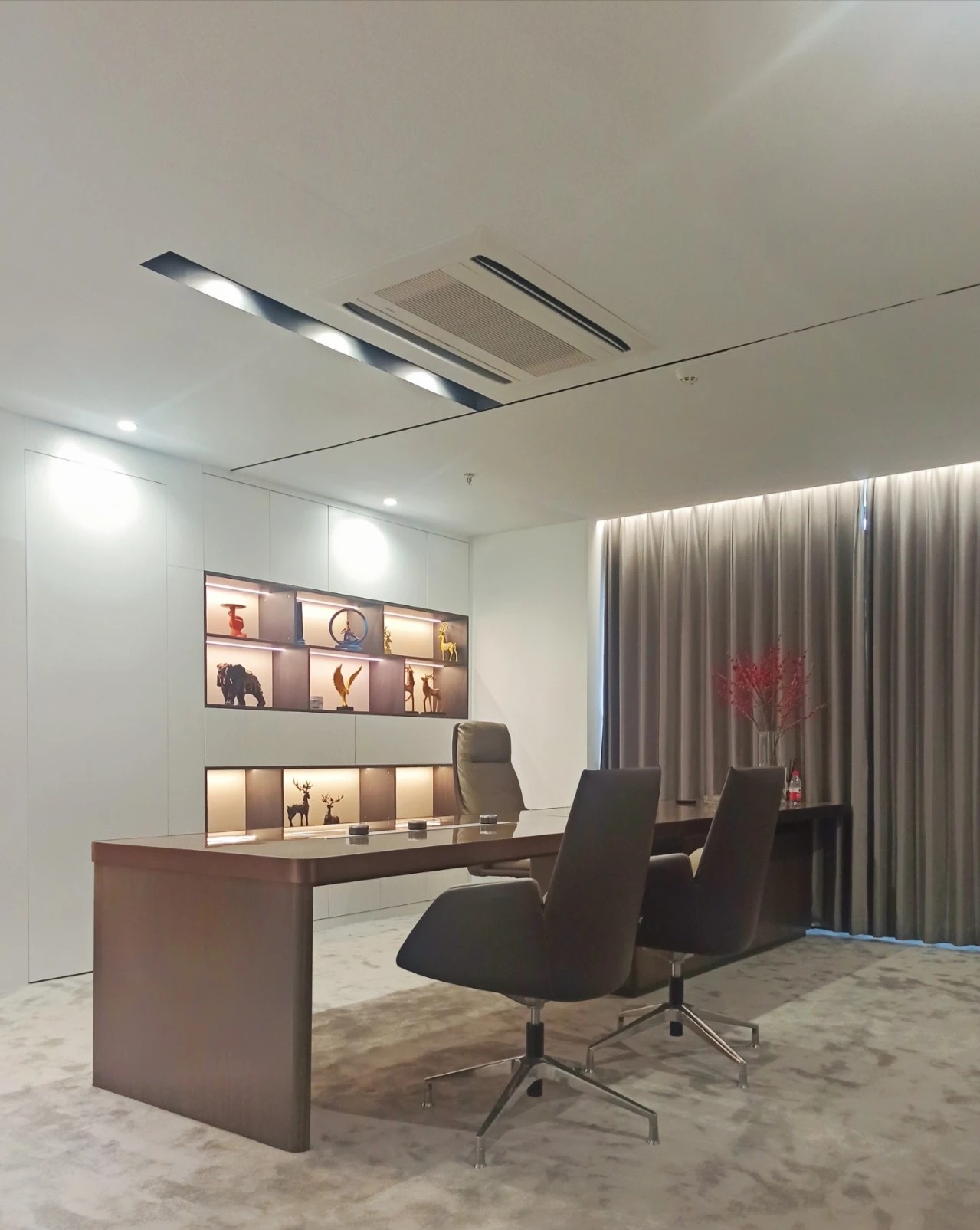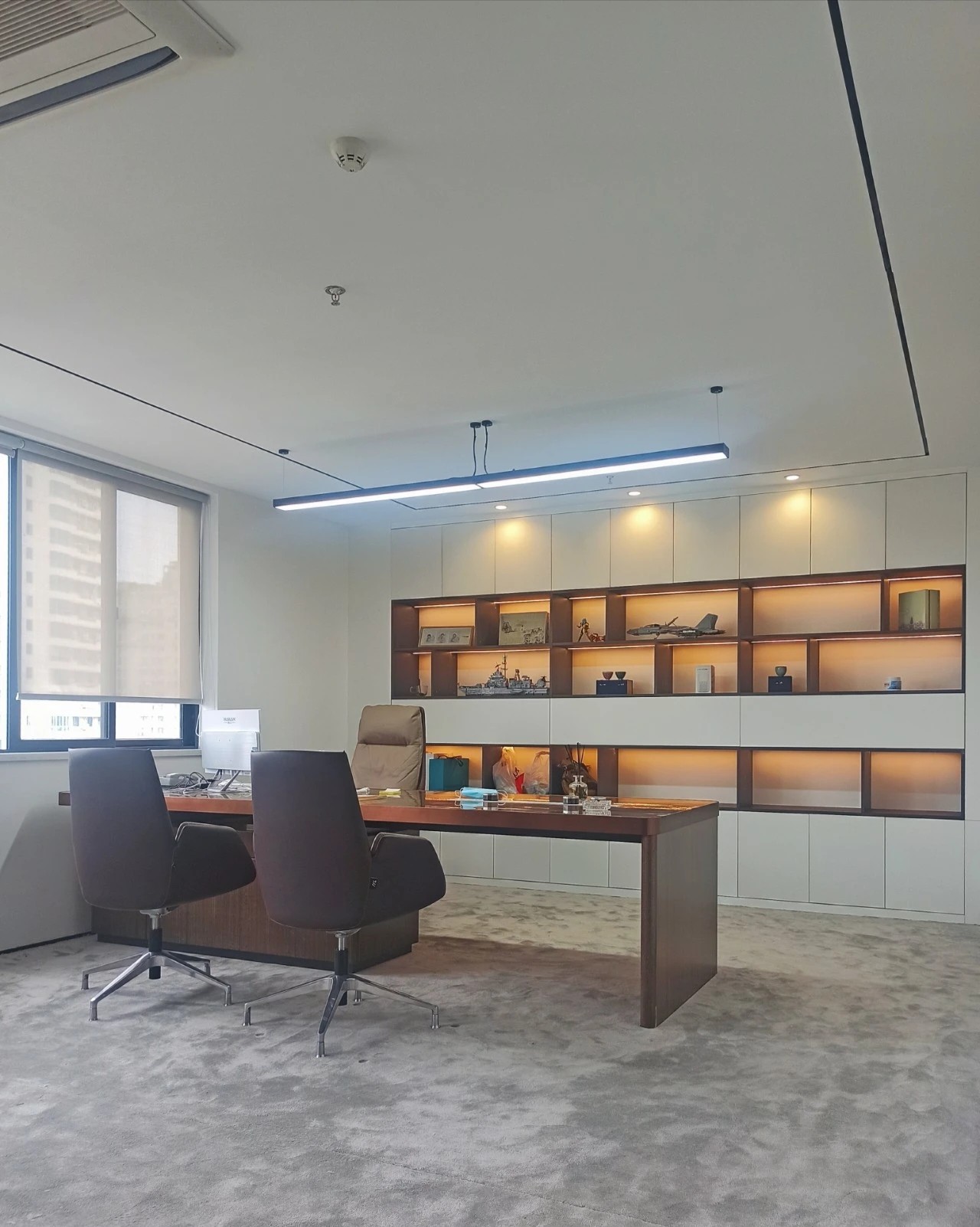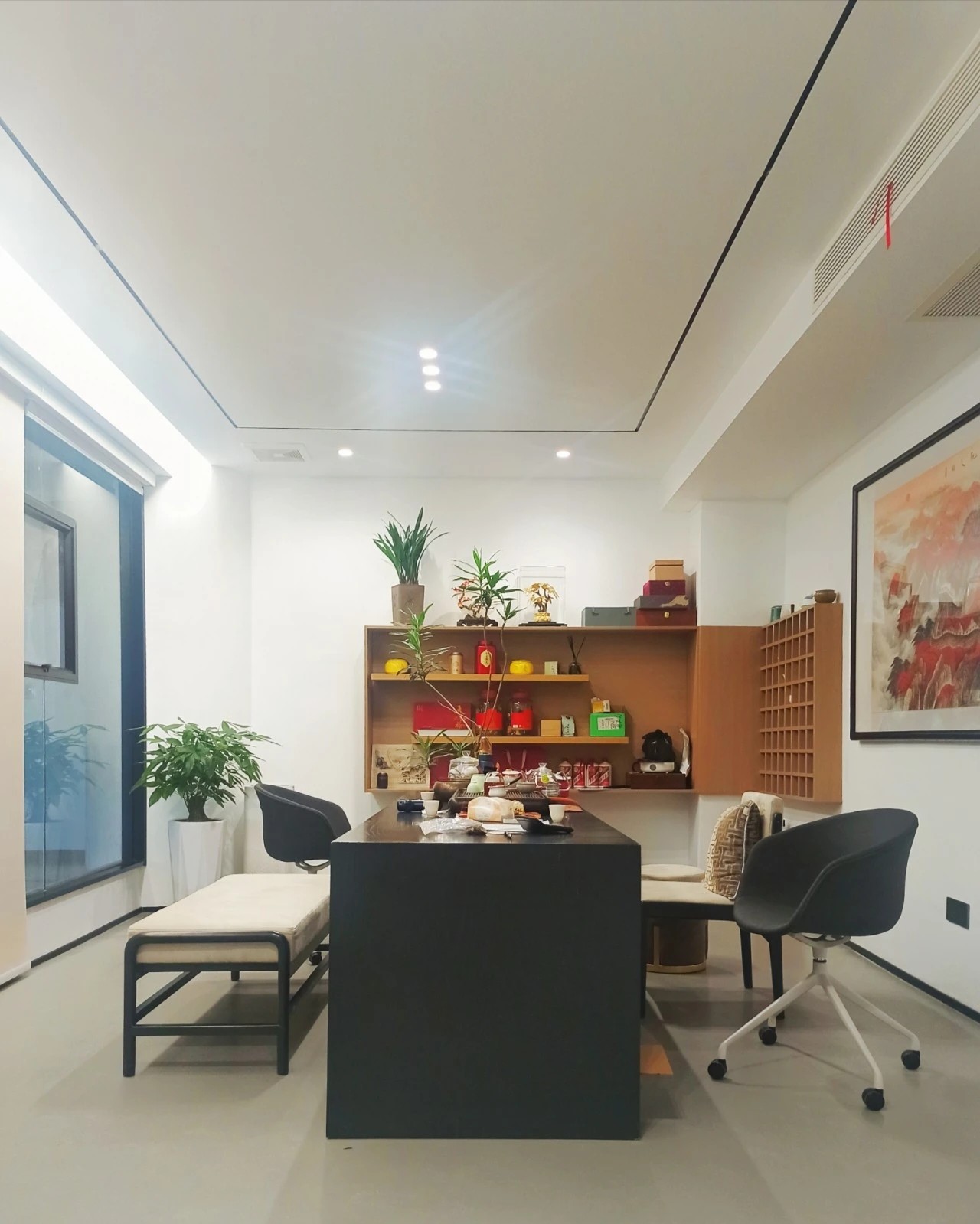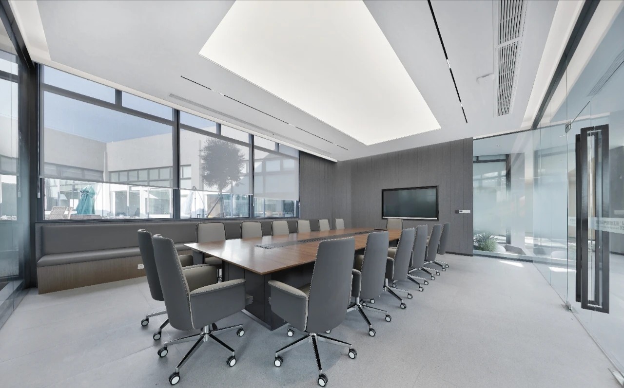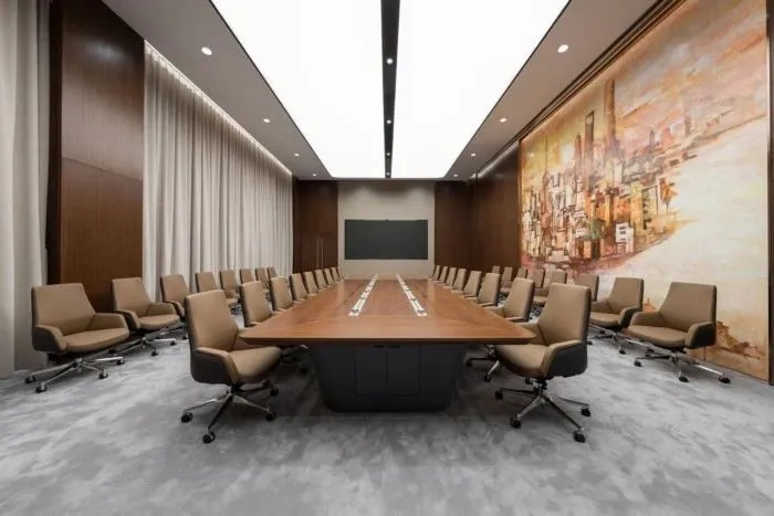 两间大小不等的会议室,呈现出两种不同的风格。其中一间会议室以黑色为主色调,更适合员工集中讨论,而另一间会议室则风格较为华丽,以棕色为主色调,墙壁上装饰着上海标志性建筑的图案,起到了一种温馨的氛围。在向访客强调组织的品牌形象方面发挥着重要作用。