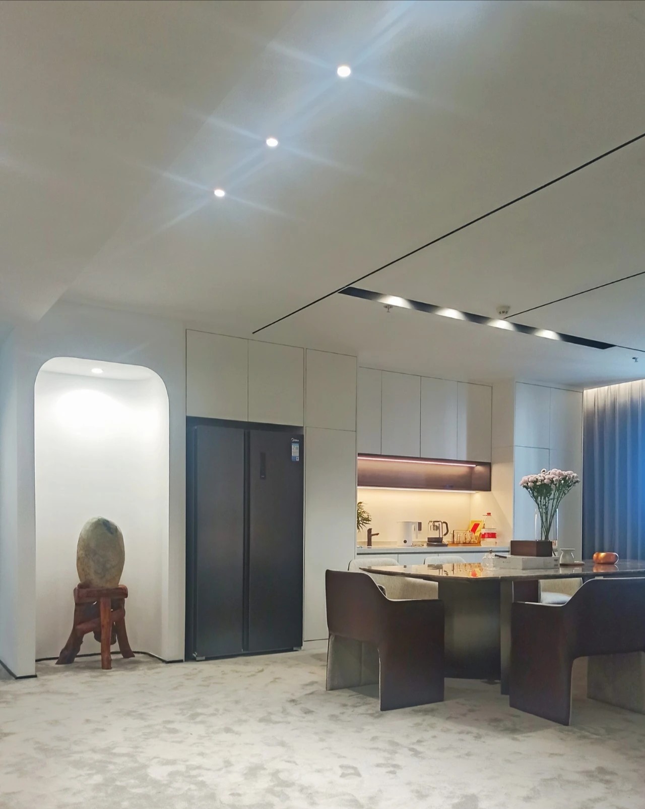 开放的前台,具有广阔的视野,白色、黑色和木质的颜色相互依赖,突出了平静和简单的风格。