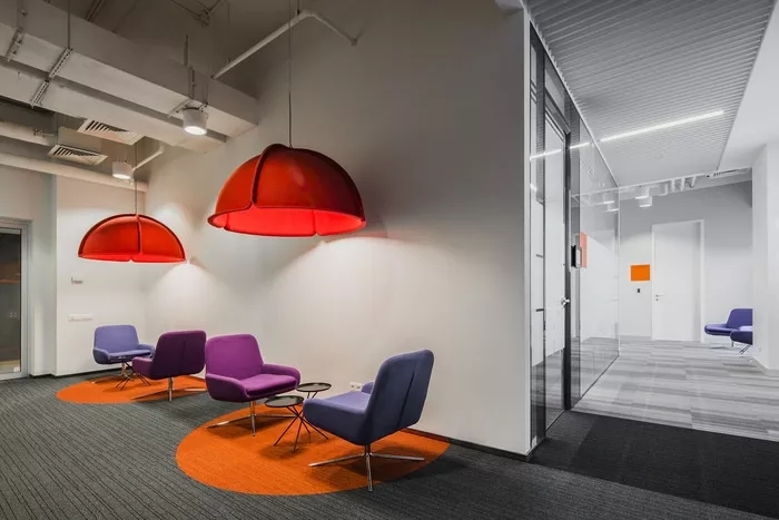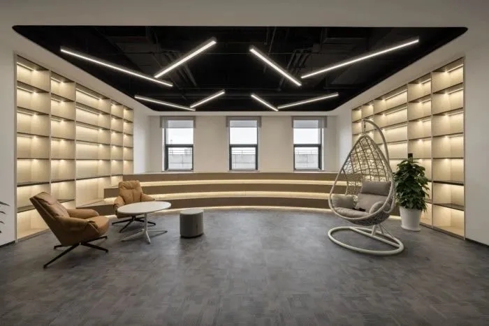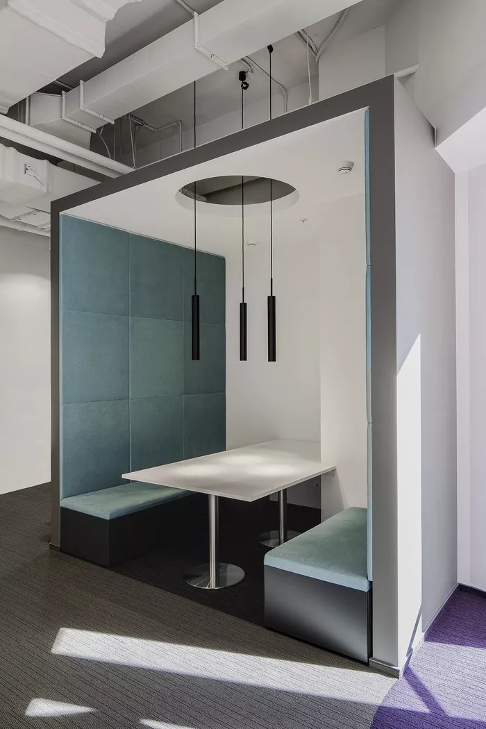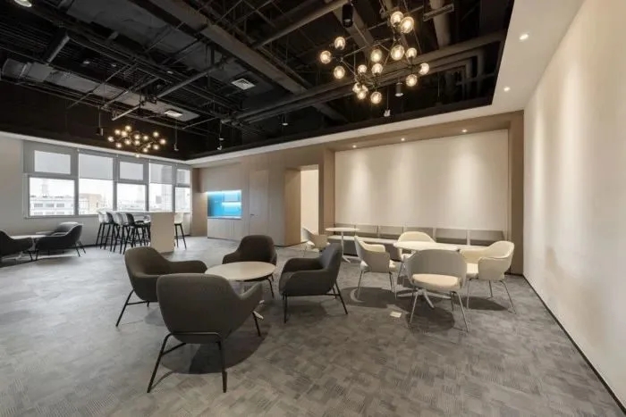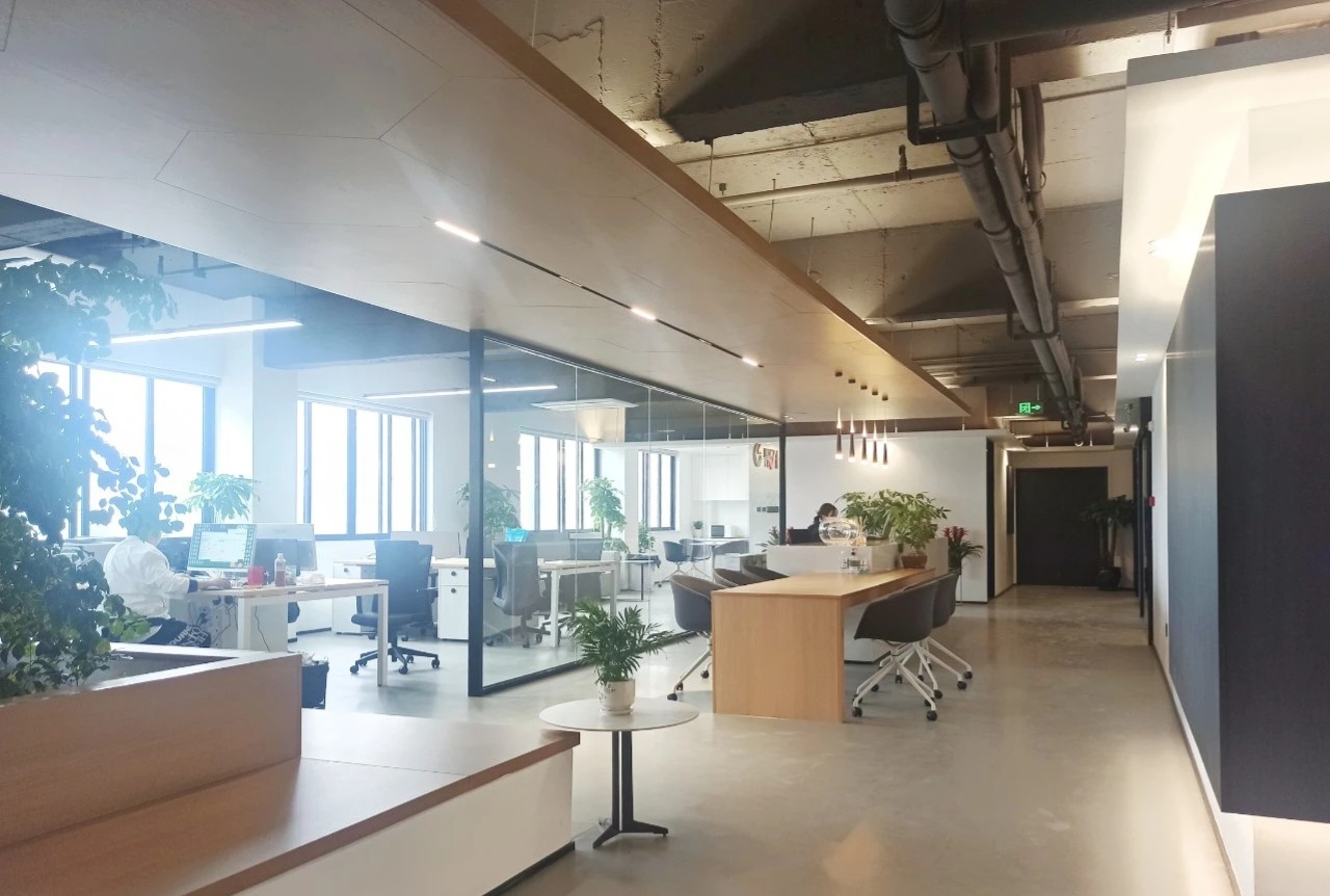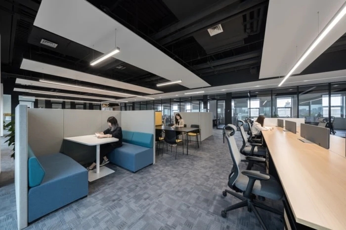 员工办公区域采用了一些玻璃隔断,让员工能够专注于工作,同时也增强了空间的通透性。在开放式工作站区域附近,安装了协作办公家具和隔音隔断,方便员工之间随时沟通。
