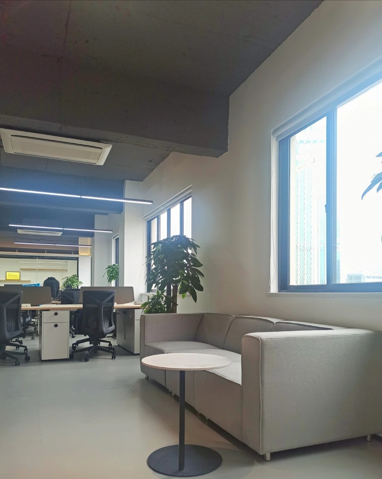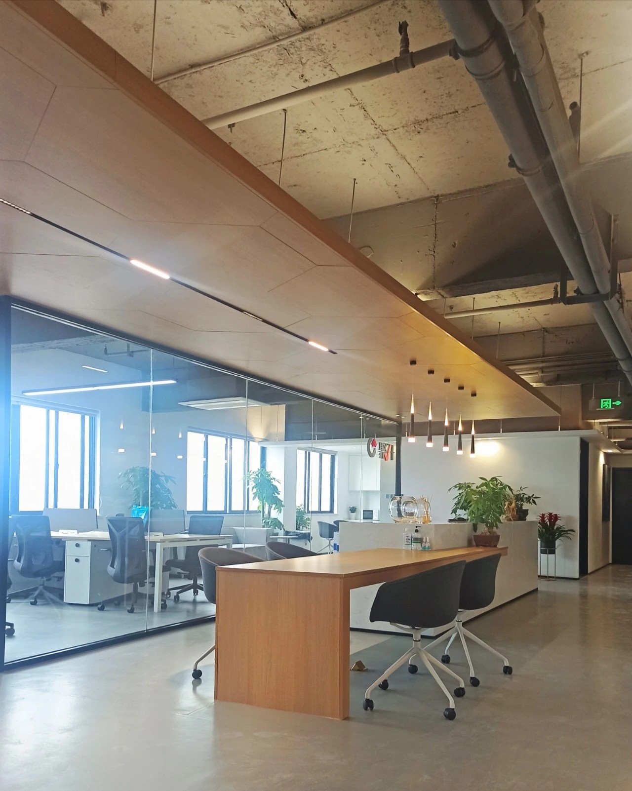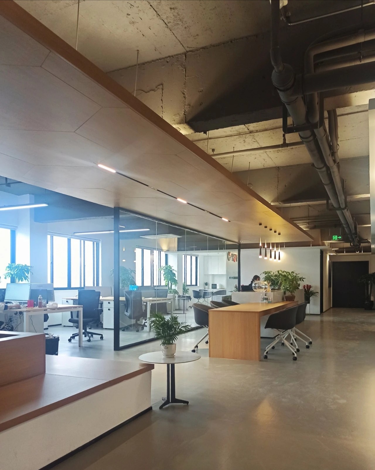 员工办公区域采用了一些玻璃隔断,让员工能够专注于工作,同时也增强了空间的通透性。在开放式工作站区域附近,安装了协作办公家具和隔音隔断,方便员工之间随时沟通。