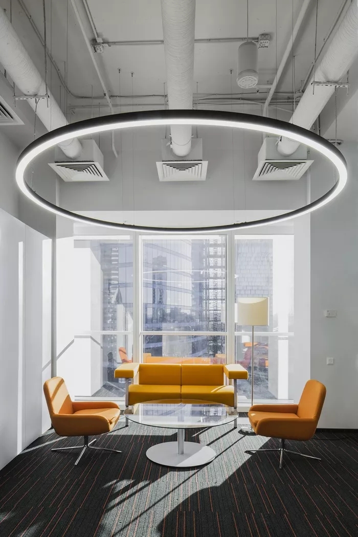 主色调为白色,从南至北,颜色依次由缃叶、橘黄渐变为琥珀、唐茶。以ABW理念创建的工作空间分为两个主要区域:安静的专注工作空间和活跃的社交空间。这两个区域的氛围营造通过不同的天花形式以及墙面色彩来构筑。公共空间在日常工作时间之外提供了更多的使用可能性,以提高空间的使用效率。