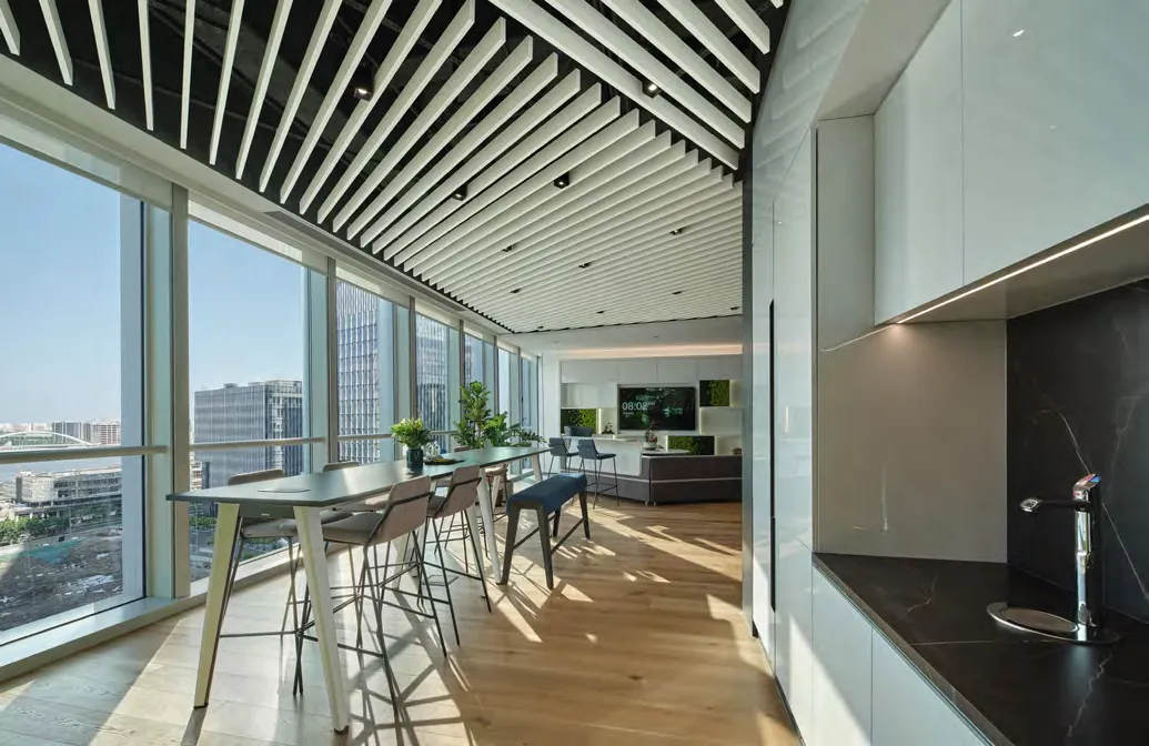 多功能活动区运用斜线分割空间,在天花与地面上使用不同的材质对动线与功能进行区分,增加空间的丰富度。另外,在布局设计时充分考虑利用自然光线引进多功能区和茶水区,为员工及访客提供明亮的空间环境,可以更放松愉悦地沟通交流。