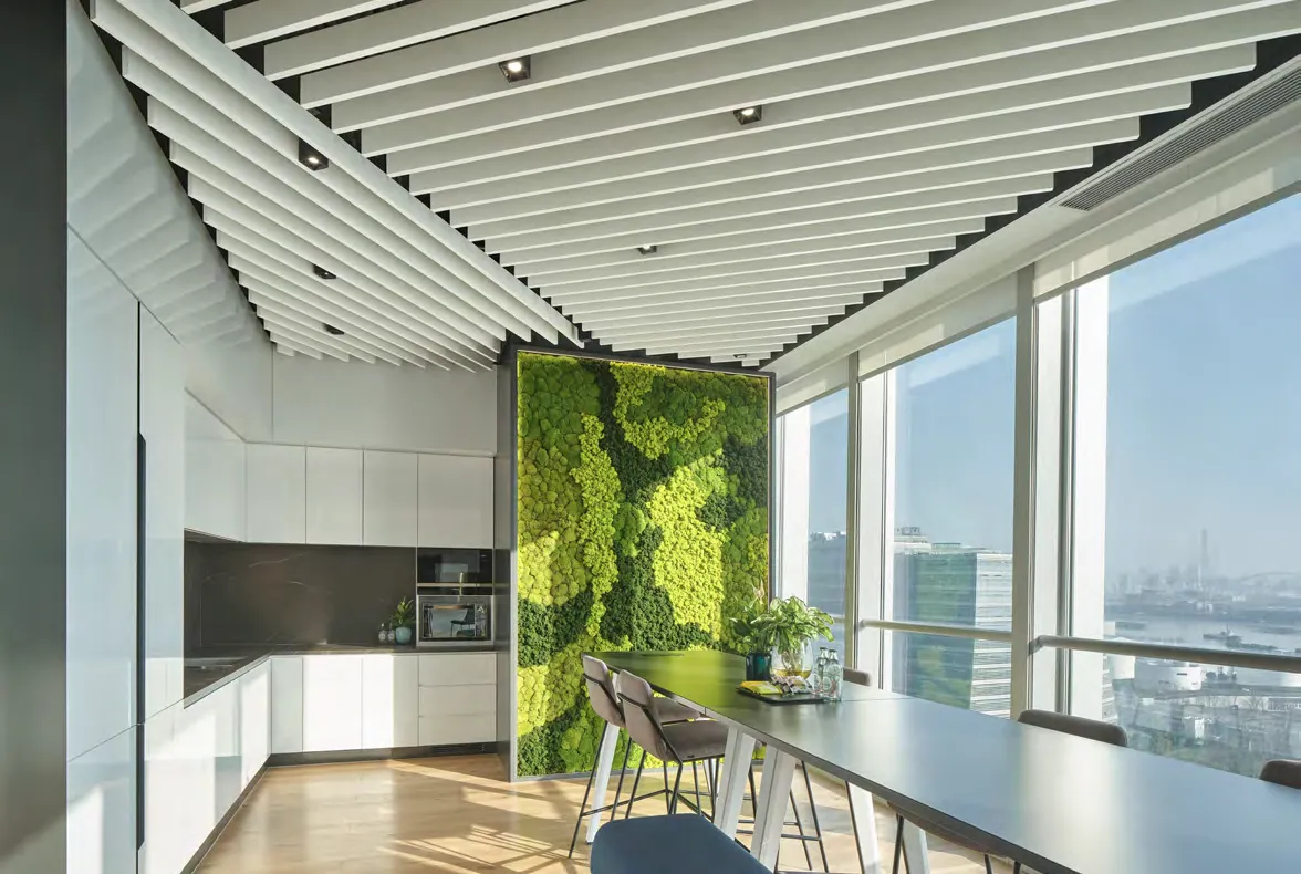 设计充分利用自然环境因素,打造轻松自然氛围。同时,几何元素在室内设计中的运用,呈现出了数字科技与人类智慧的完美融合。考虑到数字科技对于员工生产效率的帮助作用,引入了最先进的DALI灯光控制系统,将照明和场景化融入办公环境,系统根据不同的时间和工作需求,自动调节光线亮度,让员工在不同的工作状态下都能享受到最佳的灯光环境。