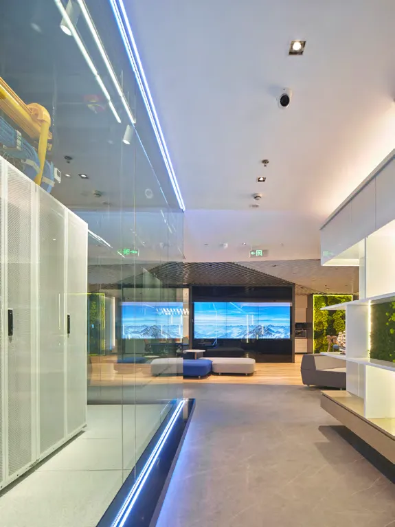 为了体现量博对于数据存储等方面的专业实力,展示机房特意设计于公司的核心位置与多功能活动区双联,通过透明玻璃展示窗、整齐有序放置的机柜网络线、科技蓝氛围灯带勾勒轮廓,使整个机房宛如心脏一般嵌入在整体空间中。