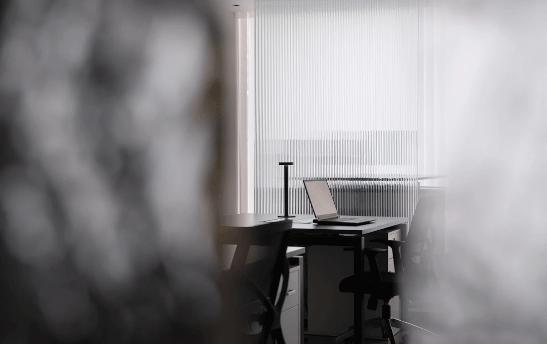 北侧与大厦电梯厅相通,适合开放的公共空间,方便访客接待和来访会议;南侧相对高的私密性更适合办公功能。走出电梯厅,映入眼帘的是通透且“悬浮”的公司标识墙,为实现完美的悬浮效果,不做任何排线,由亚克力logo借助四周投射光完成导光并发光,四边透光的金属冲孔板,散发出神秘的蓝色氛围光,就像通向未来的时空隧道,通过双层玻璃隔墙在视觉上与多功能活动区贯通。