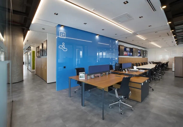 在开放的办公区域,除了供长期在办公室工作的员工使用的工作站之外,还增加了一些供外勤人员访问和在办公室工作时使用的通用工作台。经理室的面积在10-12平方米之间,位于整个办公室的正面。办公室里有2个不同容量的会议室,在区域的中心还有一个多功能的房间,可以用作社交区和会议室。