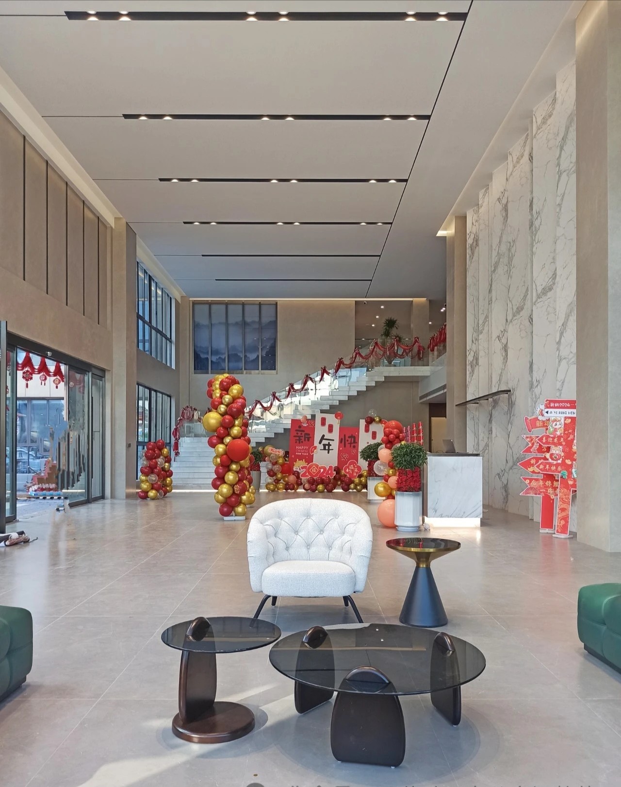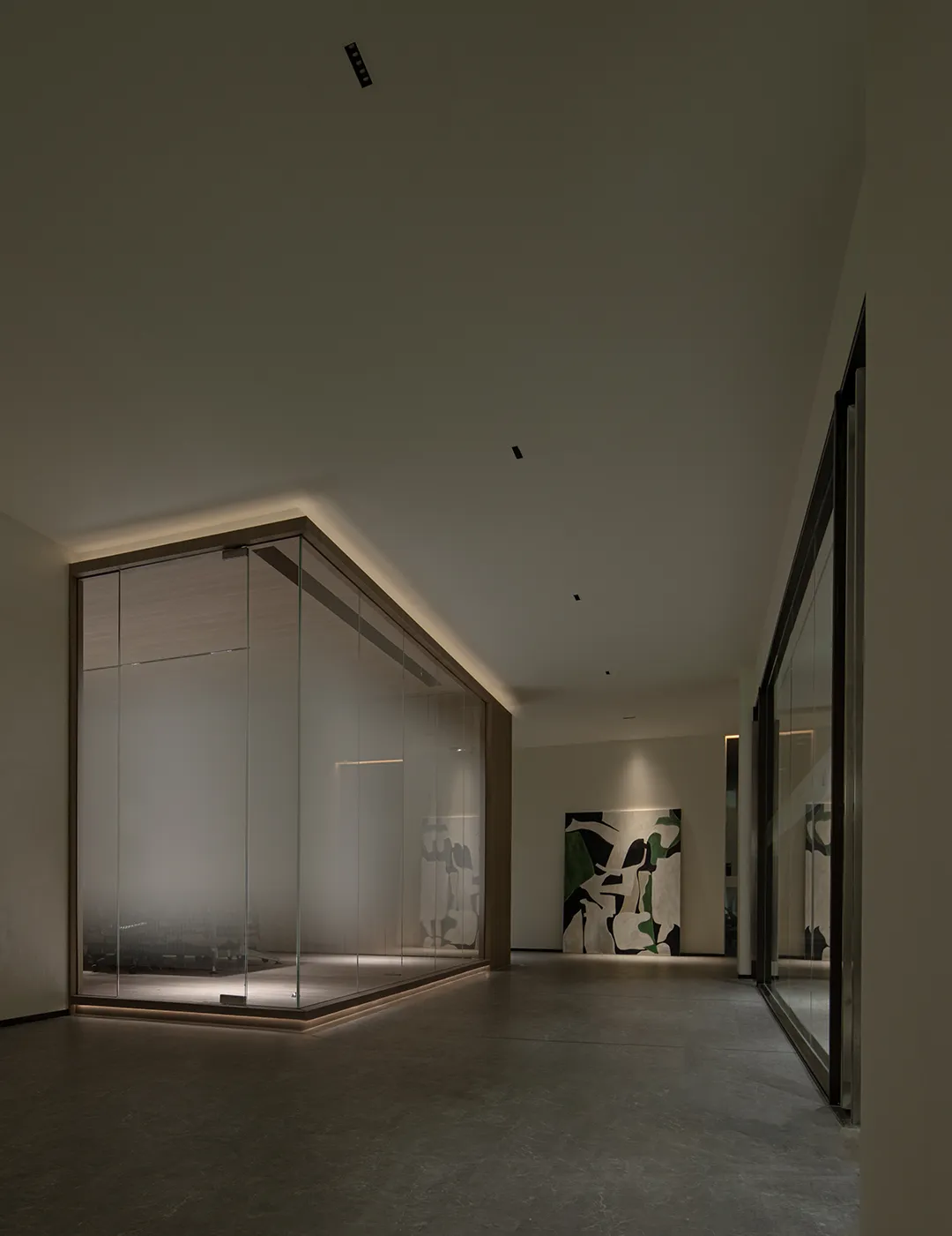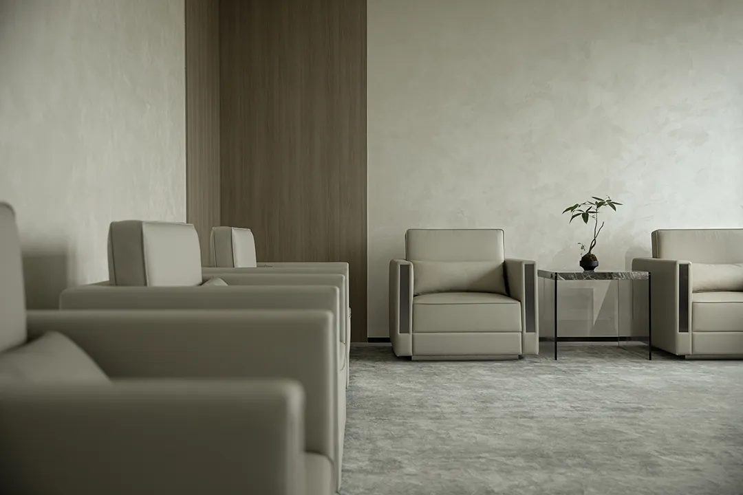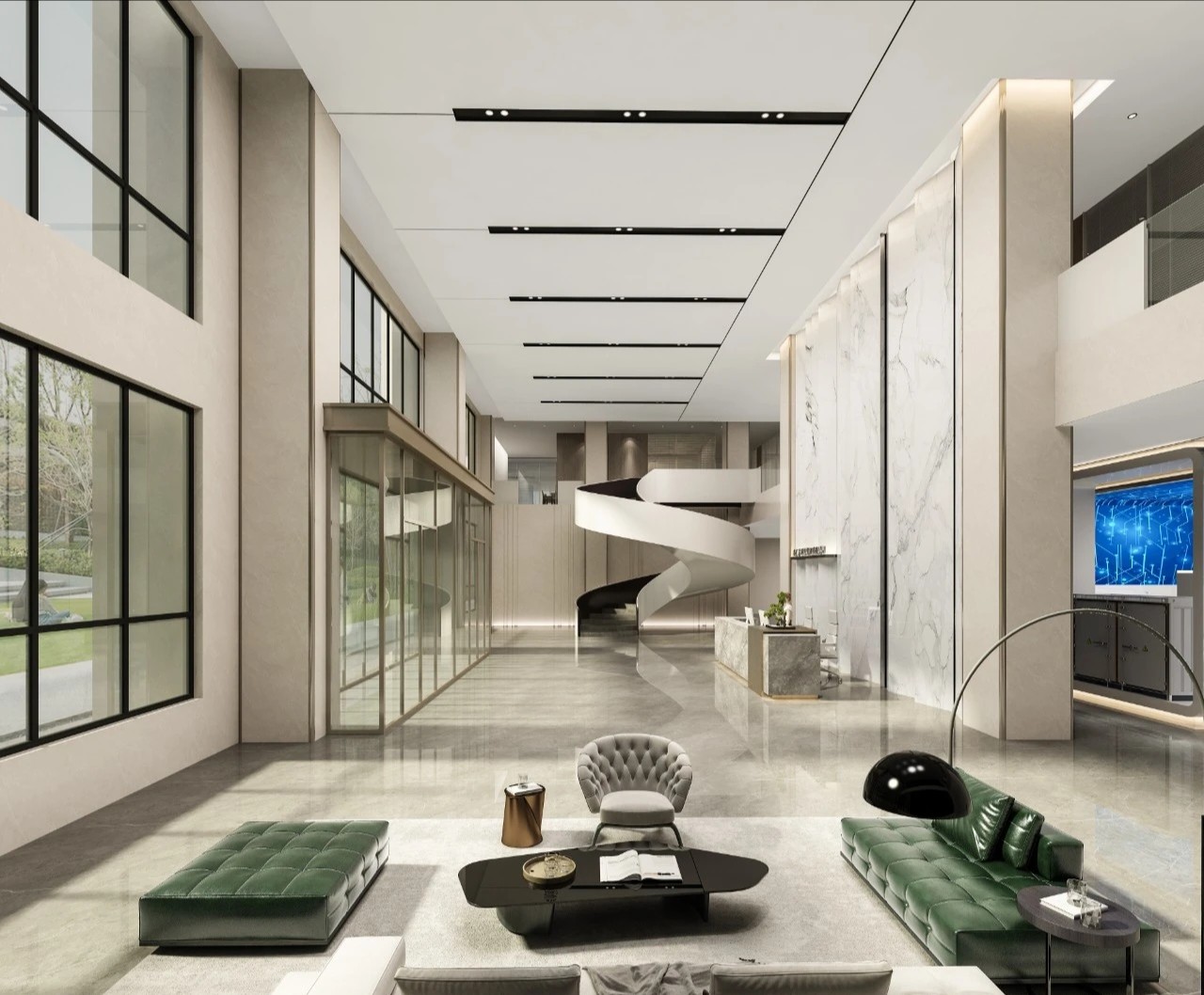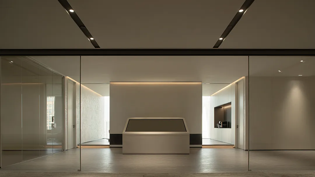 接待前厅的整体色调以冷静克制的大面积中性灰色为主,配合亮眼的白色水磨石、平整大板面银灰色金属网,带有鲜明的现代工业风格冲击力。大尺度的人造石接待台构成利落的方正体块,在简洁的线条灯光作用下,打造空间纯粹的秩序感。
