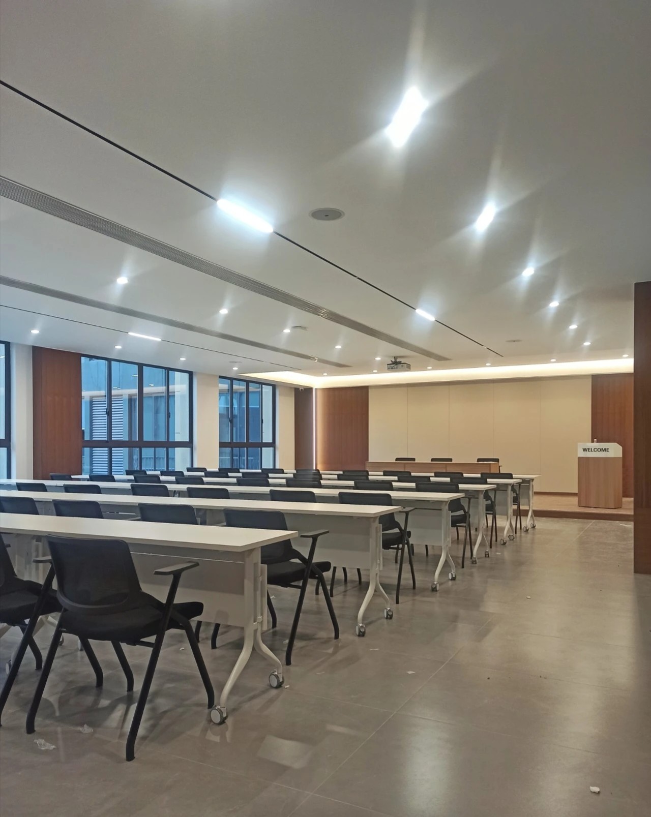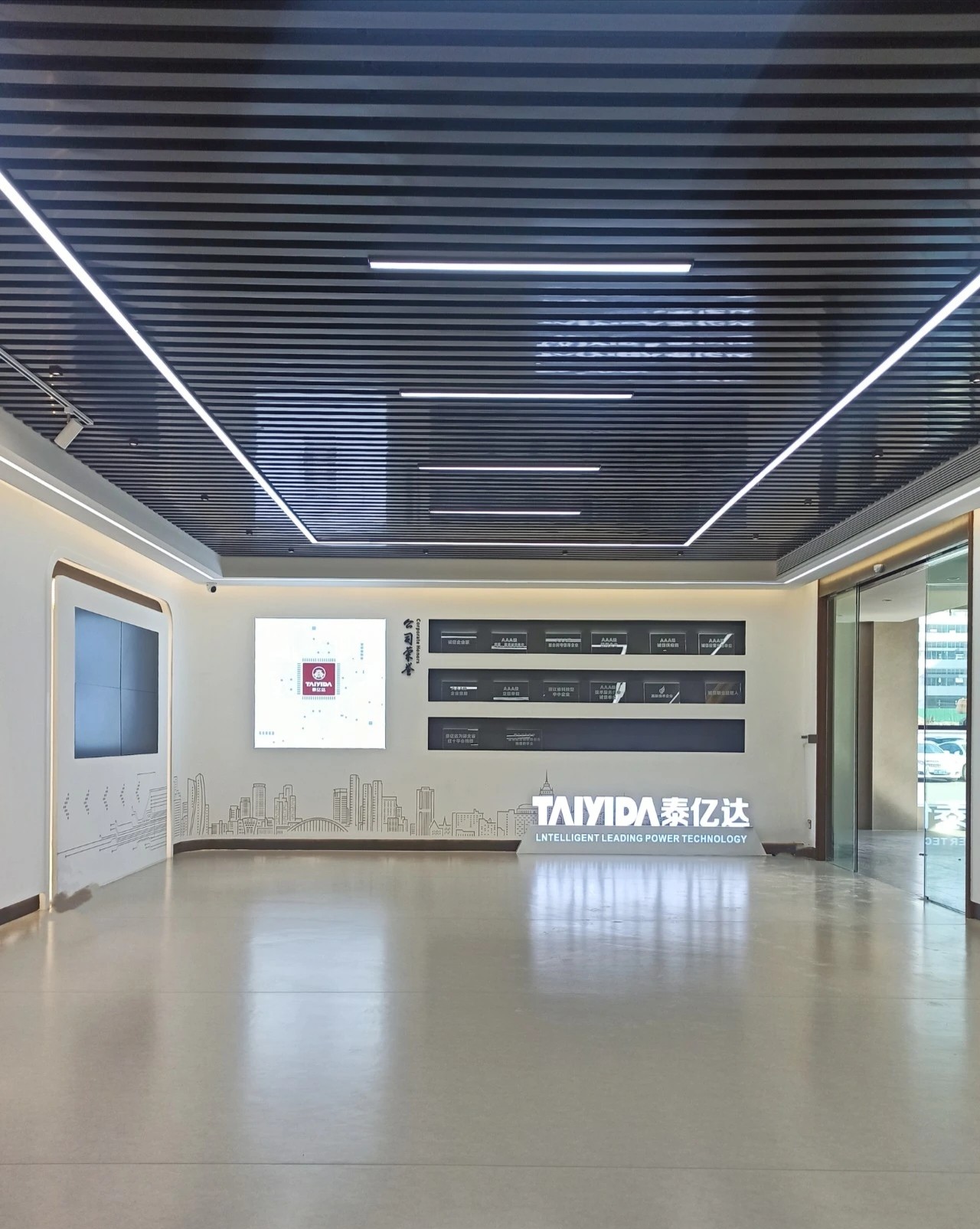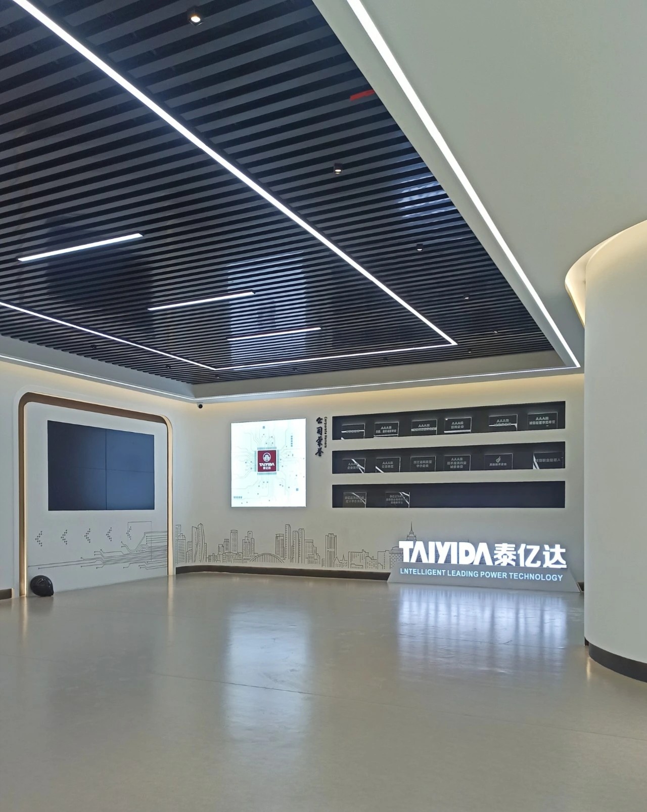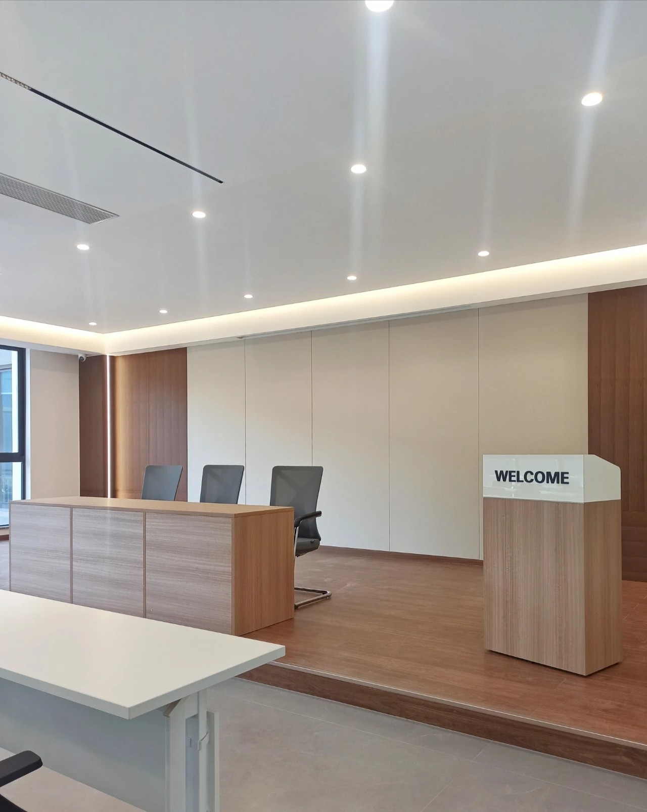 接待前厅的整体色调以冷静克制的大面积中性灰色为主,配合亮眼的白色水磨石、平整大板面银灰色金属网,带有鲜明的现代工业风格冲击力。大尺度的人造石接待台构成利落的方正体块,在简洁的线条灯光作用下,打造空间纯粹的秩序感。