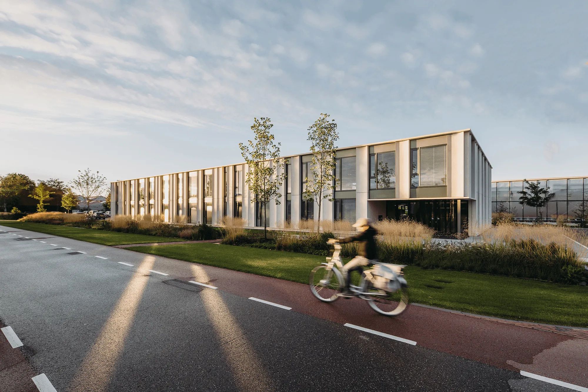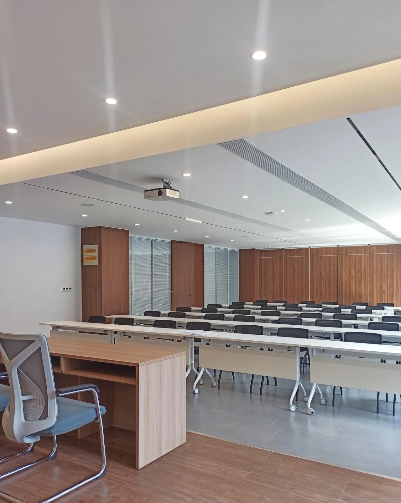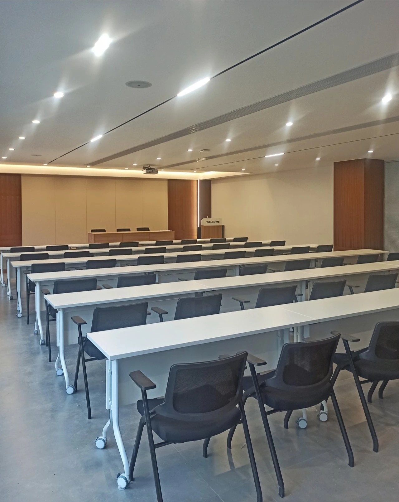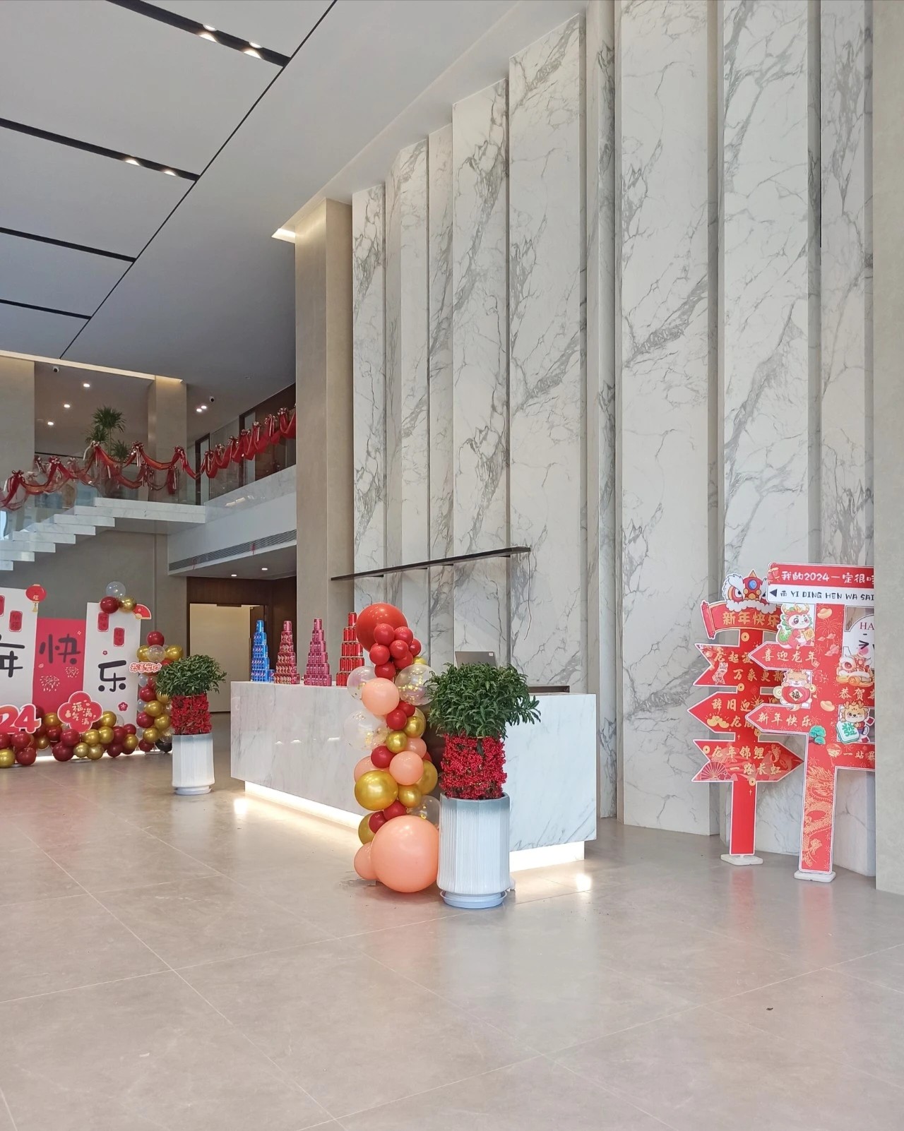 接待前厅的整体色调以冷静克制的大面积中性灰色为主,配合亮眼的白色水磨石、平整大板面银灰色金属网,带有鲜明的现代工业风格冲击力。大尺度的人造石接待台构成利落的方正体块,在简洁的线条灯光作用下,打造空间纯粹的秩序感。