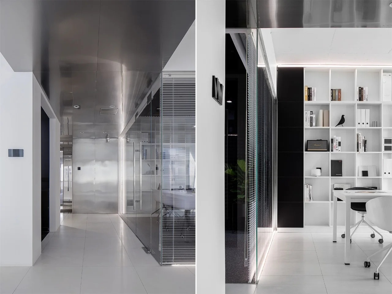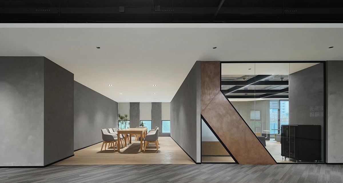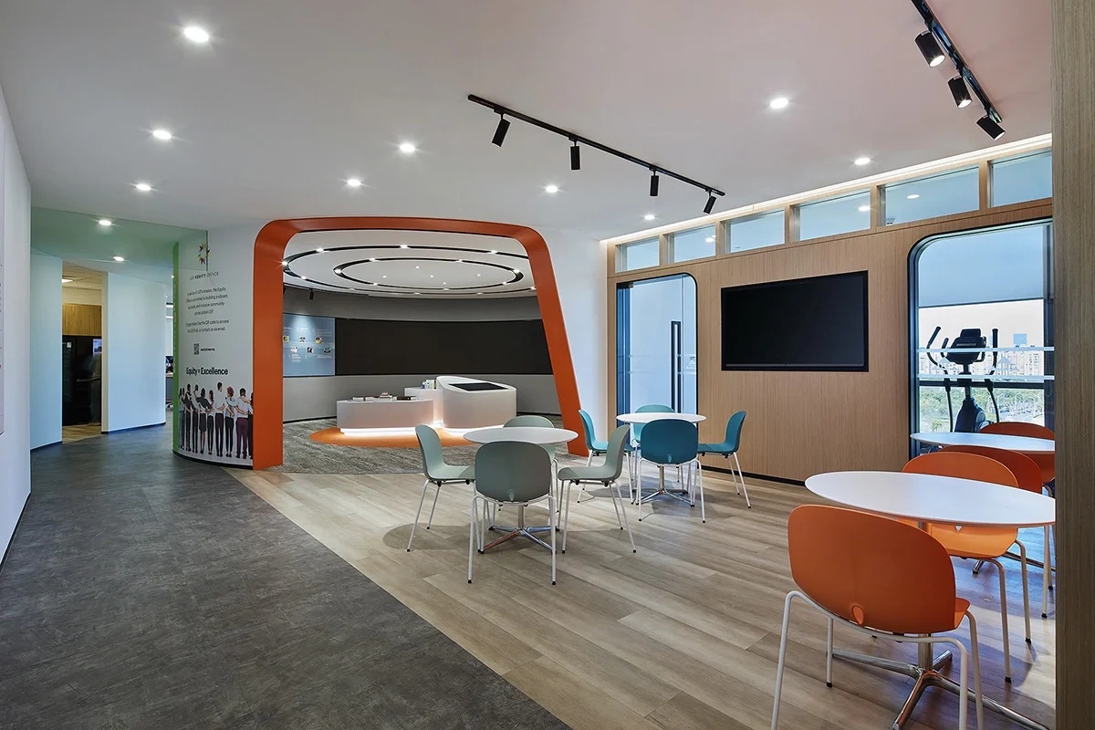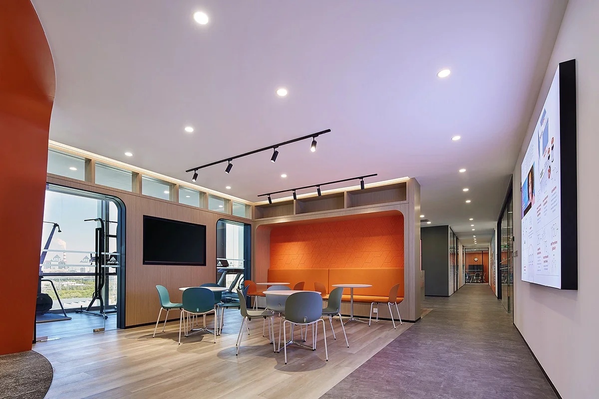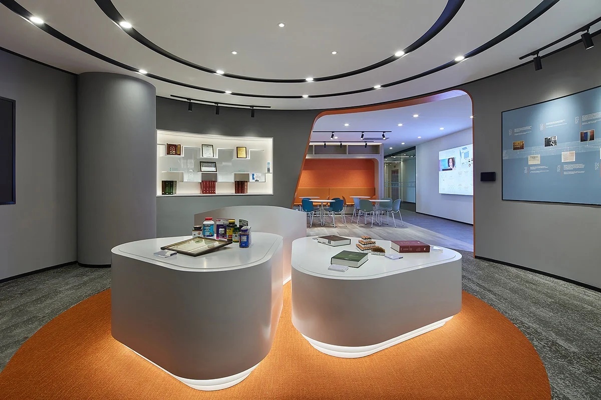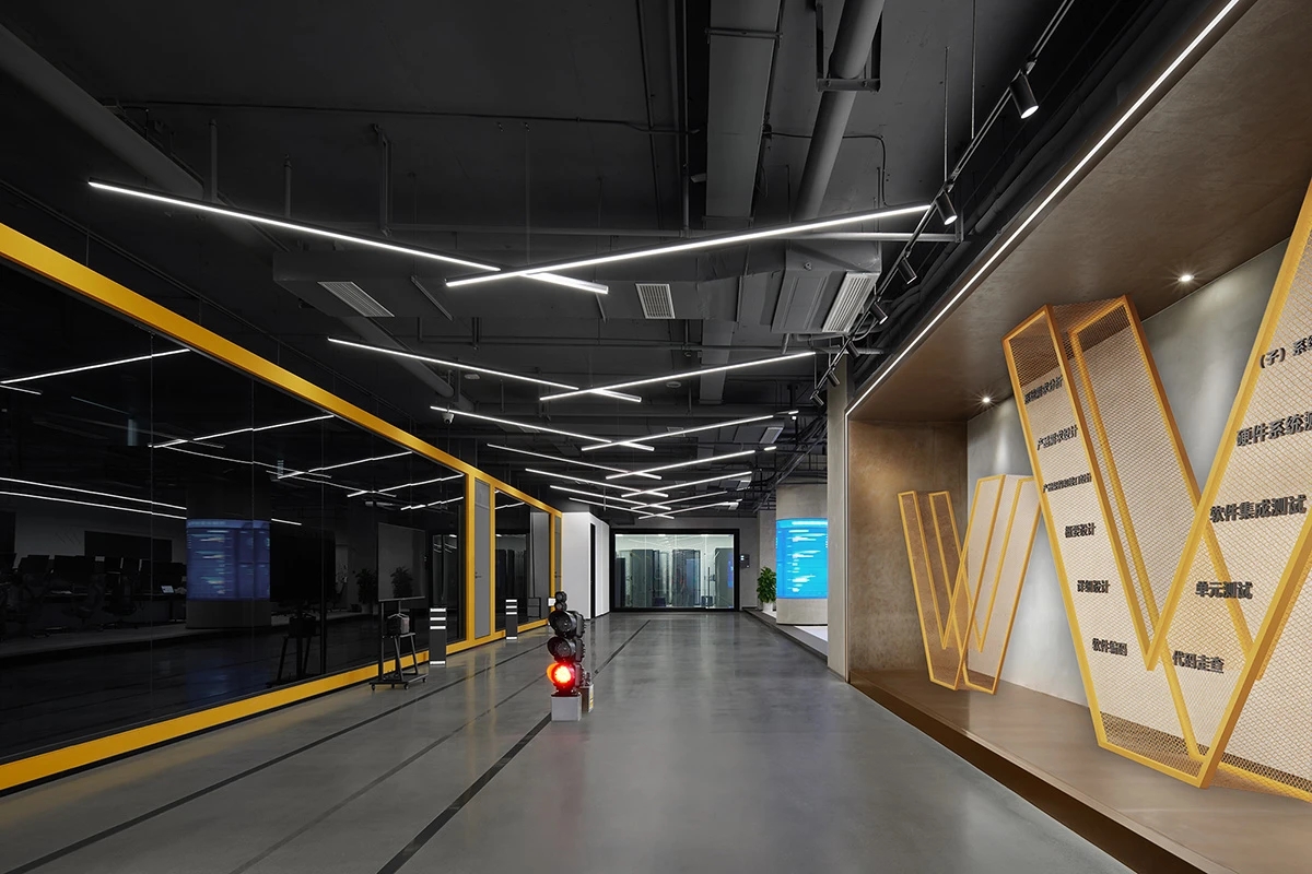 穿过闸机口,进入的是整个轨行区,设计团队意在现场通过火车头、模拟轨道、交通指示灯等打造一个实地操控体验场景,动态化的展示轨道运行的实际控制成果。而在指示办公区则是设计了360°的弧形屏实时更新展示项目进度,将科技元素融入到每一个角落,整个轨行操作区域用黄色的金属元素进行联合点缀,彩色的钢网与深色的裸顶形成色彩对比,从而将视觉重心聚焦到轨道运行区。