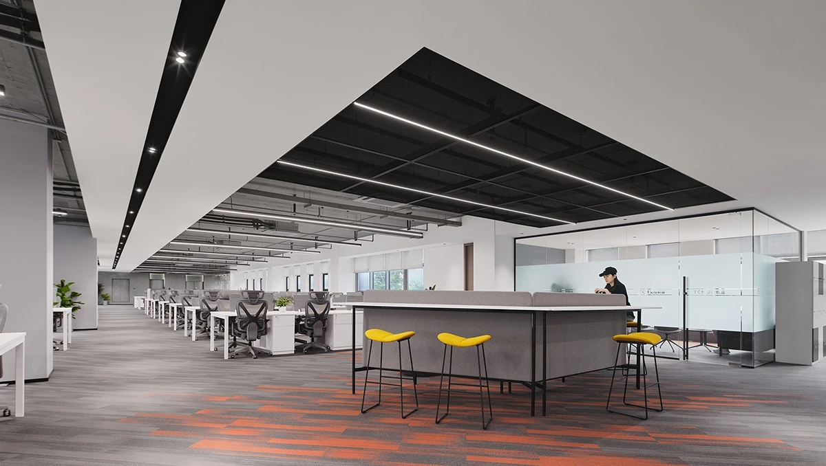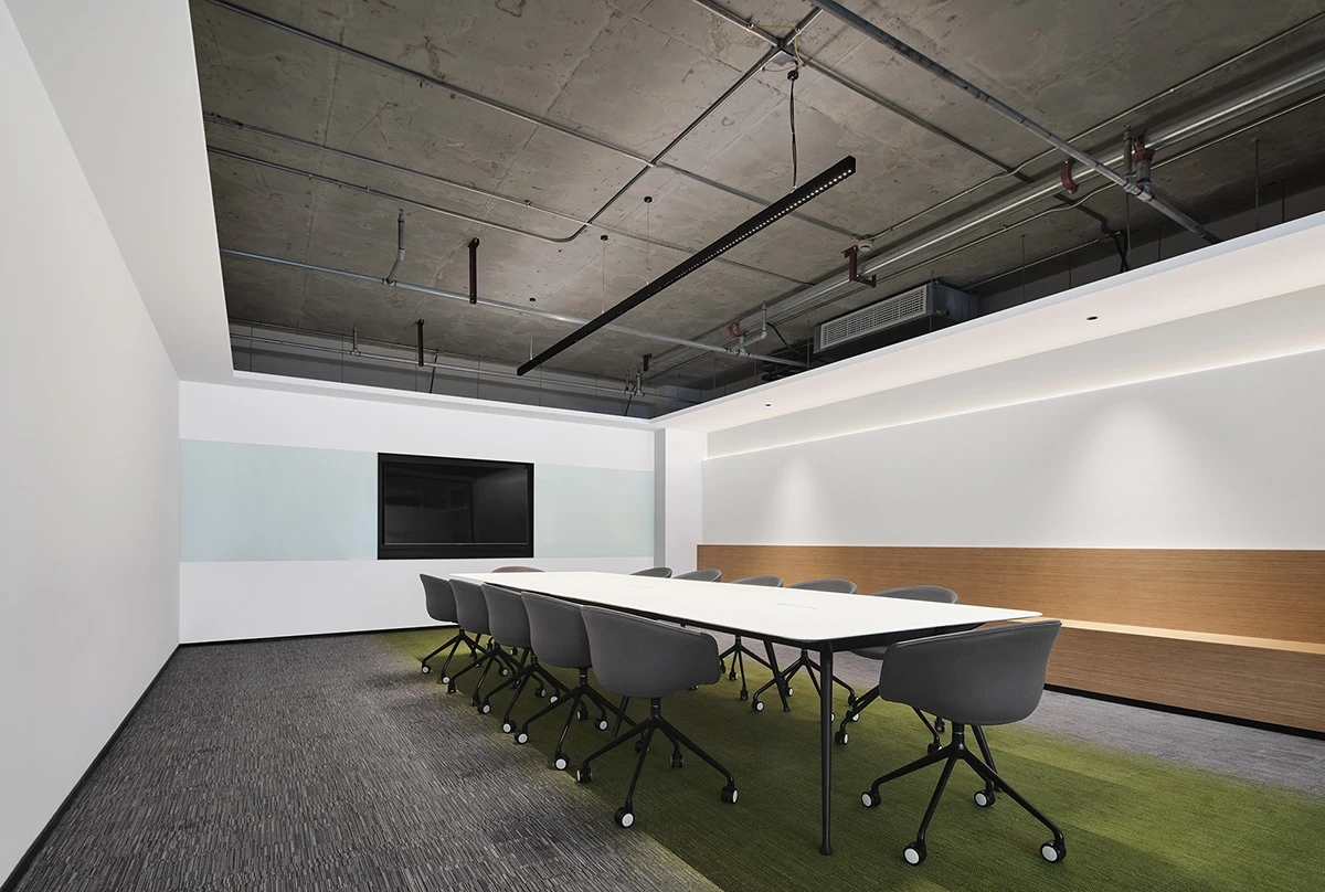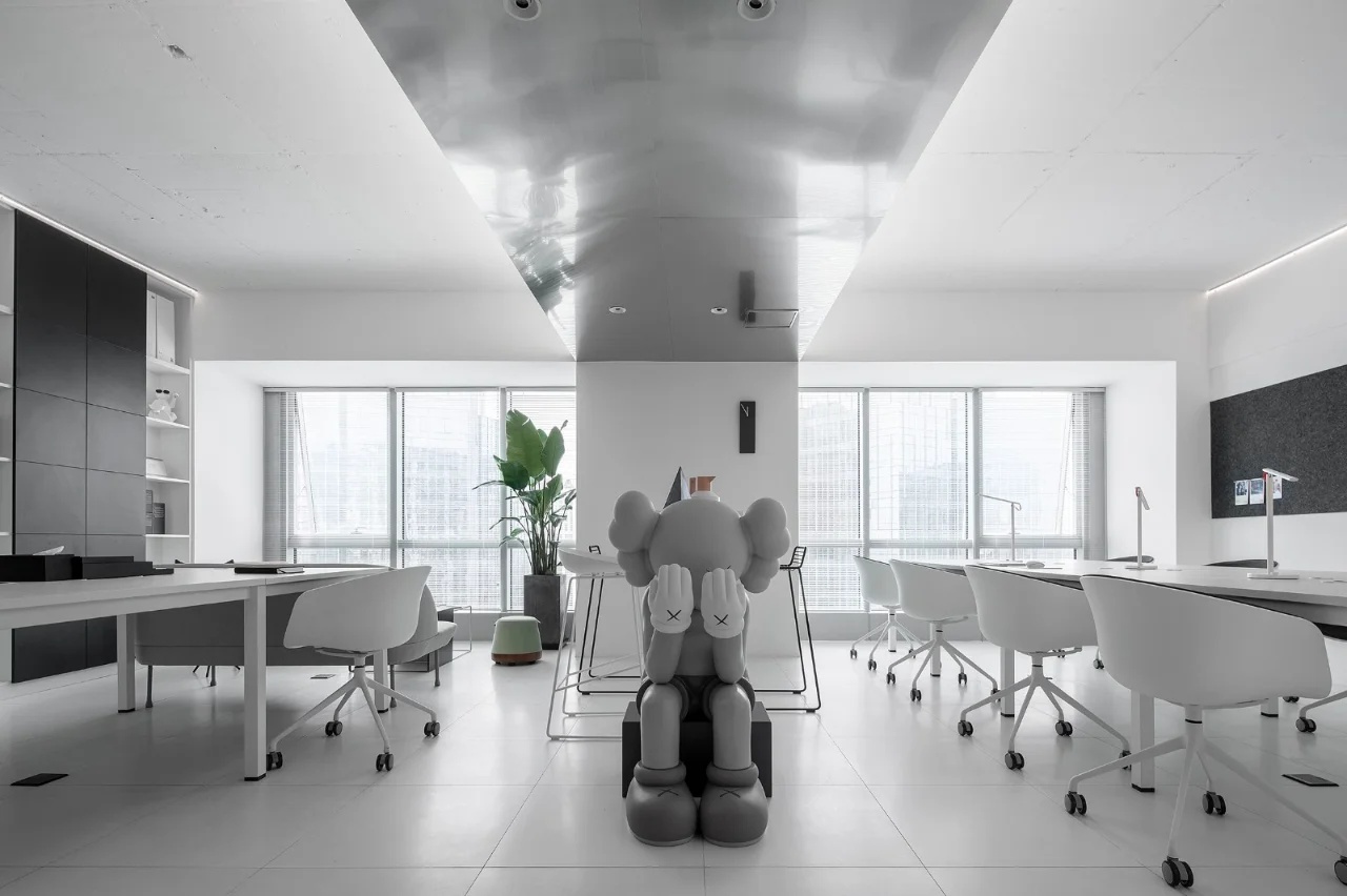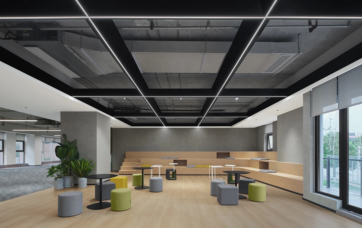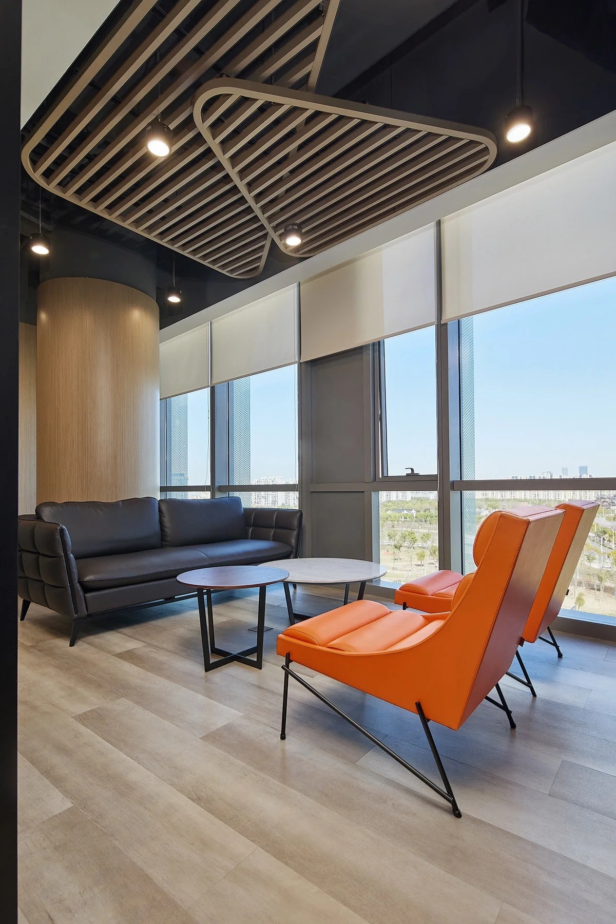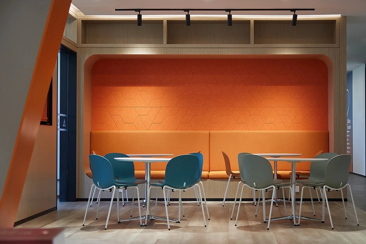 穿过闸机口,进入的是整个轨行区,设计团队意在现场通过火车头、模拟轨道、交通指示灯等打造一个实地操控体验场景,动态化的展示轨道运行的实际控制成果。而在指示办公区则是设计了360°的弧形屏实时更新展示项目进度,将科技元素融入到每一个角落,整个轨行操作区域用黄色的金属元素进行联合点缀,彩色的钢网与深色的裸顶形成色彩对比,从而将视觉重心聚焦到轨道运行区。