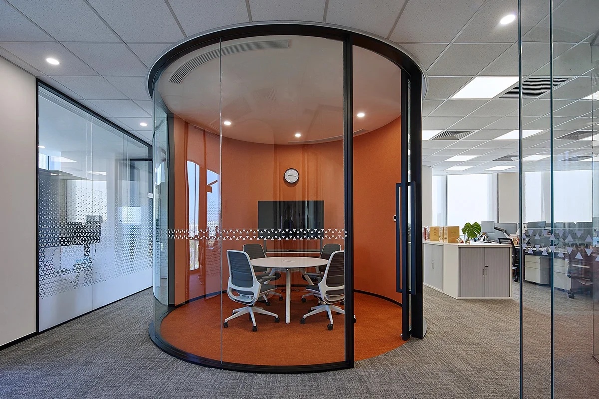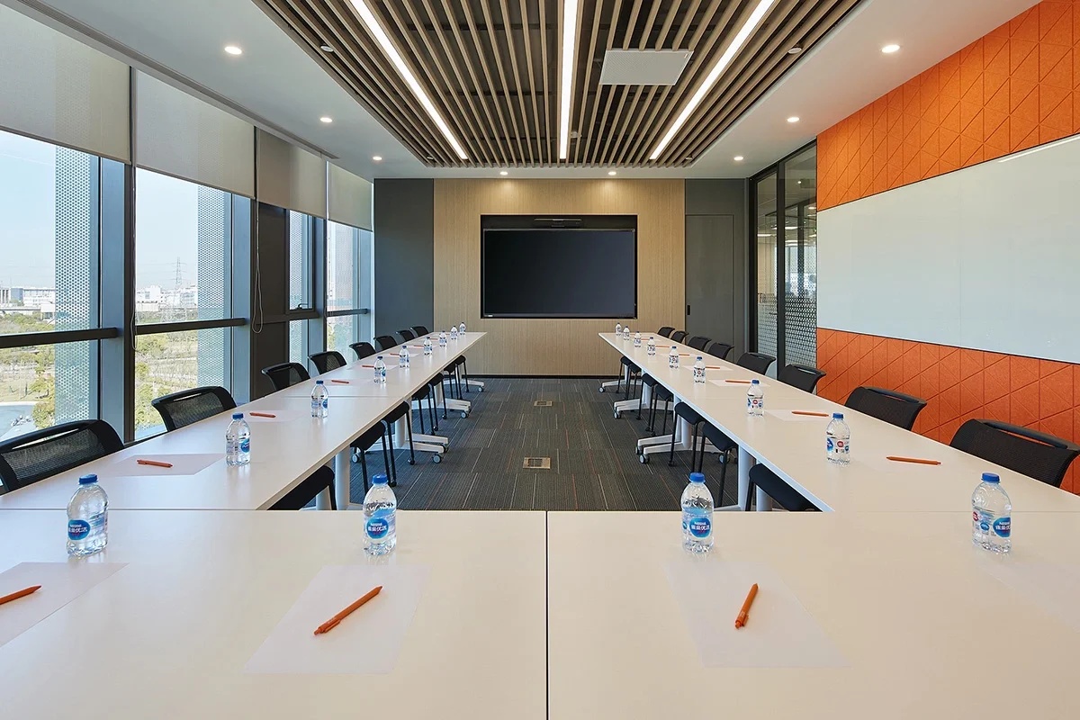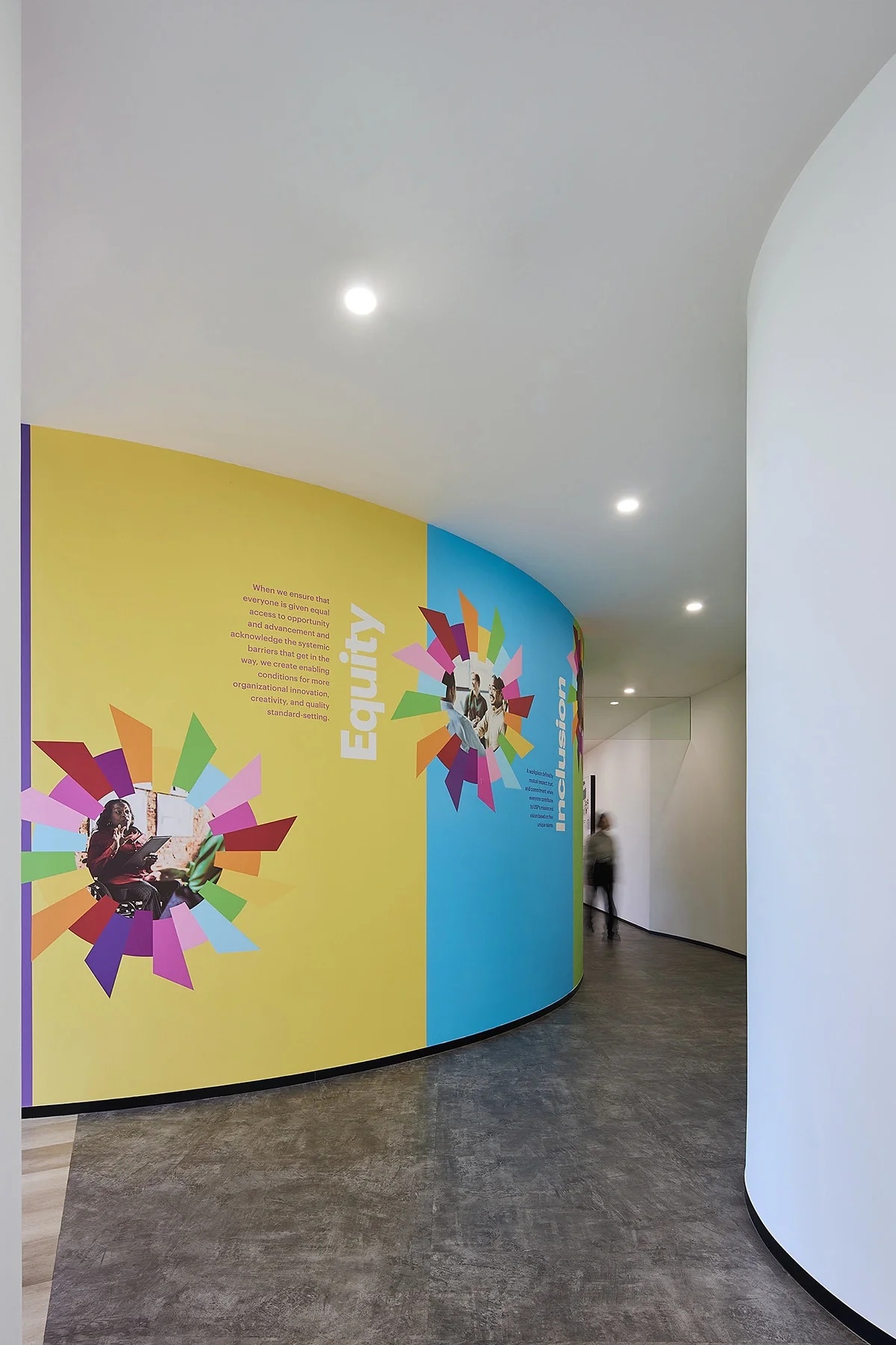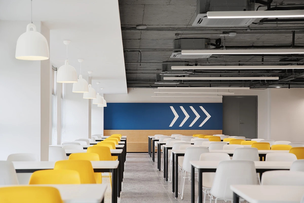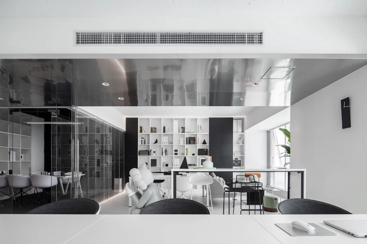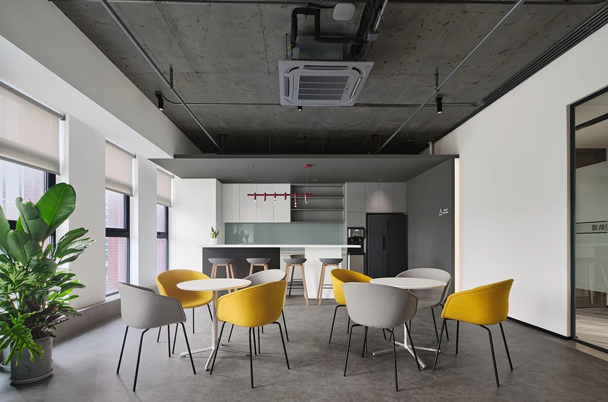 穿过闸机口,进入的是整个轨行区,设计团队意在现场通过火车头、模拟轨道、交通指示灯等打造一个实地操控体验场景,动态化的展示轨道运行的实际控制成果。而在指示办公区则是设计了360°的弧形屏实时更新展示项目进度,将科技元素融入到每一个角落,整个轨行操作区域用黄色的金属元素进行联合点缀,彩色的钢网与深色的裸顶形成色彩对比,从而将视觉重心聚焦到轨道运行区。