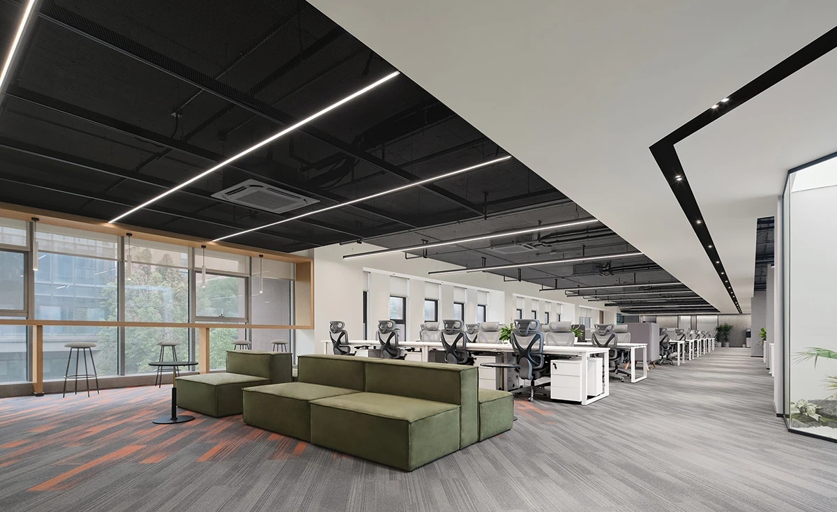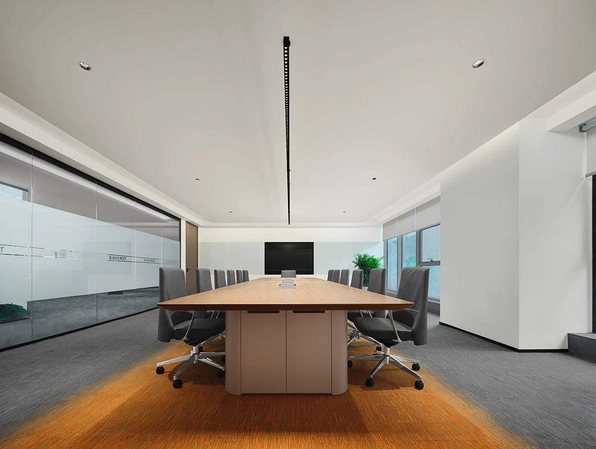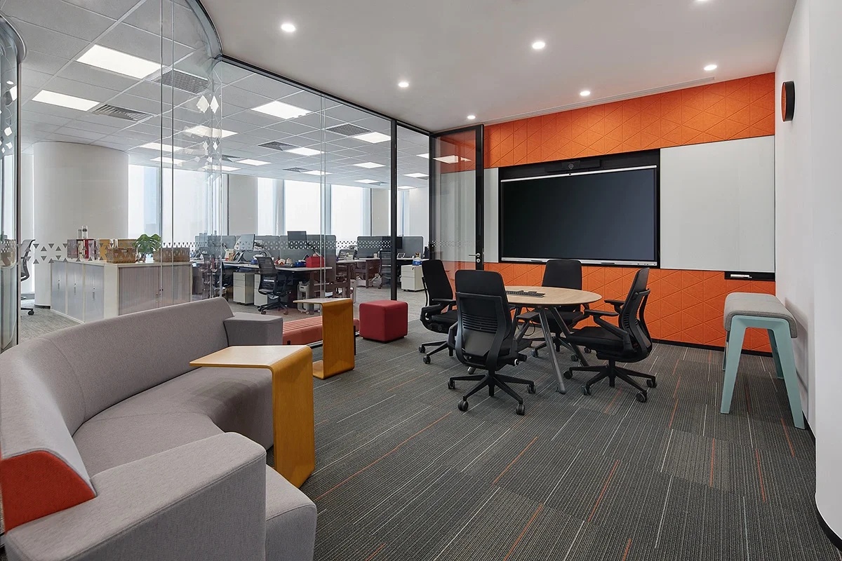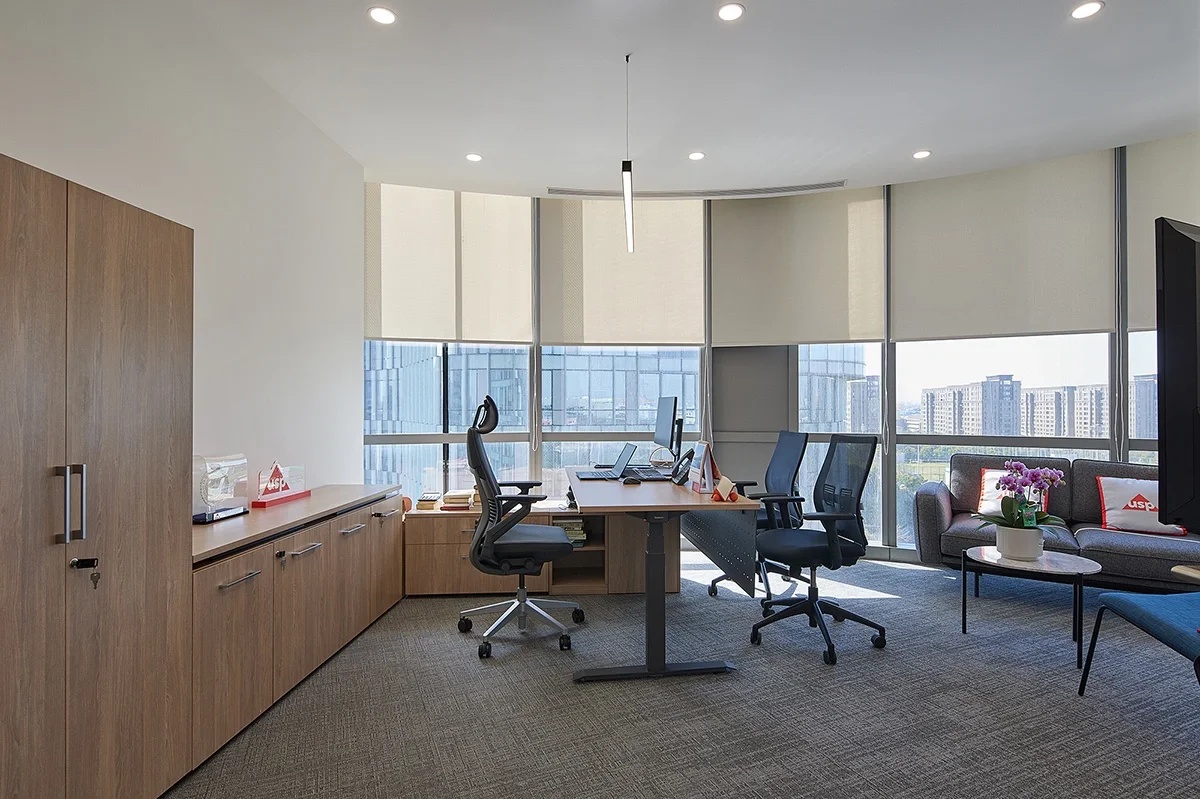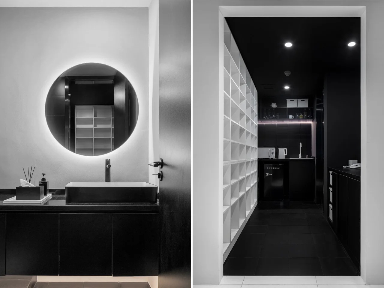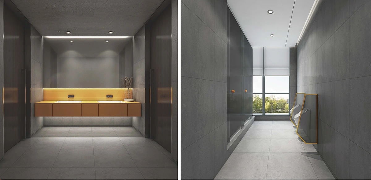 穿过闸机口,进入的是整个轨行区,设计团队意在现场通过火车头、模拟轨道、交通指示灯等打造一个实地操控体验场景,动态化的展示轨道运行的实际控制成果。而在指示办公区则是设计了360°的弧形屏实时更新展示项目进度,将科技元素融入到每一个角落,整个轨行操作区域用黄色的金属元素进行联合点缀,彩色的钢网与深色的裸顶形成色彩对比,从而将视觉重心聚焦到轨道运行区。