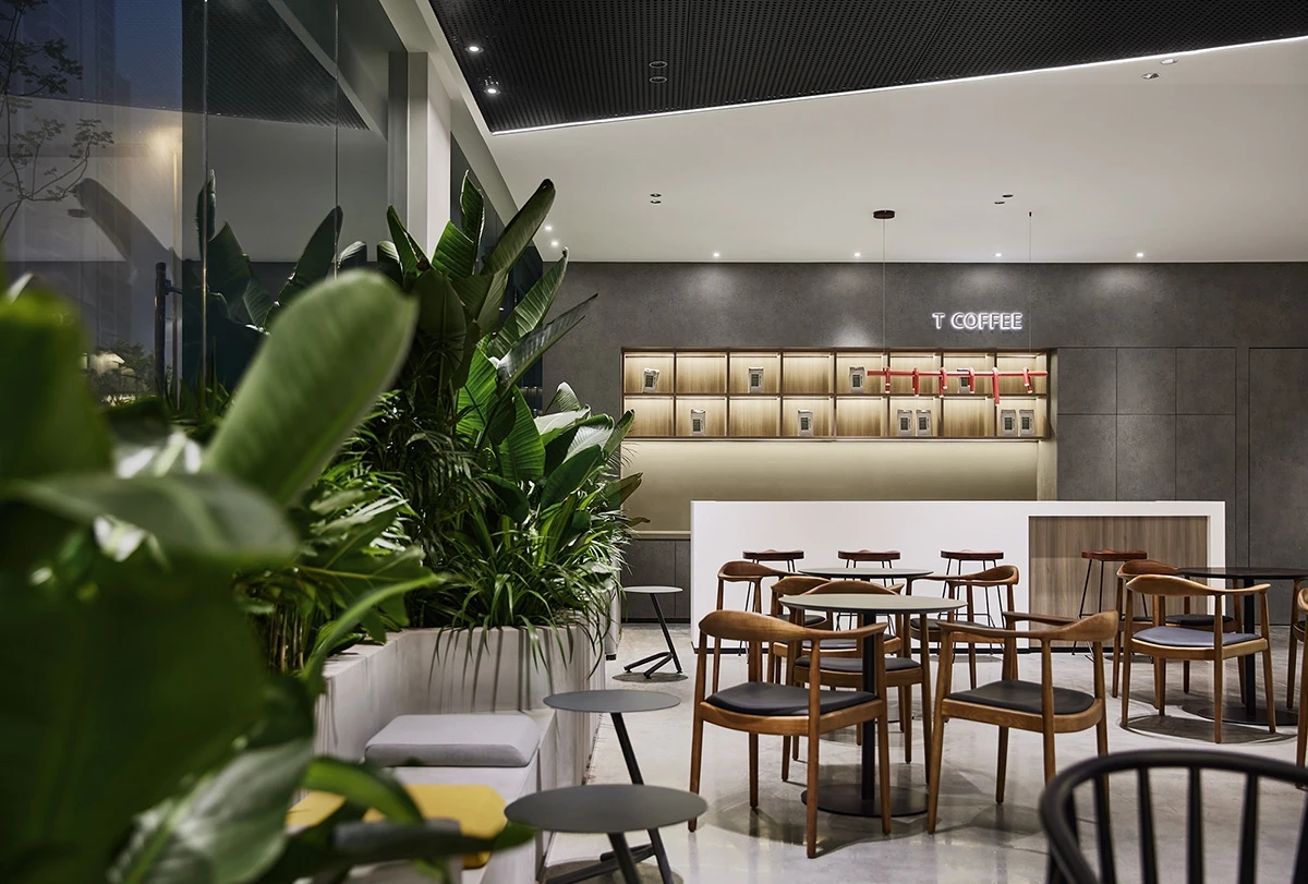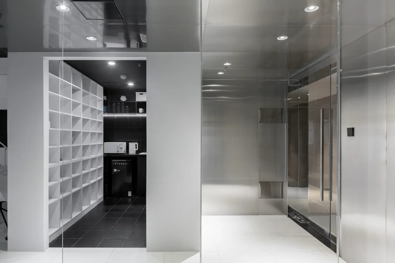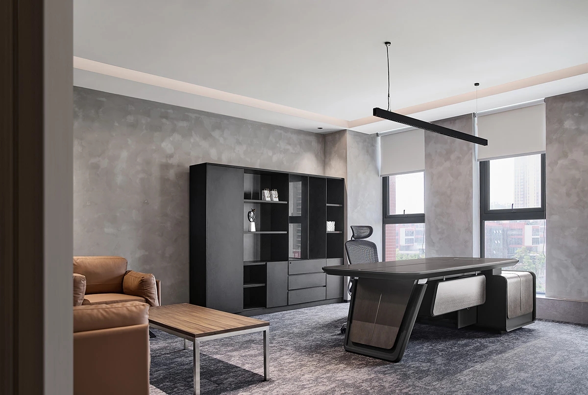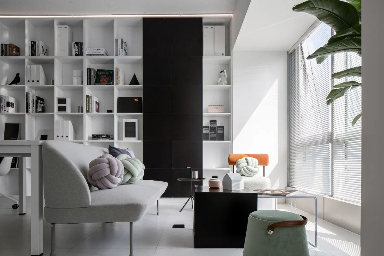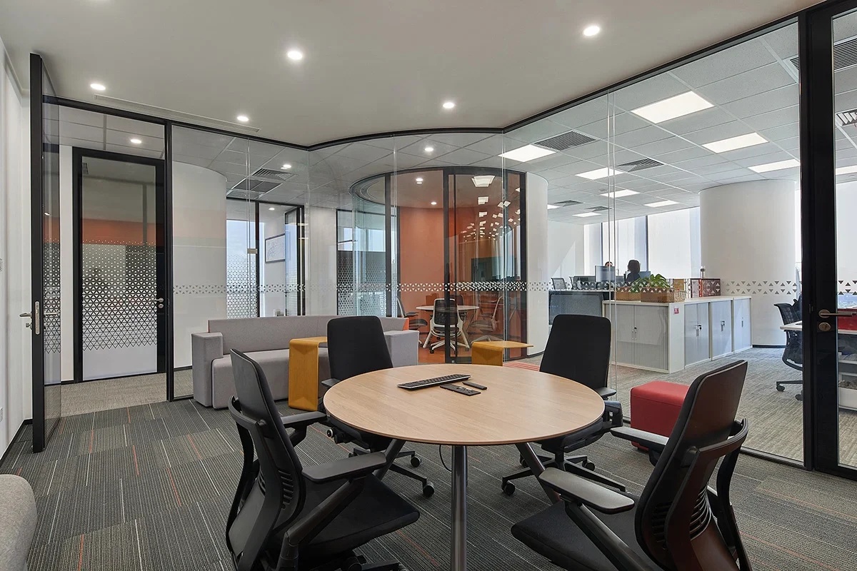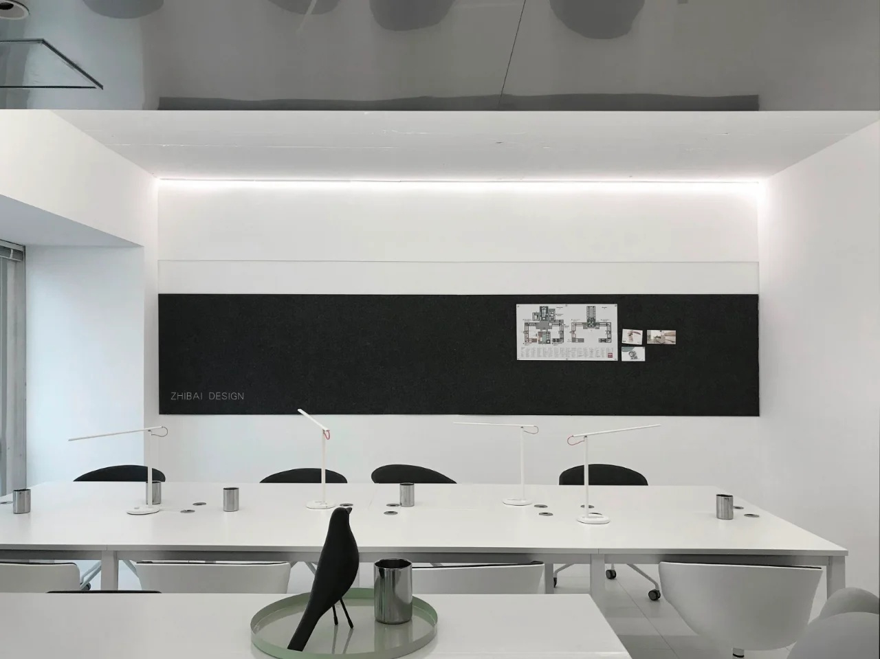 穿过闸机口,进入的是整个轨行区,设计团队意在现场通过火车头、模拟轨道、交通指示灯等打造一个实地操控体验场景,动态化的展示轨道运行的实际控制成果。而在指示办公区则是设计了360°的弧形屏实时更新展示项目进度,将科技元素融入到每一个角落,整个轨行操作区域用黄色的金属元素进行联合点缀,彩色的钢网与深色的裸顶形成色彩对比,从而将视觉重心聚焦到轨道运行区。