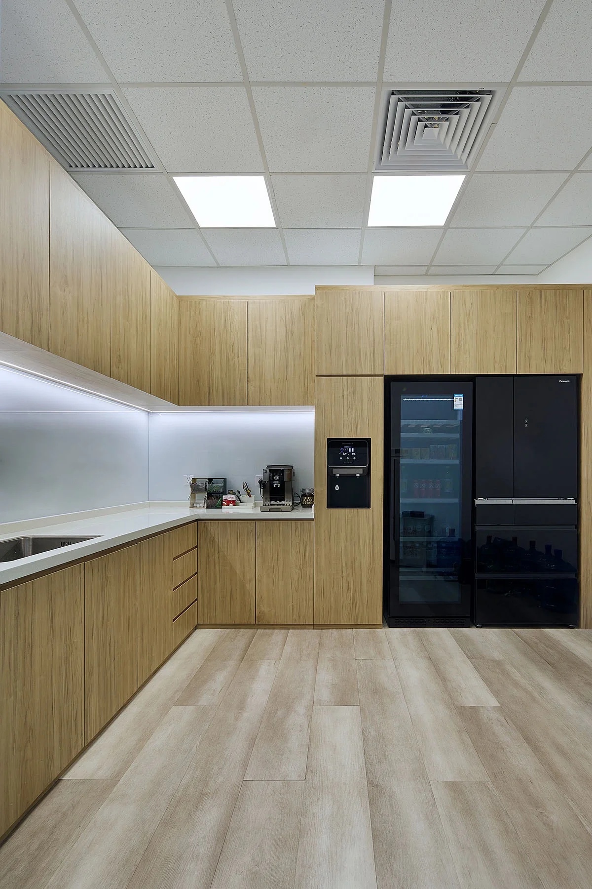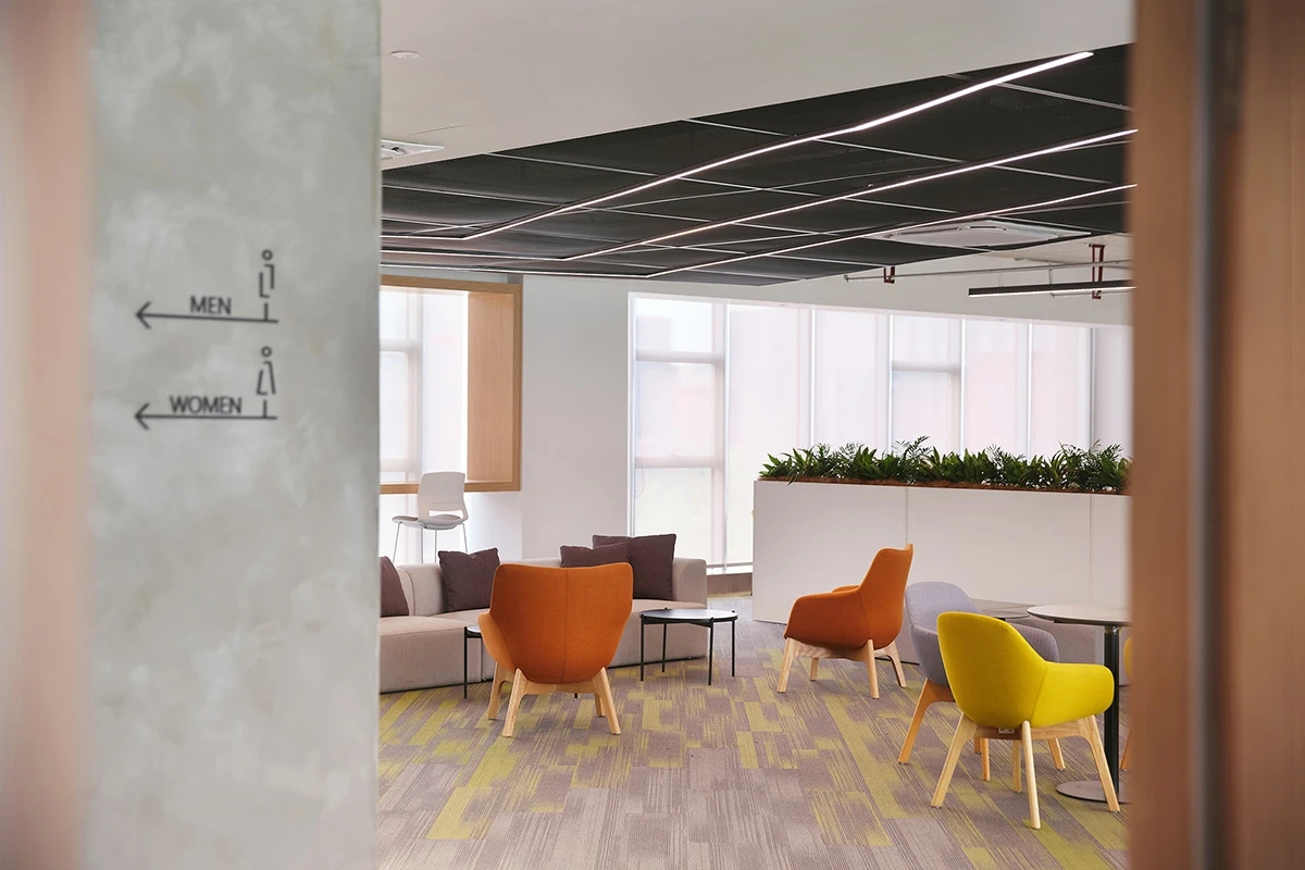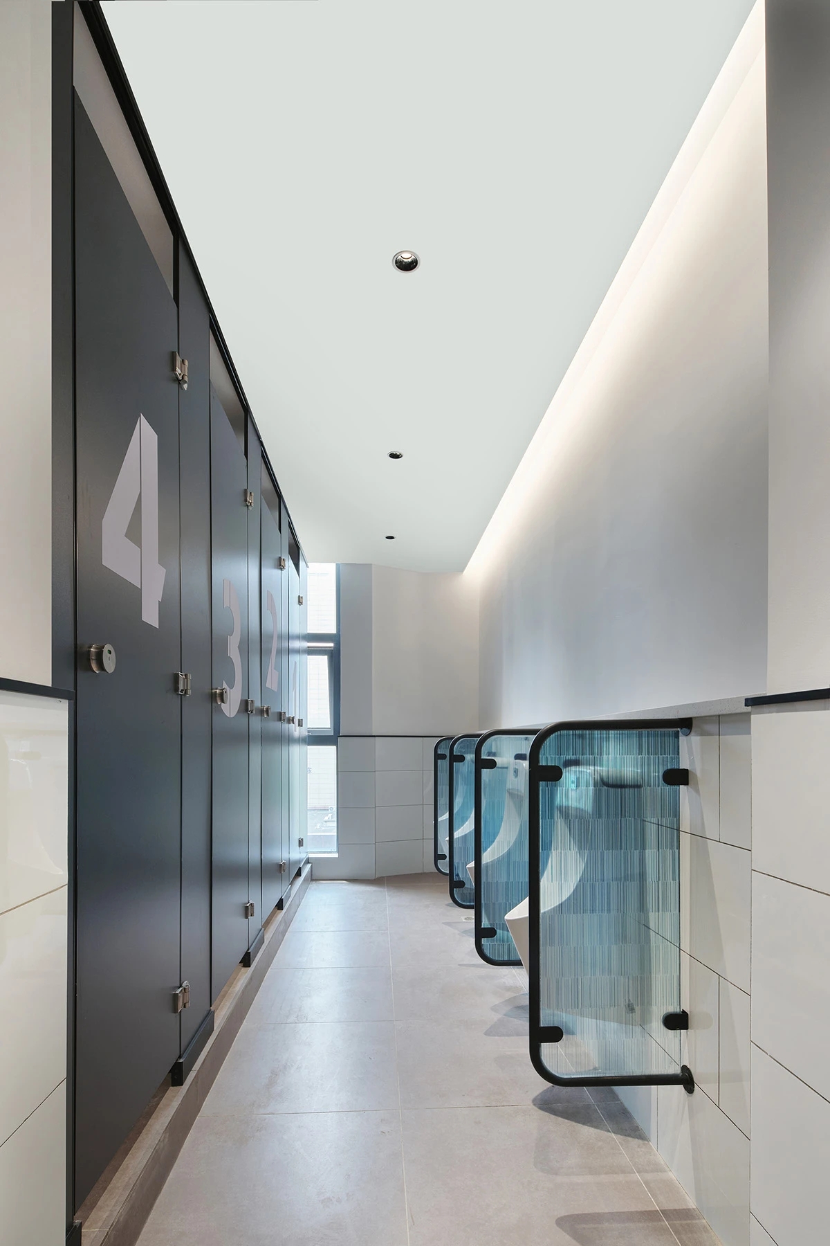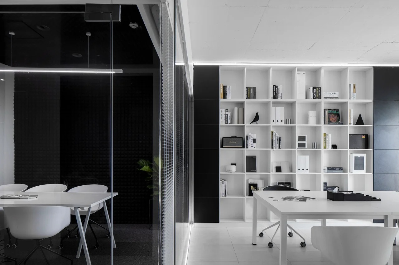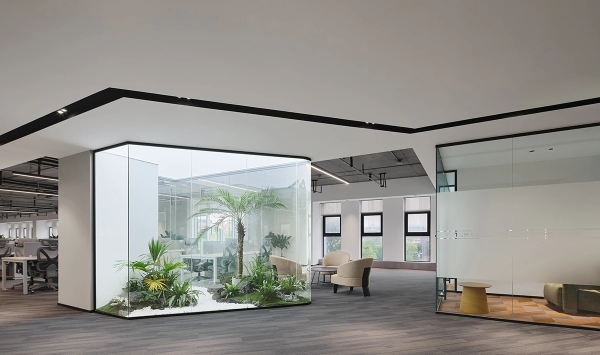 穿过闸机口,进入的是整个轨行区,设计团队意在现场通过火车头、模拟轨道、交通指示灯等打造一个实地操控体验场景,动态化的展示轨道运行的实际控制成果。而在指示办公区则是设计了360°的弧形屏实时更新展示项目进度,将科技元素融入到每一个角落,整个轨行操作区域用黄色的金属元素进行联合点缀,彩色的钢网与深色的裸顶形成色彩对比,从而将视觉重心聚焦到轨道运行区。
