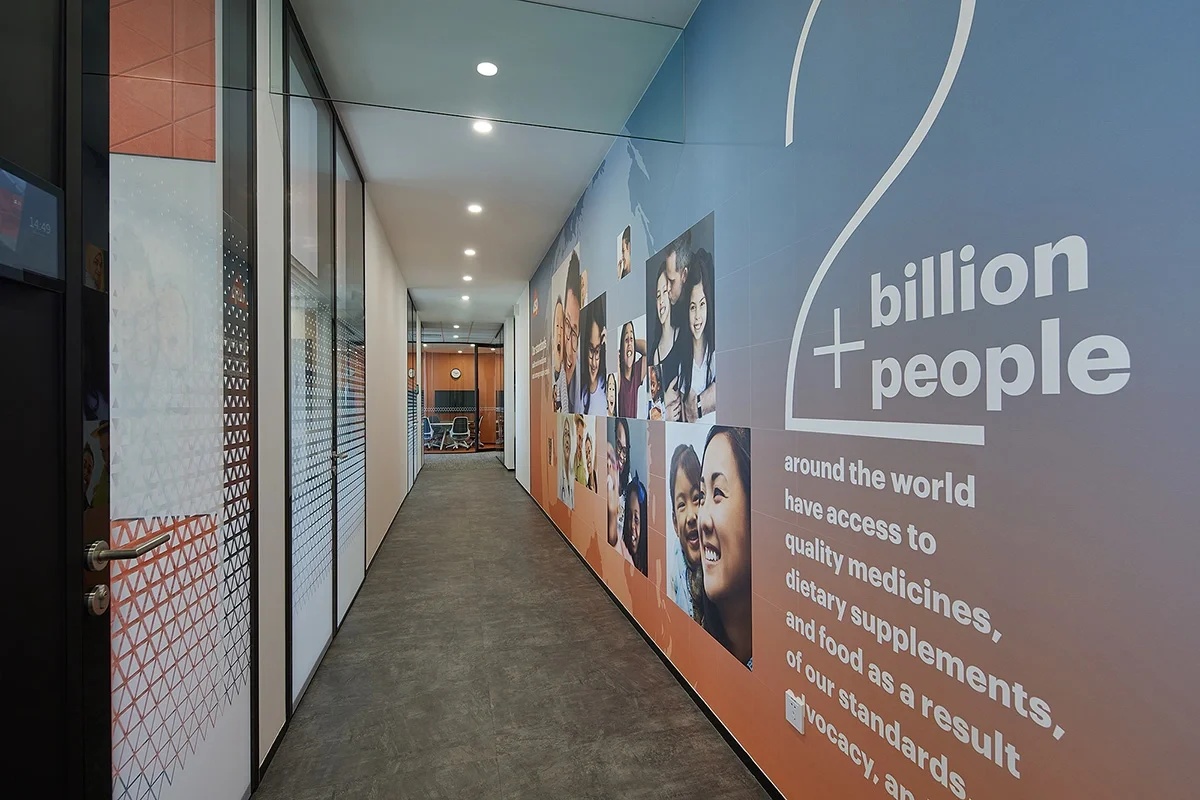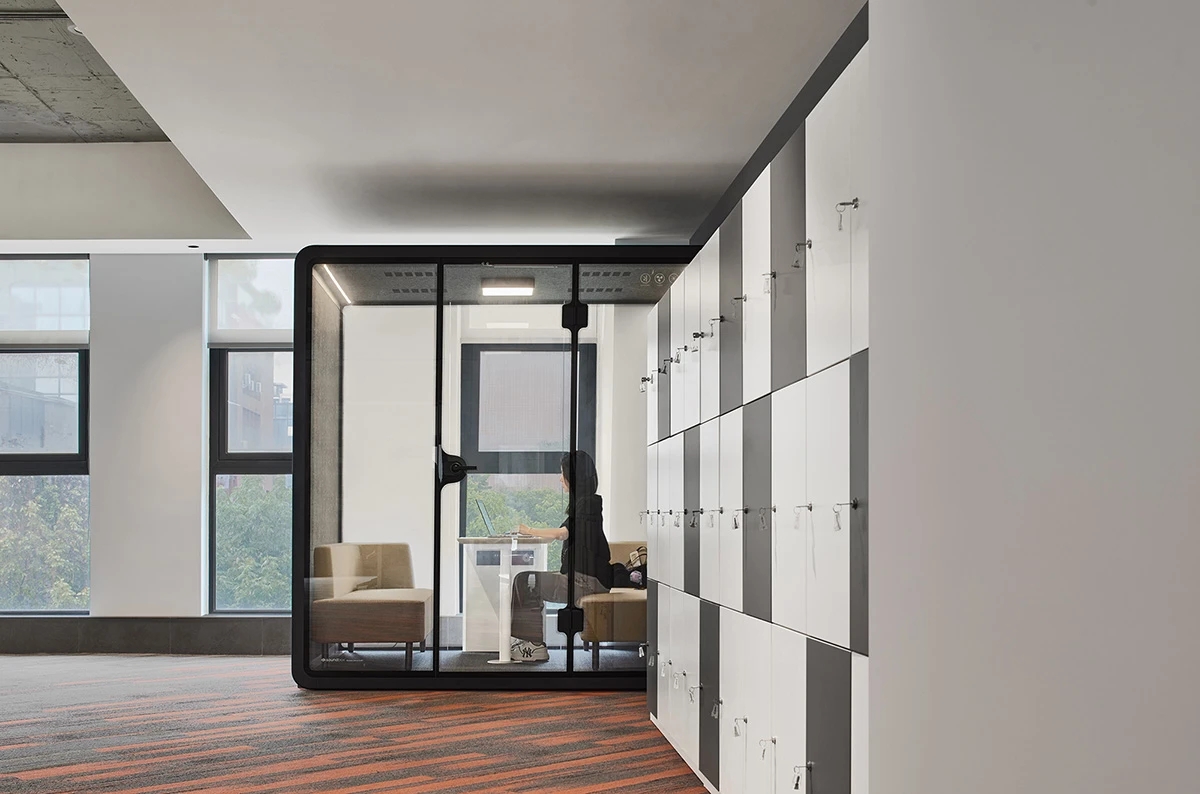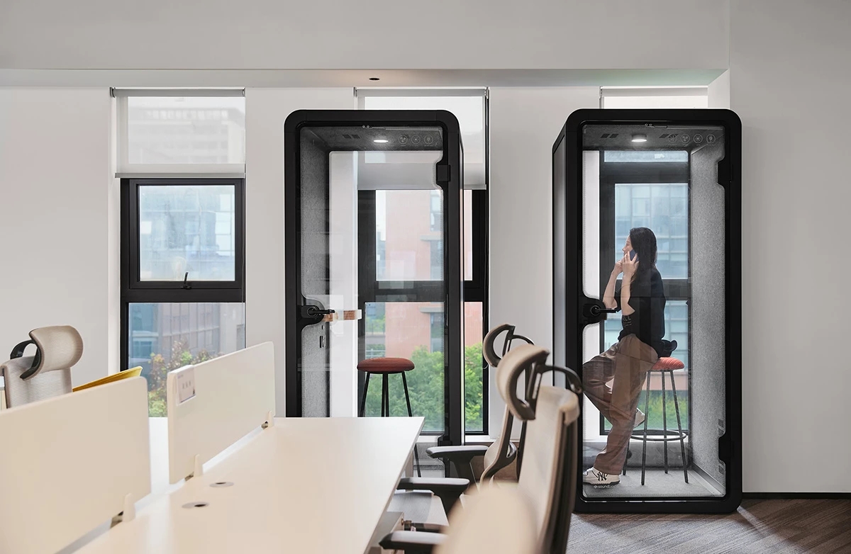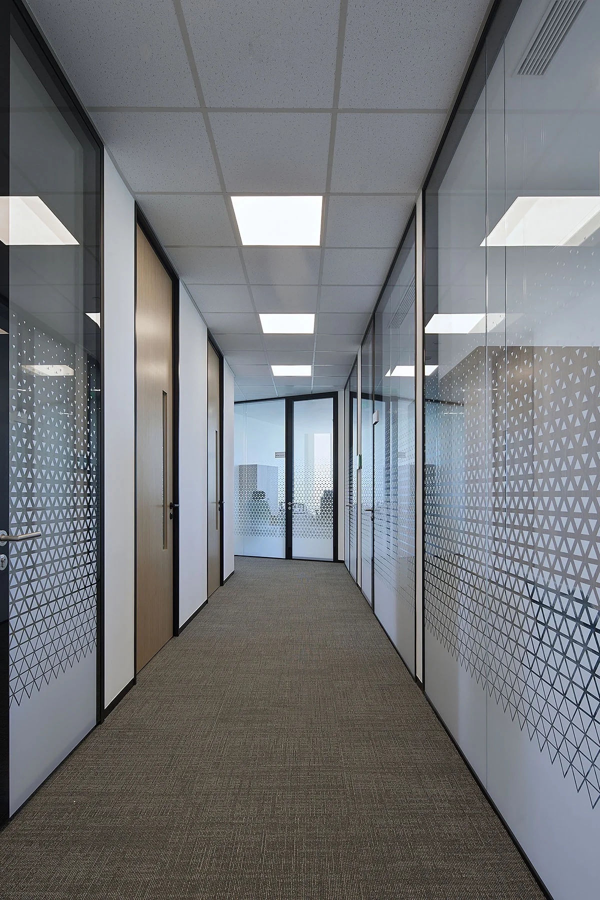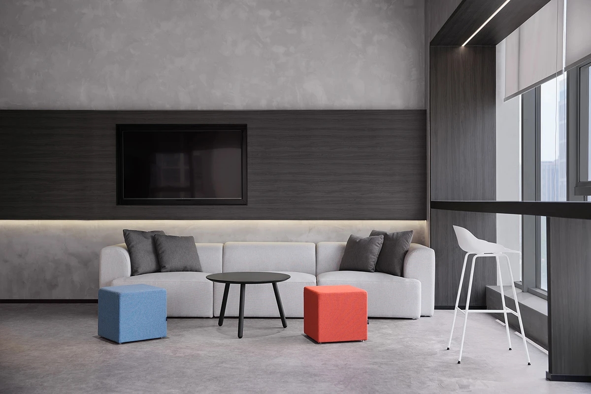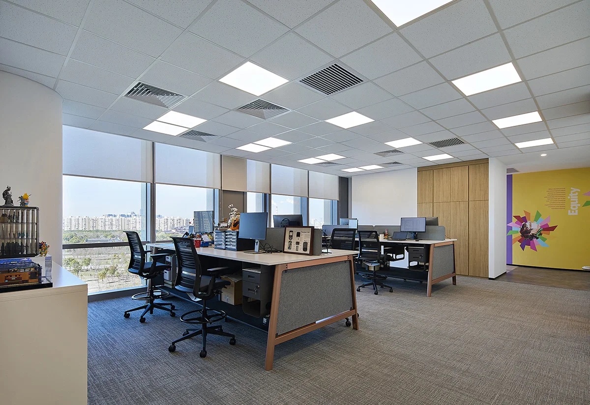 穿过闸机口,进入的是整个轨行区,设计团队意在现场通过火车头、模拟轨道、交通指示灯等打造一个实地操控体验场景,动态化的展示轨道运行的实际控制成果。而在指示办公区则是设计了360°的弧形屏实时更新展示项目进度,将科技元素融入到每一个角落,整个轨行操作区域用黄色的金属元素进行联合点缀,彩色的钢网与深色的裸顶形成色彩对比,从而将视觉重心聚焦到轨道运行区。