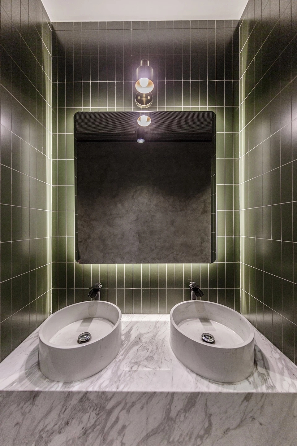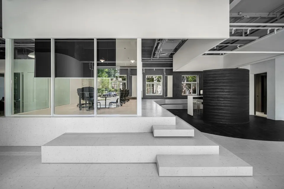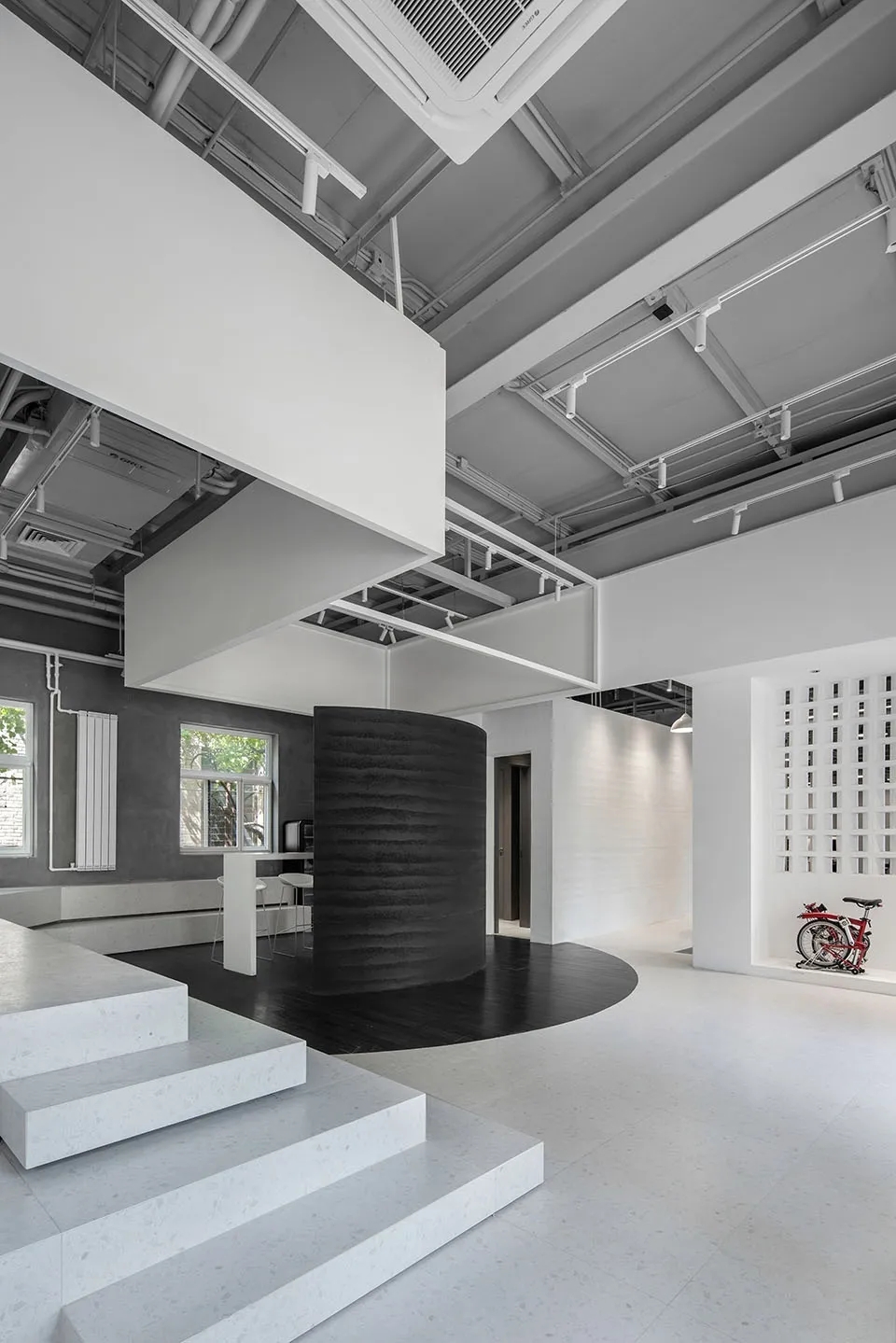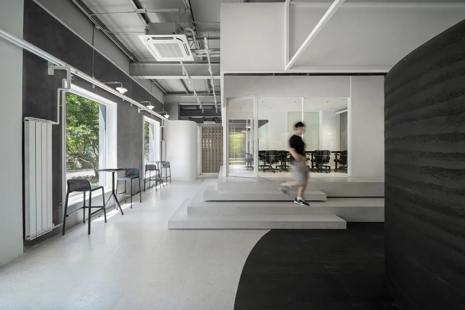由于限制条件,无法大量改造现有墙体,我们通过喷漆和湿贴墙皮将原空间里的混凝土和黑色变为白色。形成明快的底色。布局去掉了围合工位的黑色金属网,或完全开敞,或替换为更厚重的空心砖,增强空间收放的节奏感。