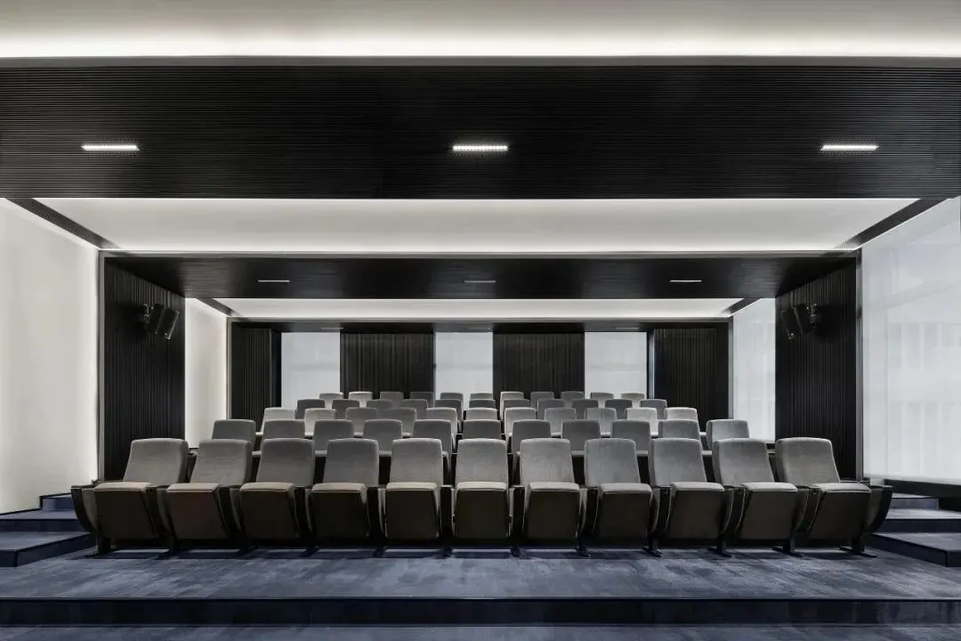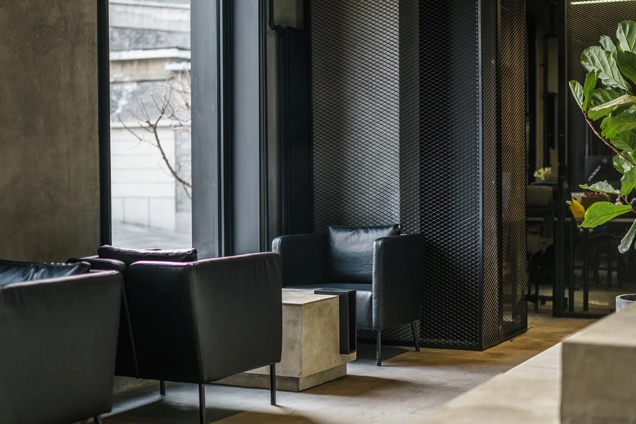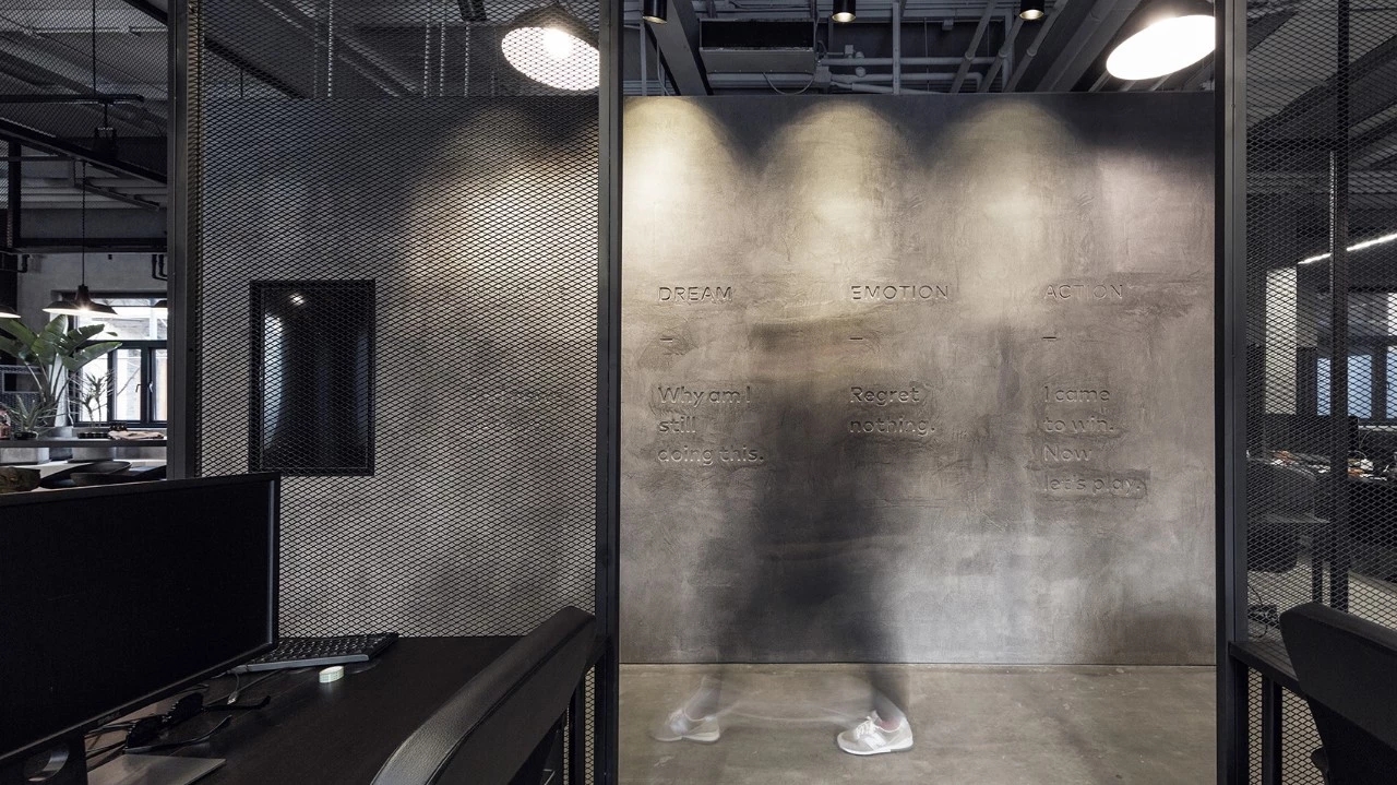 在材质的选择上,为尊重原有的场所精神及企业风格,本案选用了混凝土及金属作为空间的主要材质。地面及墙面均采用混凝土质感的水泥漆及自流平,形成粗粝质朴的空间基调。局部吊顶及工位旁的隔断采用黑色金属网,在不阻隔视线的同时,划分出功能分区并体现空间的序列感和仪式感。