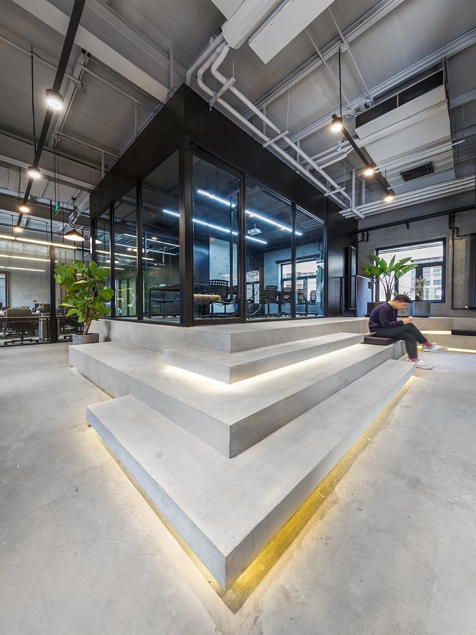 设计师充分利用层高优势,在入口门厅一侧设置坐落在台阶上的会议室,形成令人眼前一亮的视觉亮点。台阶设置坐垫,可作为公共讨论空间的座椅使用,同时座椅往茶水间延伸,将较活跃的公共空间连成一体。
