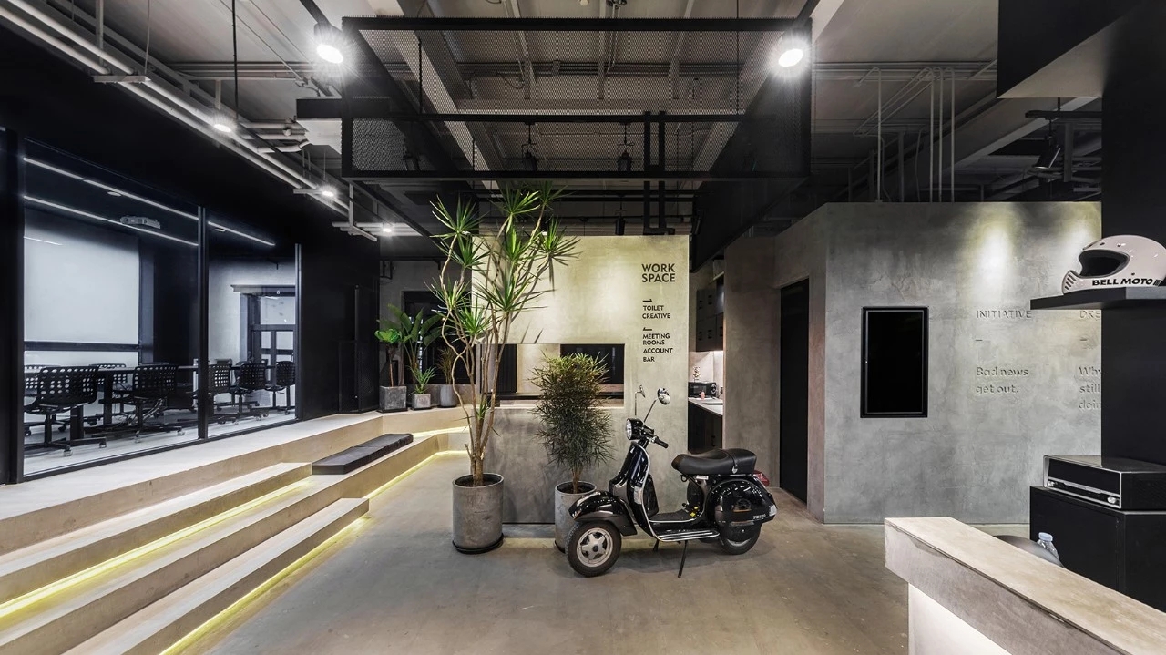 当设计师走进刚拆除平整完毕的施工现场,看到空荡的厂房里留存下的粗粝水泥墙,粗壮钢梁,以及业主停放在场地旁的机车和谐的映入眼帘时,设计师认为:提供一个空间,容纳原有建筑的场所精神,同时让业主的生活方式在其中与场所精神无缝对接并没有痕迹的延续才是这个空间应该有的属性,粗犷锐利的工业风格无疑是最适合这个空间的。