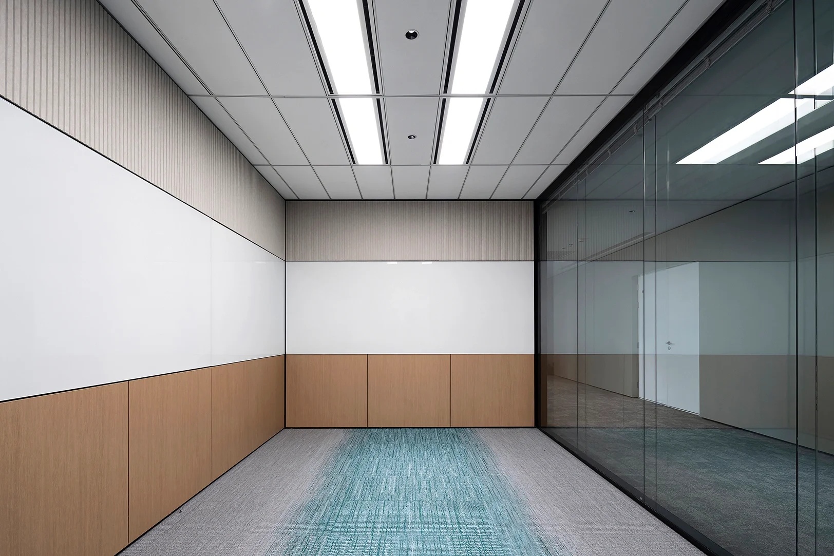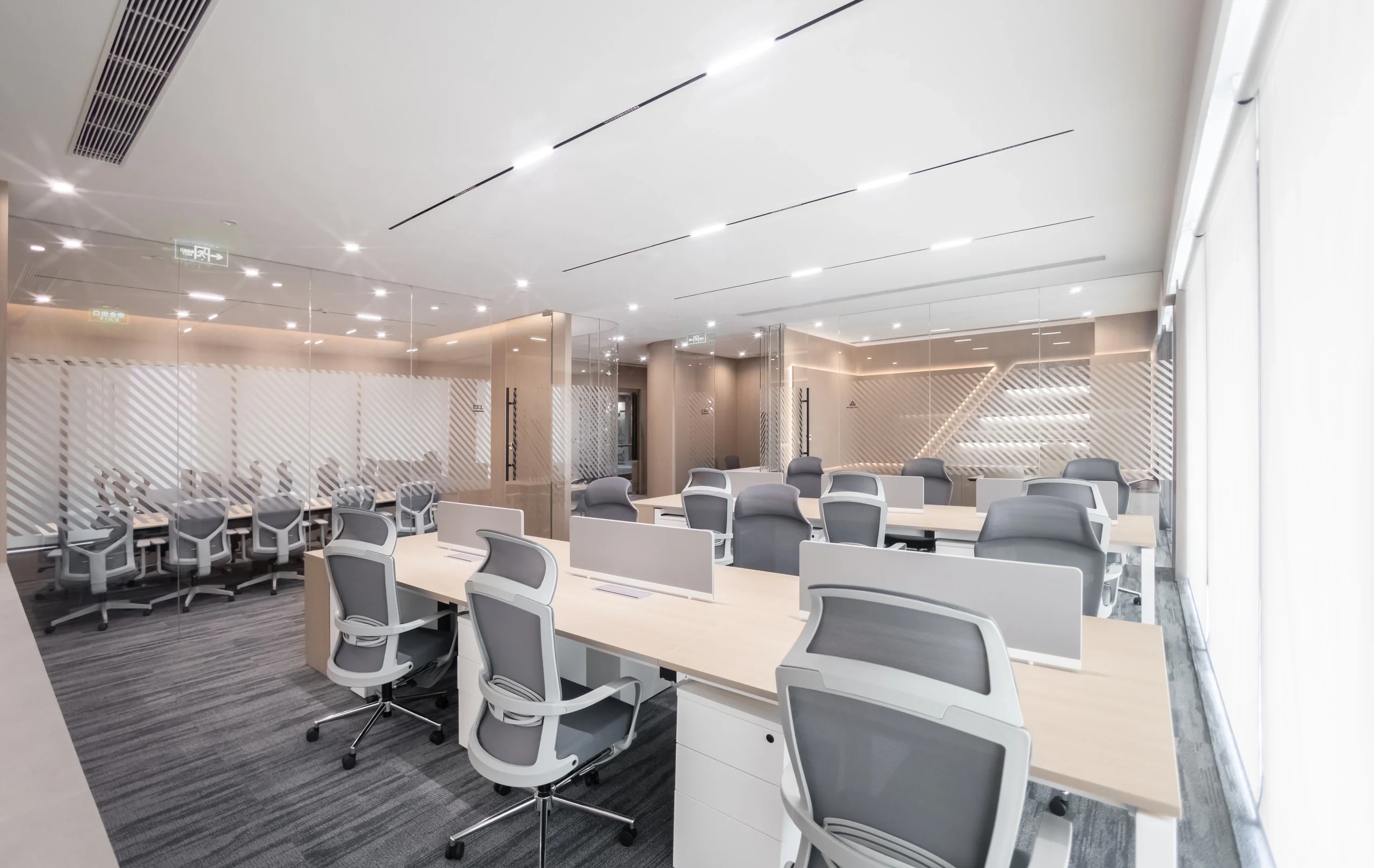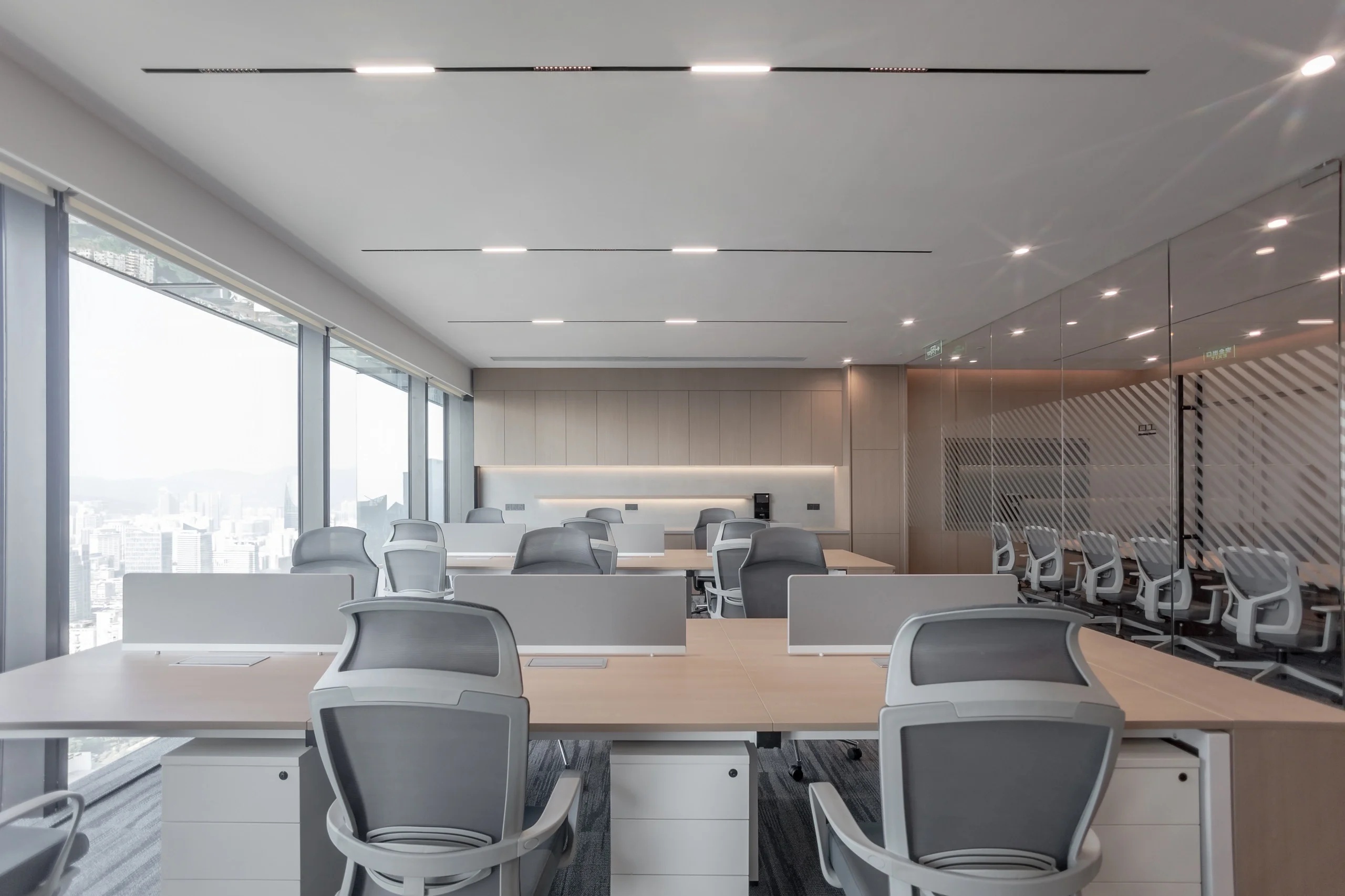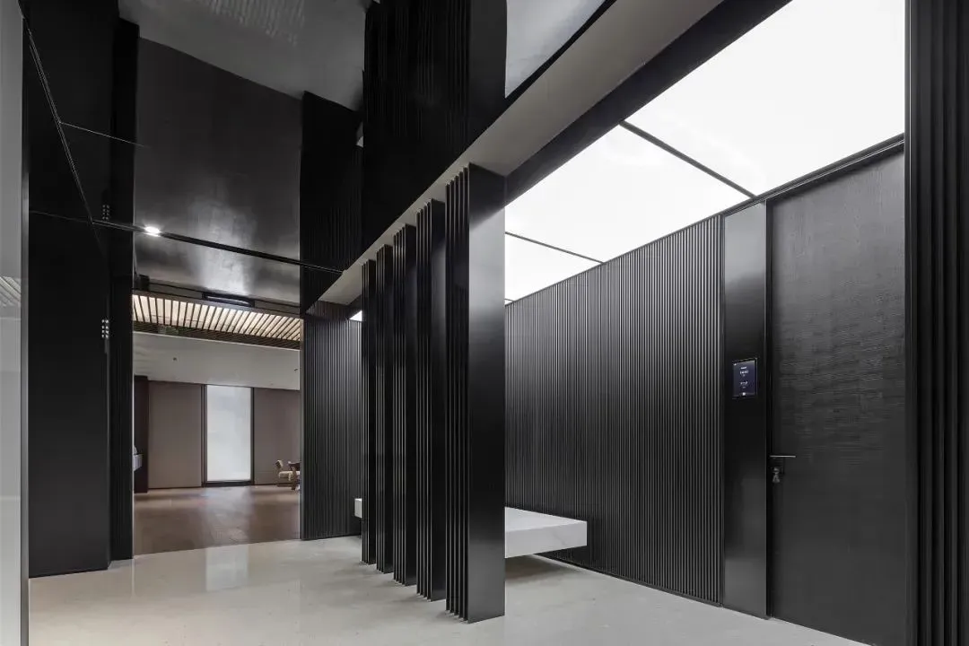 主要交通空间分别采用贴墙布置及居中布置两种方法。紧邻外墙的走道设置洽谈区域,可享用透过巨大落地窗射入的阳光。居中布置的走道为企业精神展示的主要区域,在其一侧及尽头分别设置刻有企业文化标语的水泥企业墙及展示灯具。