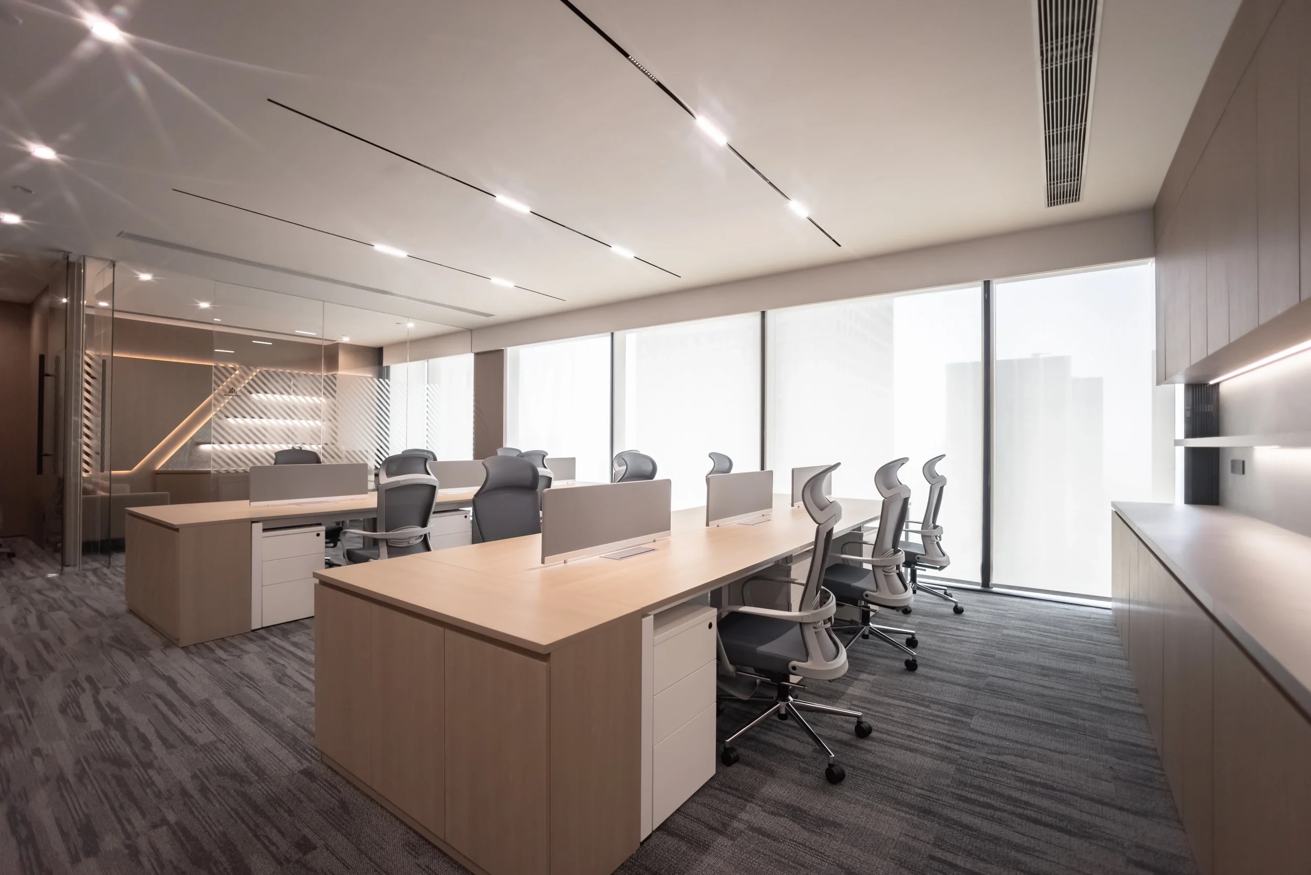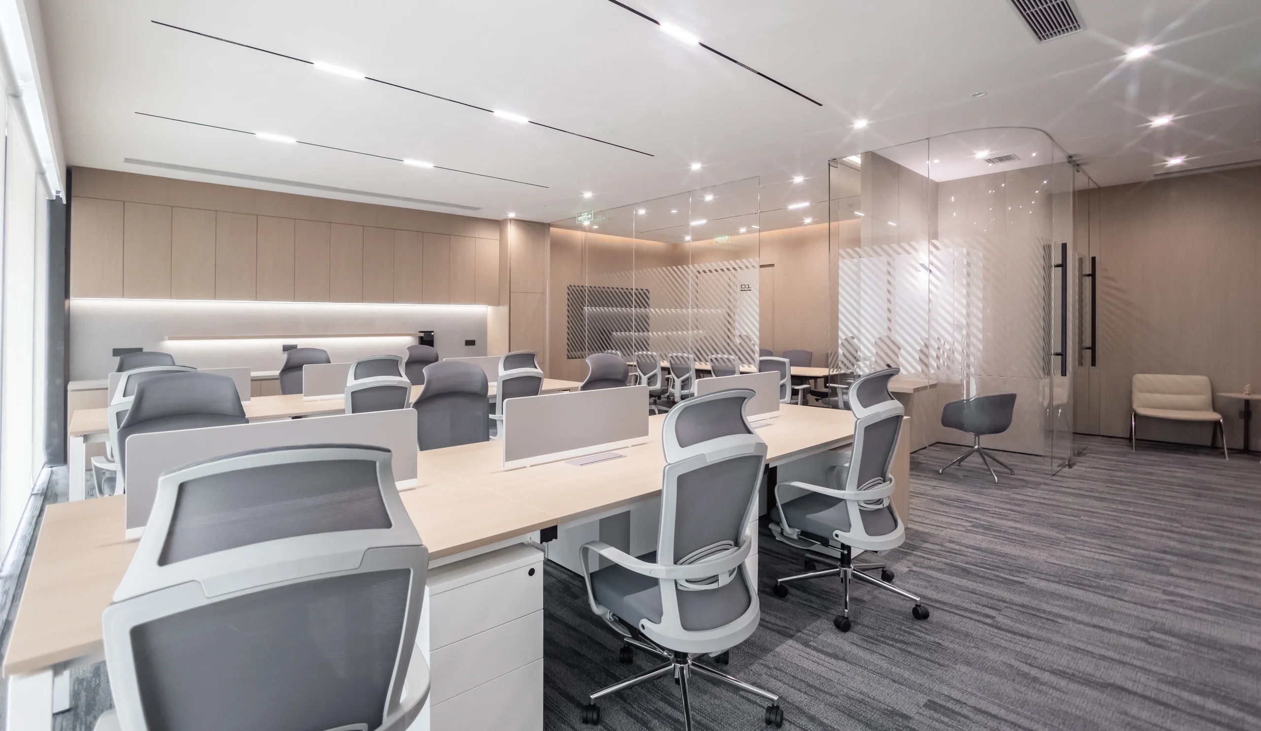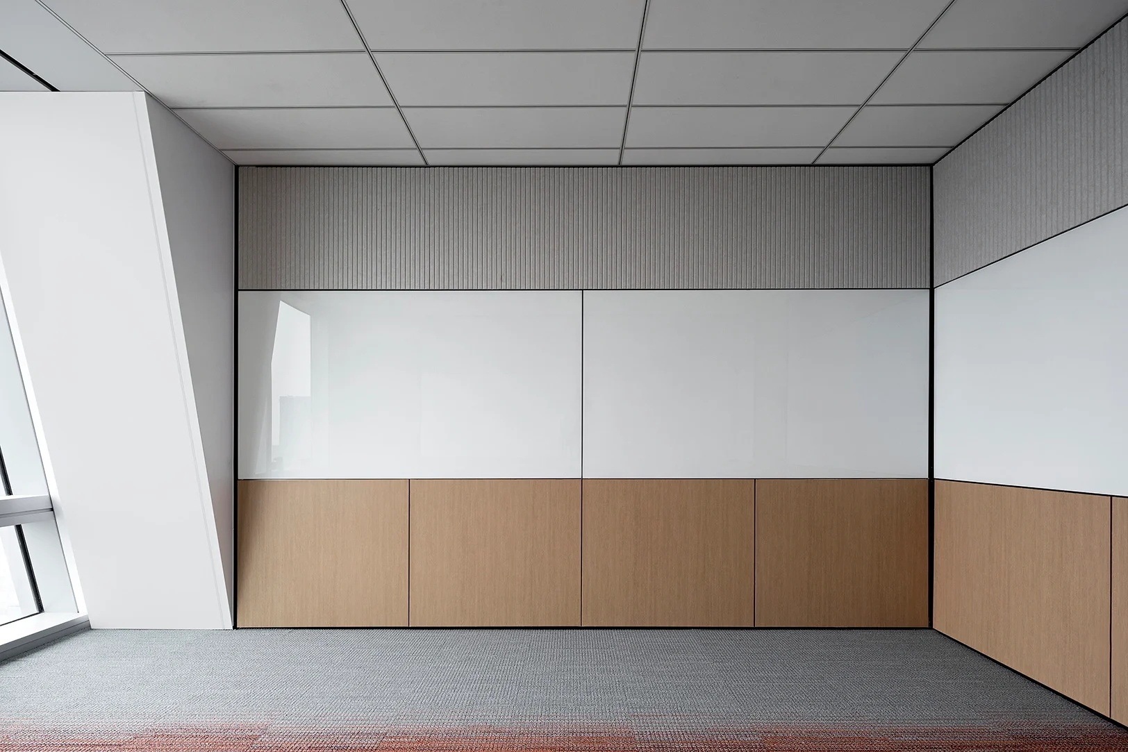 主要交通空间分别采用贴墙布置及居中布置两种方法。紧邻外墙的走道设置洽谈区域,可享用透过巨大落地窗射入的阳光。居中布置的走道为企业精神展示的主要区域,在其一侧及尽头分别设置刻有企业文化标语的水泥企业墙及展示灯具。