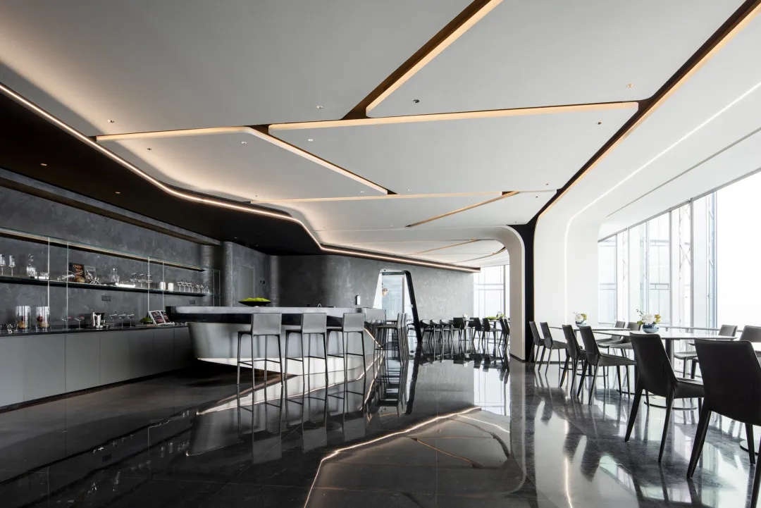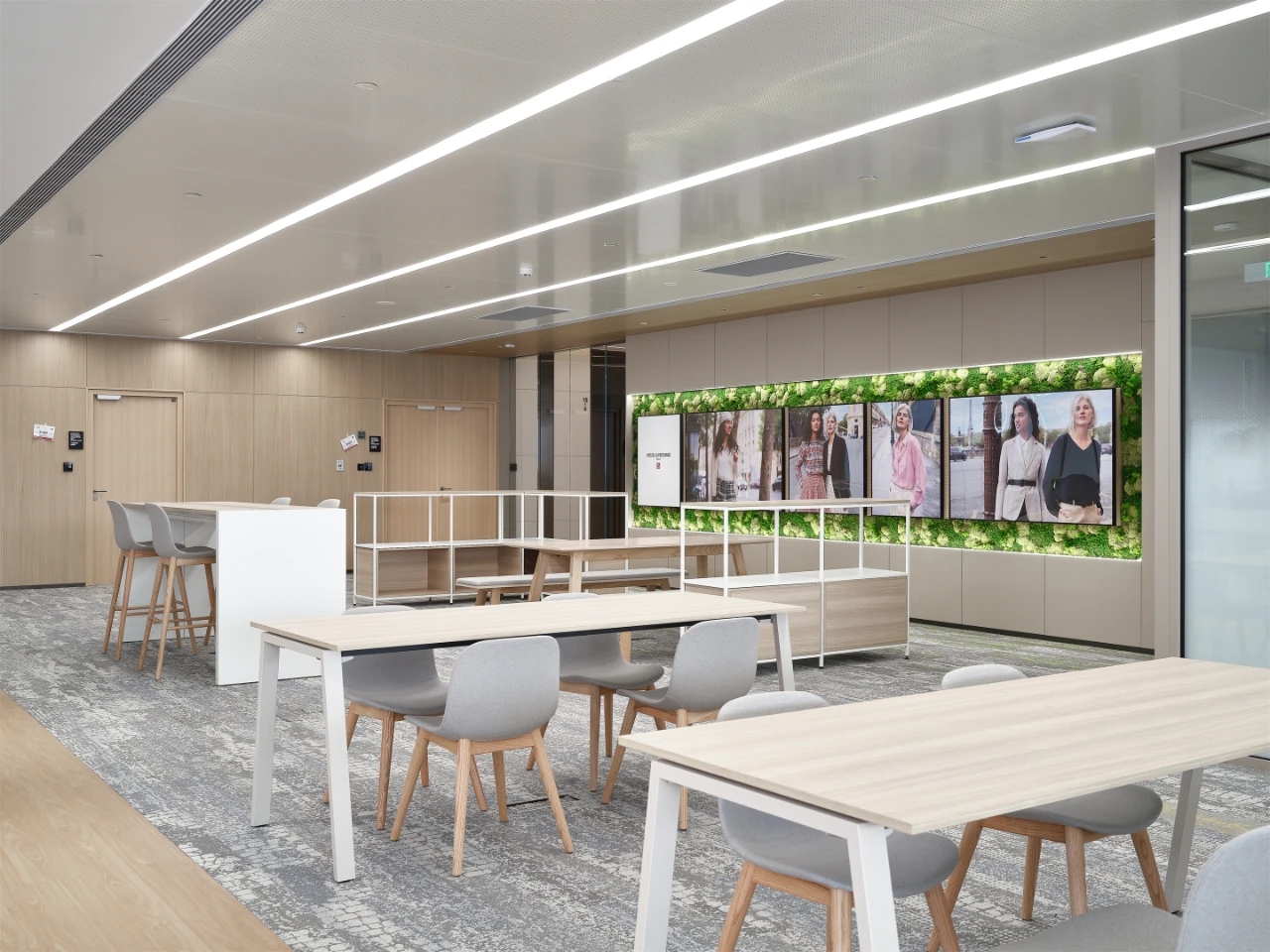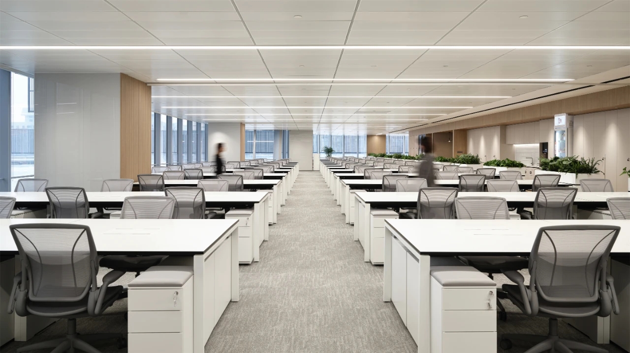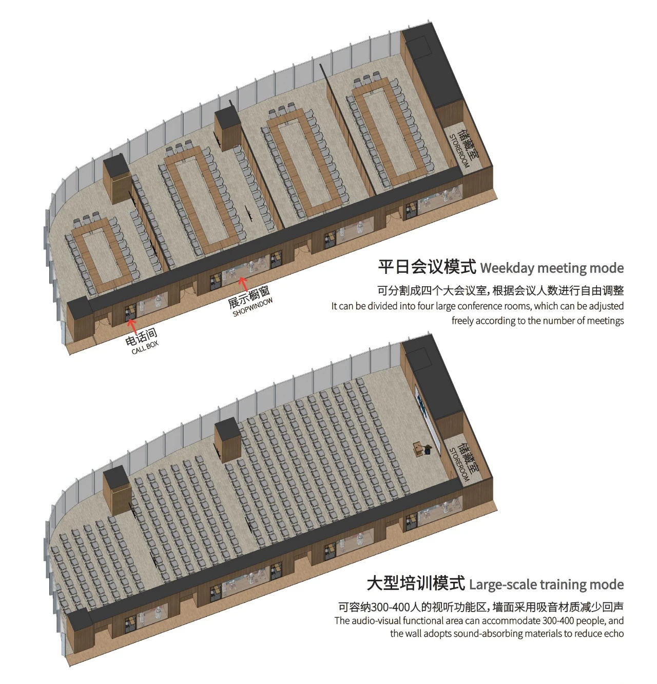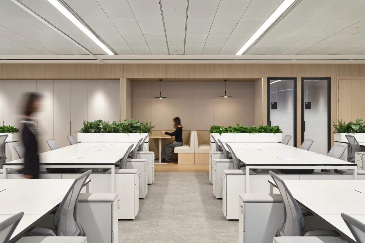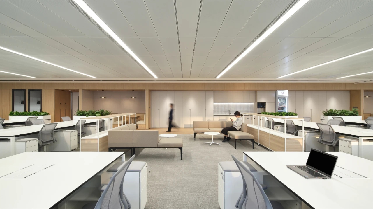 餐厅与培训区之间可联通成“L型”的大研修室,使用时在转角处设置舞台,便创造了可容纳500人的会议或活动场所。同时也可单独作为可容纳300人的培训室,平日则可分隔为大、中、小三种容量的会议空间供员工使用。东西侧则是大面积标准办公区域,采用大量木质面材装饰并点缀绿植,结合充足窗景和采光,为日常紧凑的工作节奏注入舒适和平衡元素,创造了满是精神和活力的氛围感。
