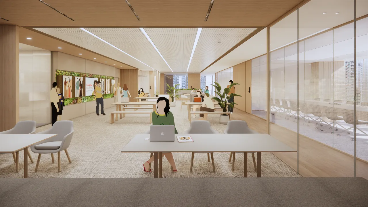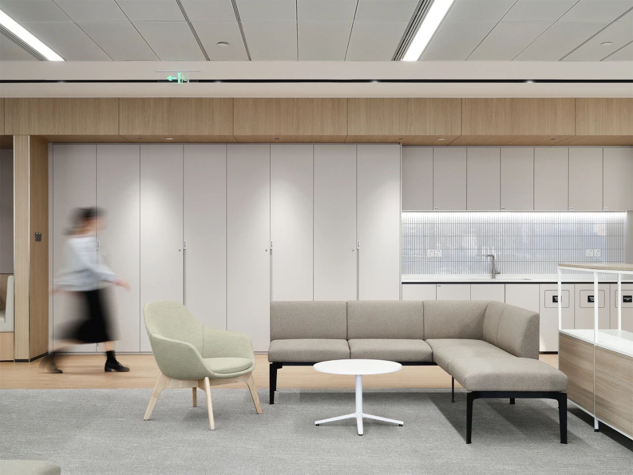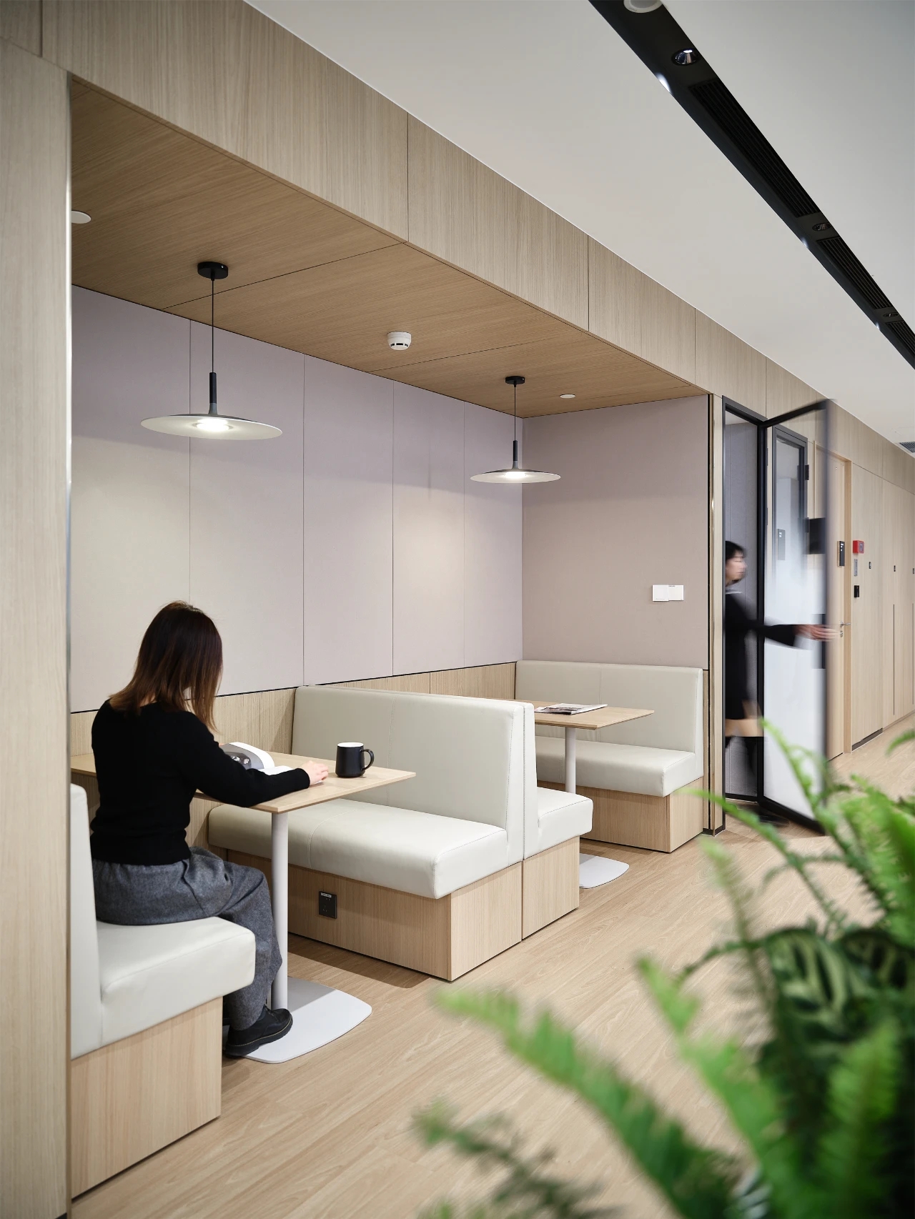 作为办公区软隔断的交流区域,将方便员工灵活沟通,同时也不破坏办公区所营造的专注感。而利用交流空间开放的特性,部门可在此展示部门成果或设置员工感谢墙,营造空间归属感,作为维系员工、部门之间情感的作用。
