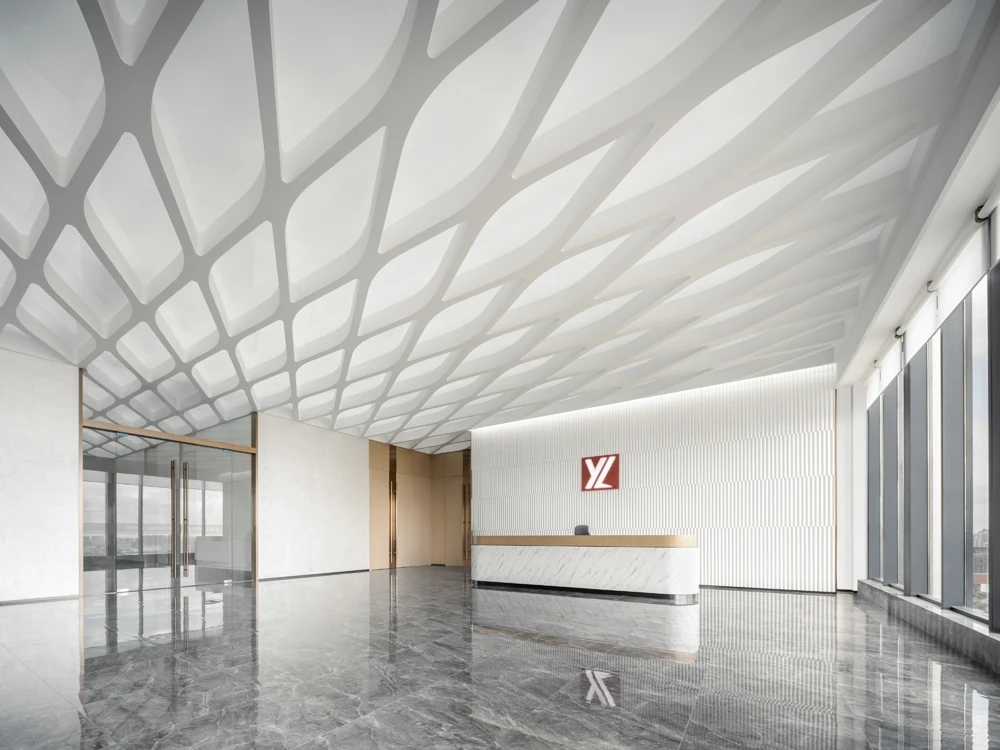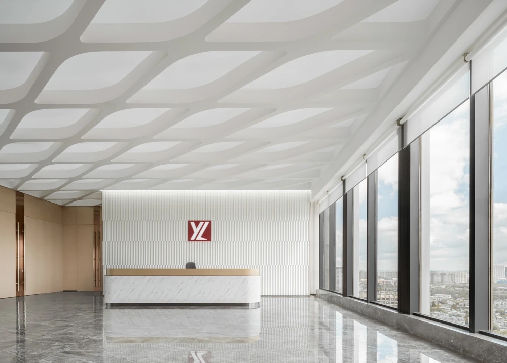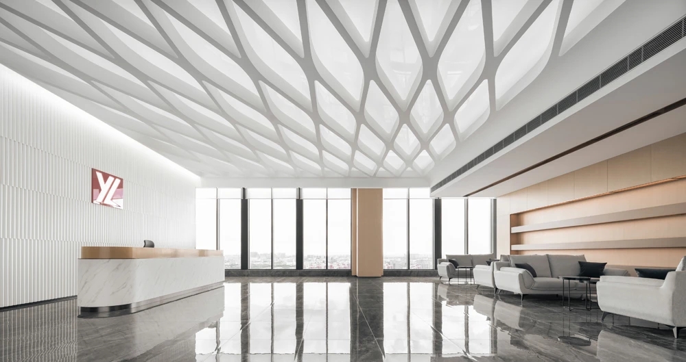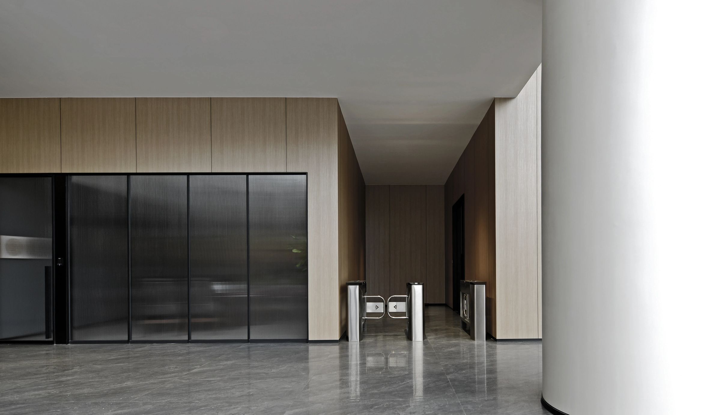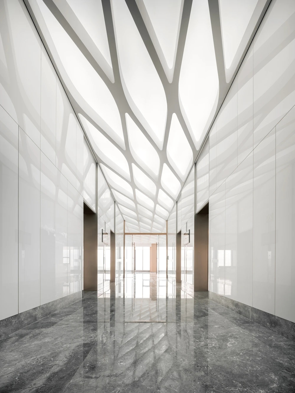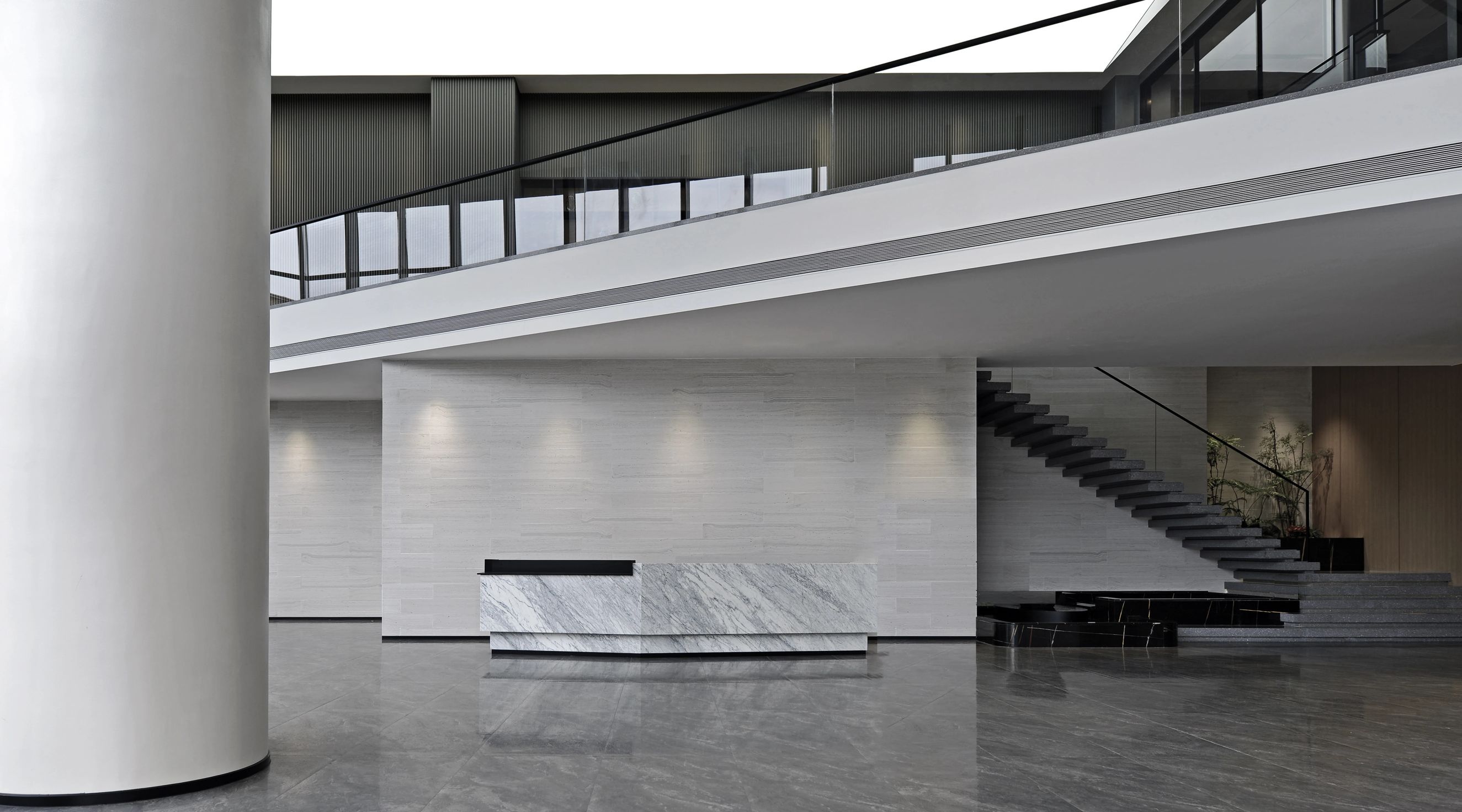 建筑空间被核心筒贯穿形成环形动线,根据空间机能演变为接待、办公两个内部环线,提供了最便捷的空间体验。建筑层高东高西低,且东侧拥有开阔视野。于是,由一个造型新颖的天花结构将人向东侧大堂引导,开放创新的国际化品牌印象随之呈现。内部空间融合了精湛的工艺及高雅的陈设布置,营造出稳重大气的企业专业形象。