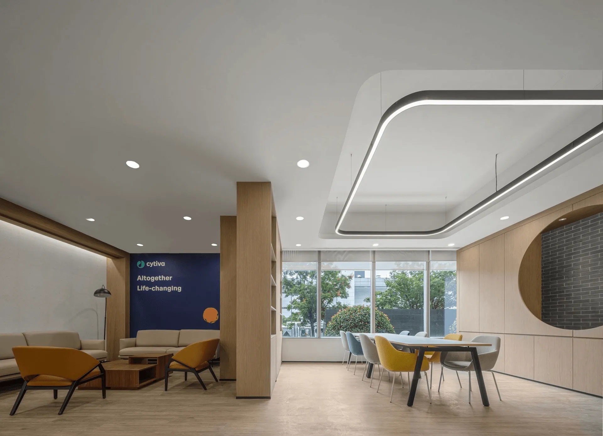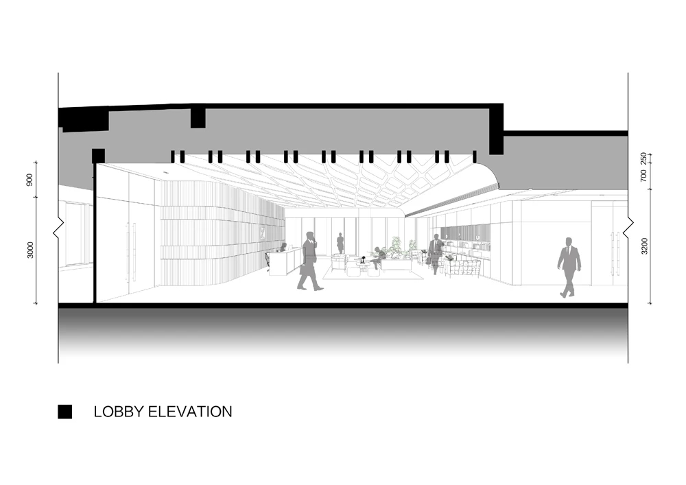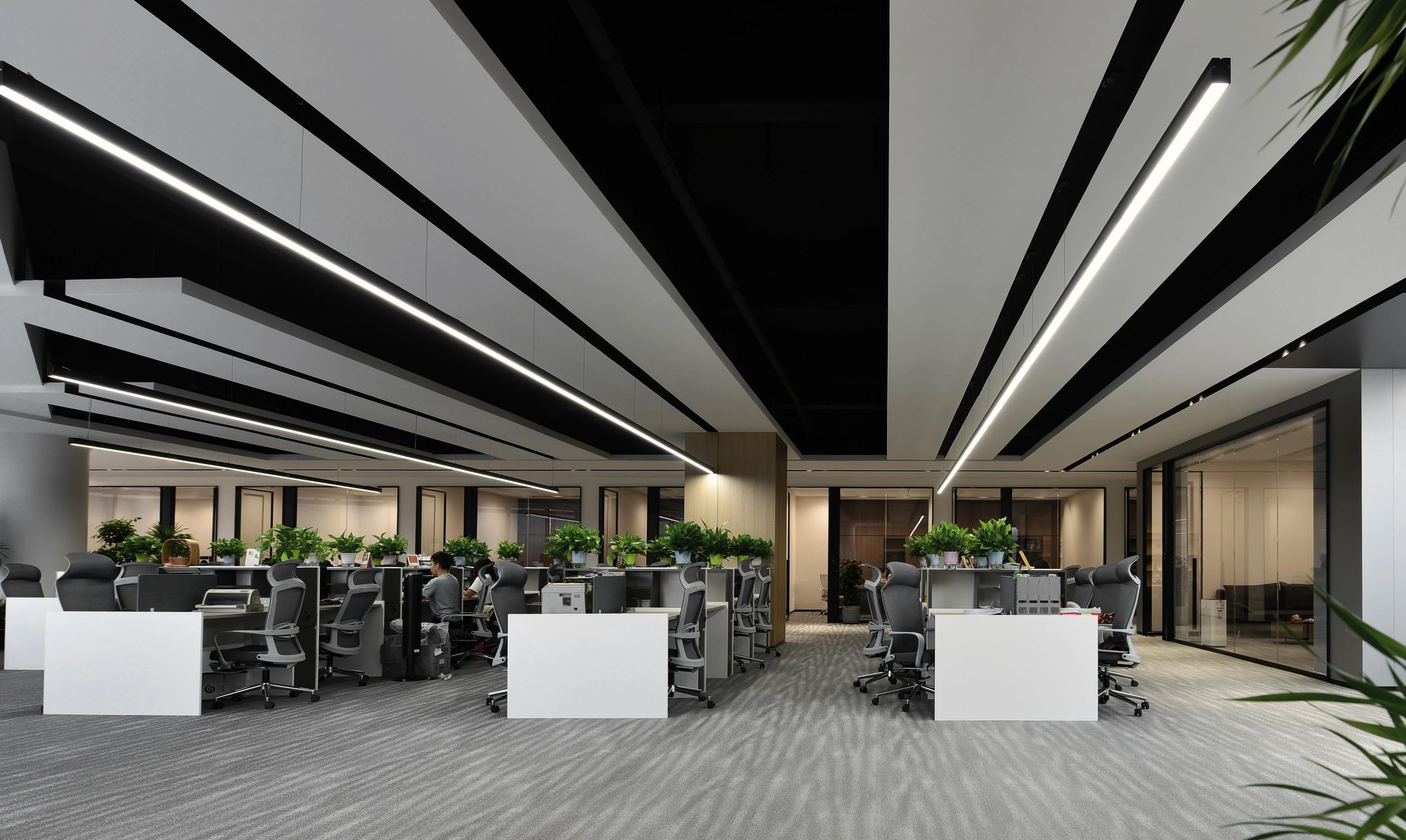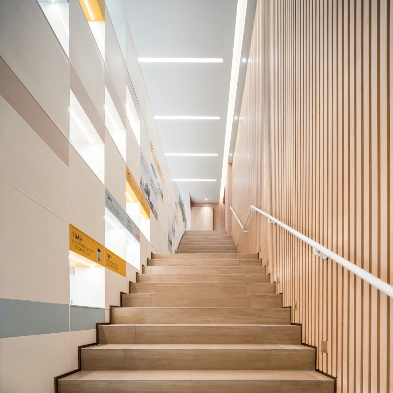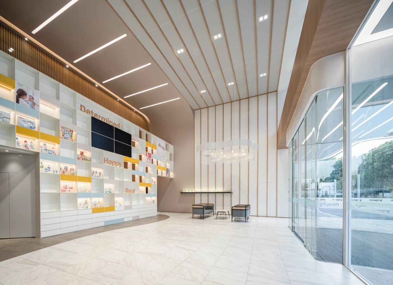 建筑空间被核心筒贯穿形成环形动线,根据空间机能演变为接待、办公两个内部环线,提供了最便捷的空间体验。建筑层高东高西低,且东侧拥有开阔视野。于是,由一个造型新颖的天花结构将人向东侧大堂引导,开放创新的国际化品牌印象随之呈现。内部空间融合了精湛的工艺及高雅的陈设布置,营造出稳重大气的企业专业形象。