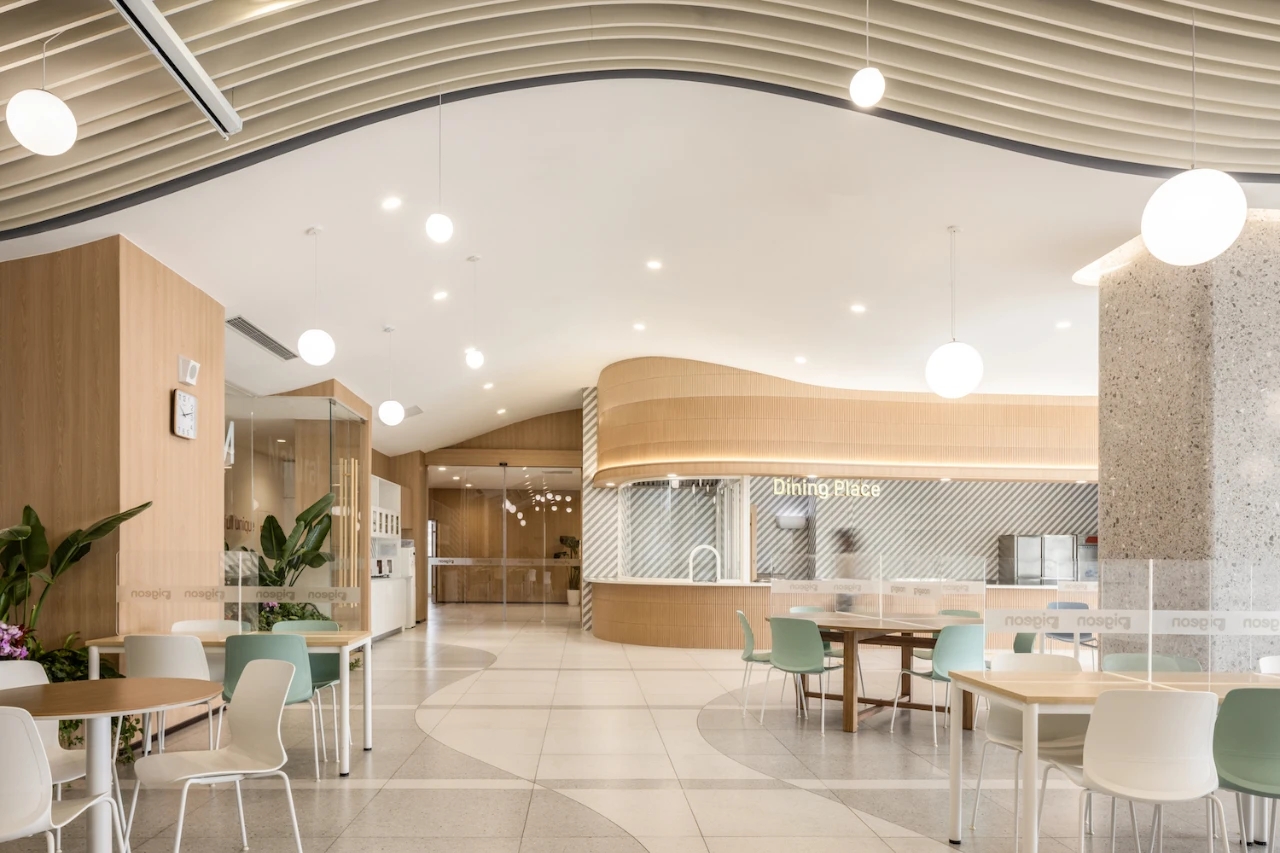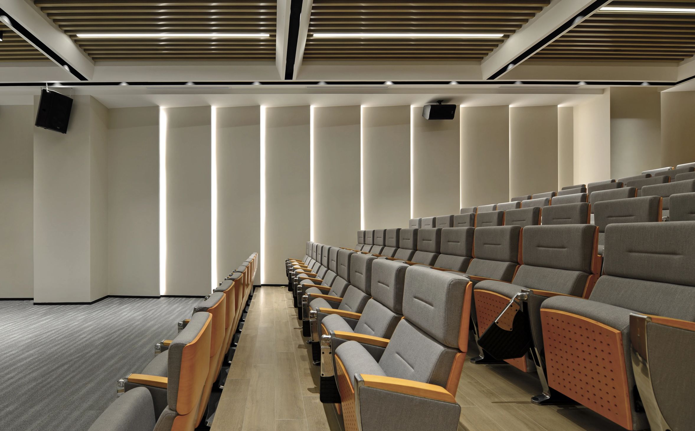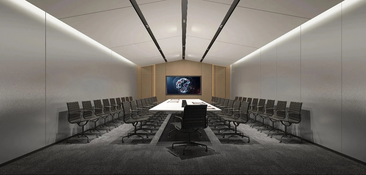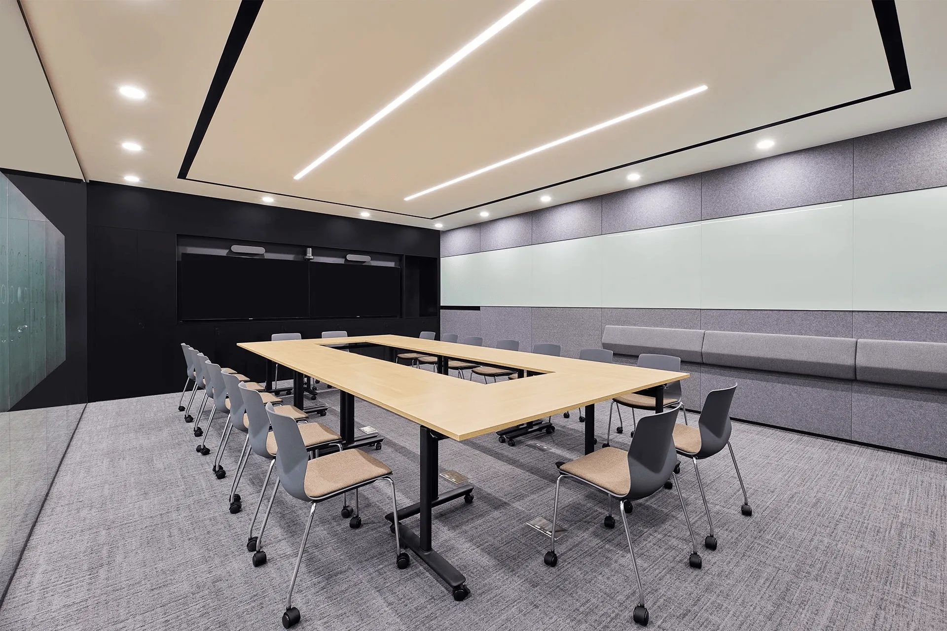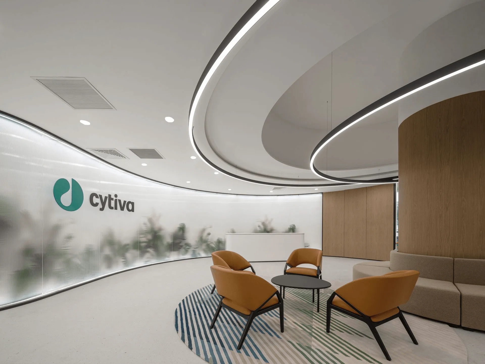 建筑空间被核心筒贯穿形成环形动线,根据空间机能演变为接待、办公两个内部环线,提供了最便捷的空间体验。建筑层高东高西低,且东侧拥有开阔视野。于是,由一个造型新颖的天花结构将人向东侧大堂引导,开放创新的国际化品牌印象随之呈现。内部空间融合了精湛的工艺及高雅的陈设布置,营造出稳重大气的企业专业形象。