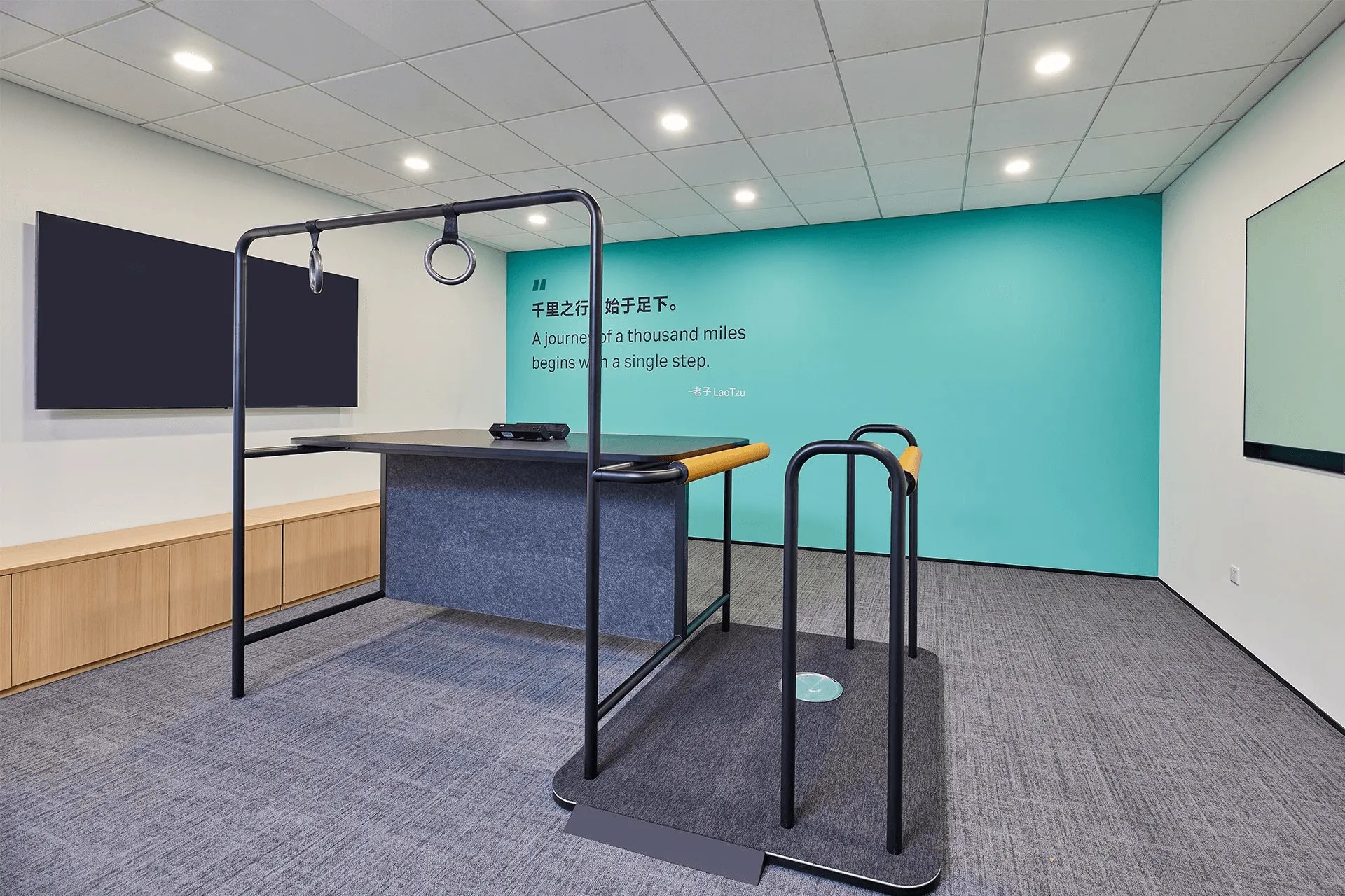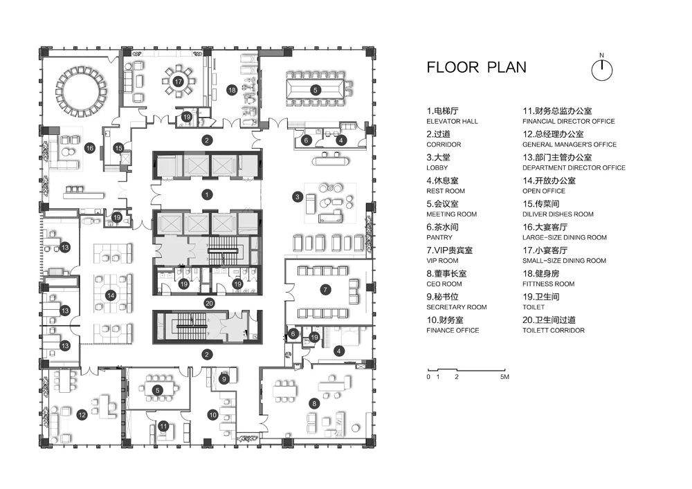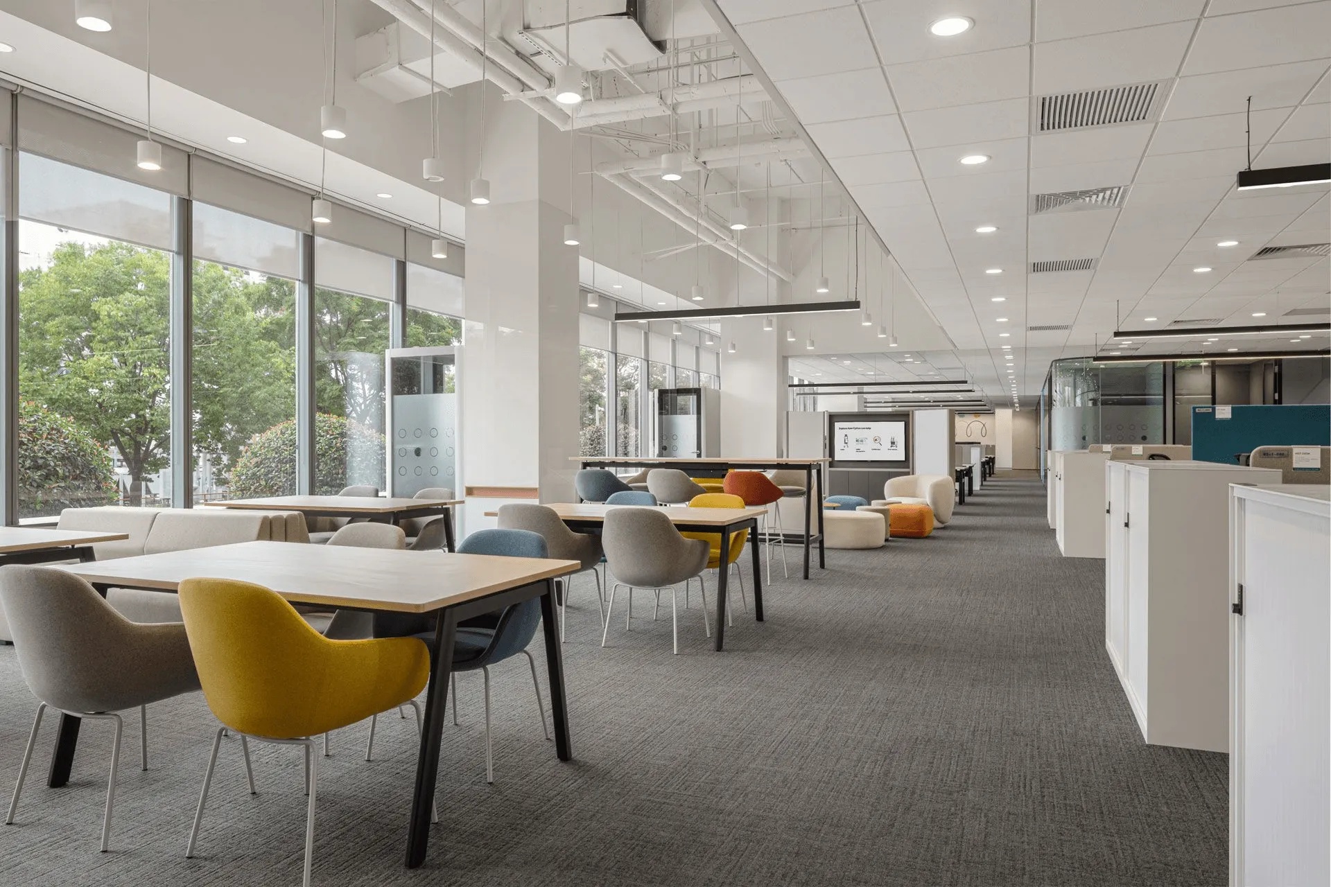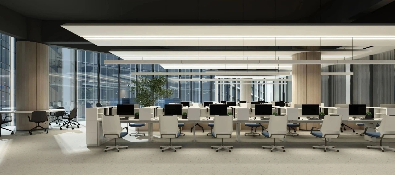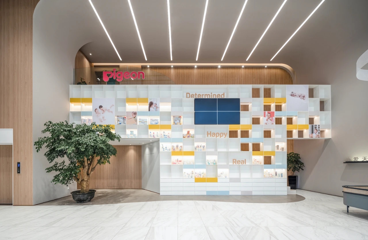 建筑空间被核心筒贯穿形成环形动线,根据空间机能演变为接待、办公两个内部环线,提供了最便捷的空间体验。建筑层高东高西低,且东侧拥有开阔视野。于是,由一个造型新颖的天花结构将人向东侧大堂引导,开放创新的国际化品牌印象随之呈现。内部空间融合了精湛的工艺及高雅的陈设布置,营造出稳重大气的企业专业形象。